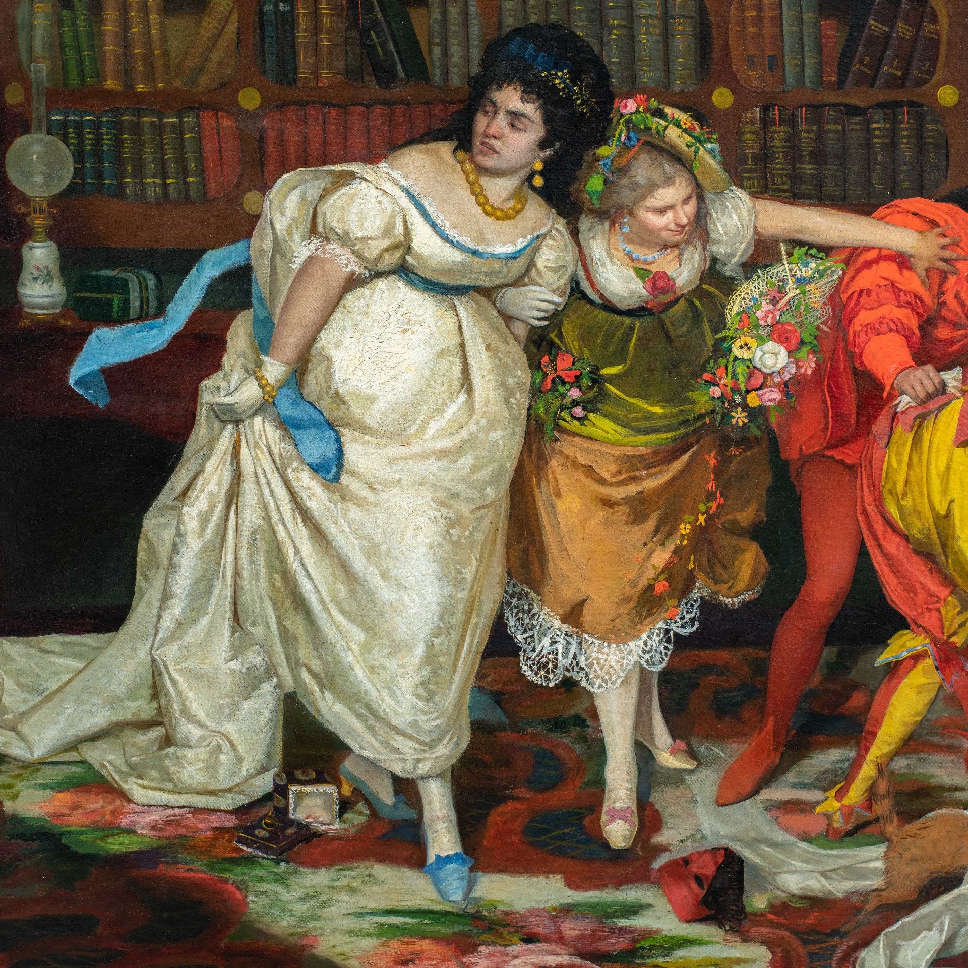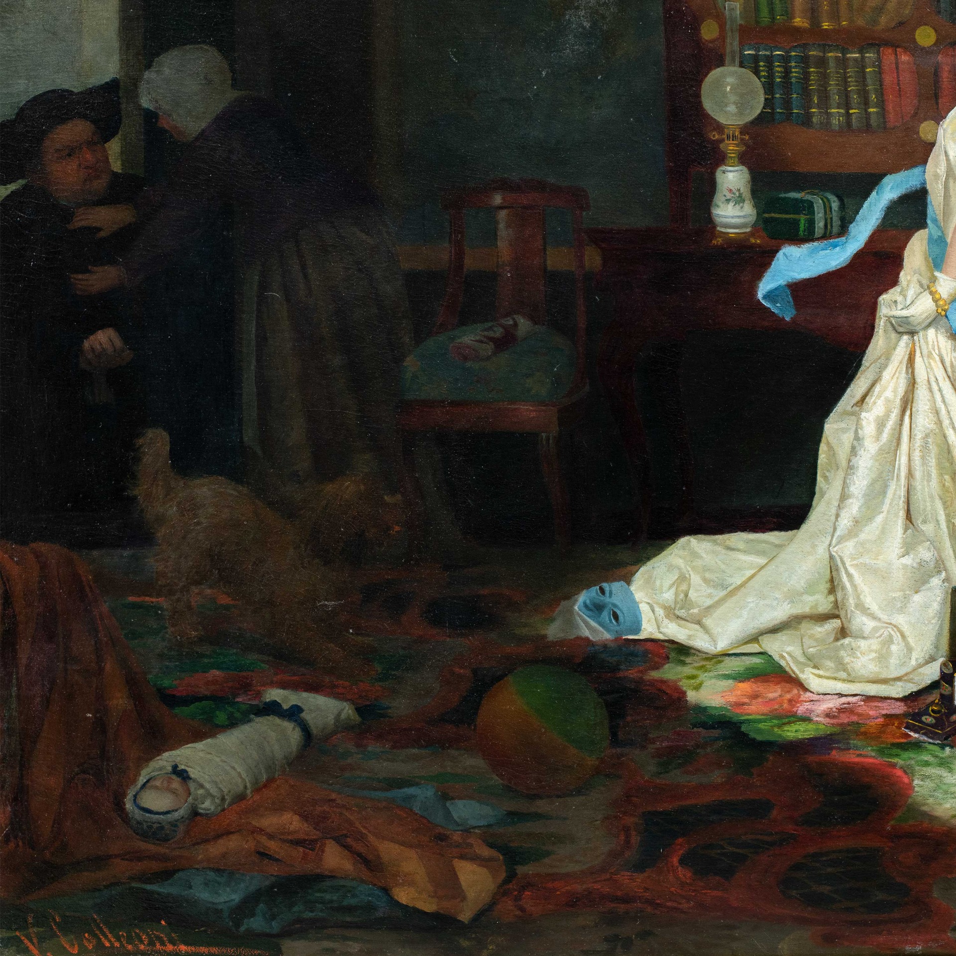 Vincenzo Colleoni was a Venetian painter active in the second half of the 19th century and belonged to the Realism movement. This movement is expressed in opposition to Romanticism and Neoclassicism, seeking to depict daily life and reality with a more objective and less idealized approach. Unfortunately, not many sources have come down to us about Colleoni, and he is among those artists who still need a more in-depth critical study. We know that he exhibited at the National Exhibition of Parma in 1870 with the painting "The Importunate Dog" and in Naples in 1877 he brought five works with the titles: "Visit to a painter's studio", "Pearl Threader", "The Acrobats", "A Ray of Sunshine after the Rain" and "Childish Contentment". In our painting, signed in red by the artist, we find a dynamic interior scene where the two female figures in the center are pushing away a crowd of masked characters who are very curious and interested in seeing the swaddled baby up close in the left corner of the canvas. Also in the dim light, a nurse is pushing away a character with a hat. The costumes suggest a social event, while the laughter and the strong curiosity of those present allow us to imagine a scandal linked to the birth of this infant.