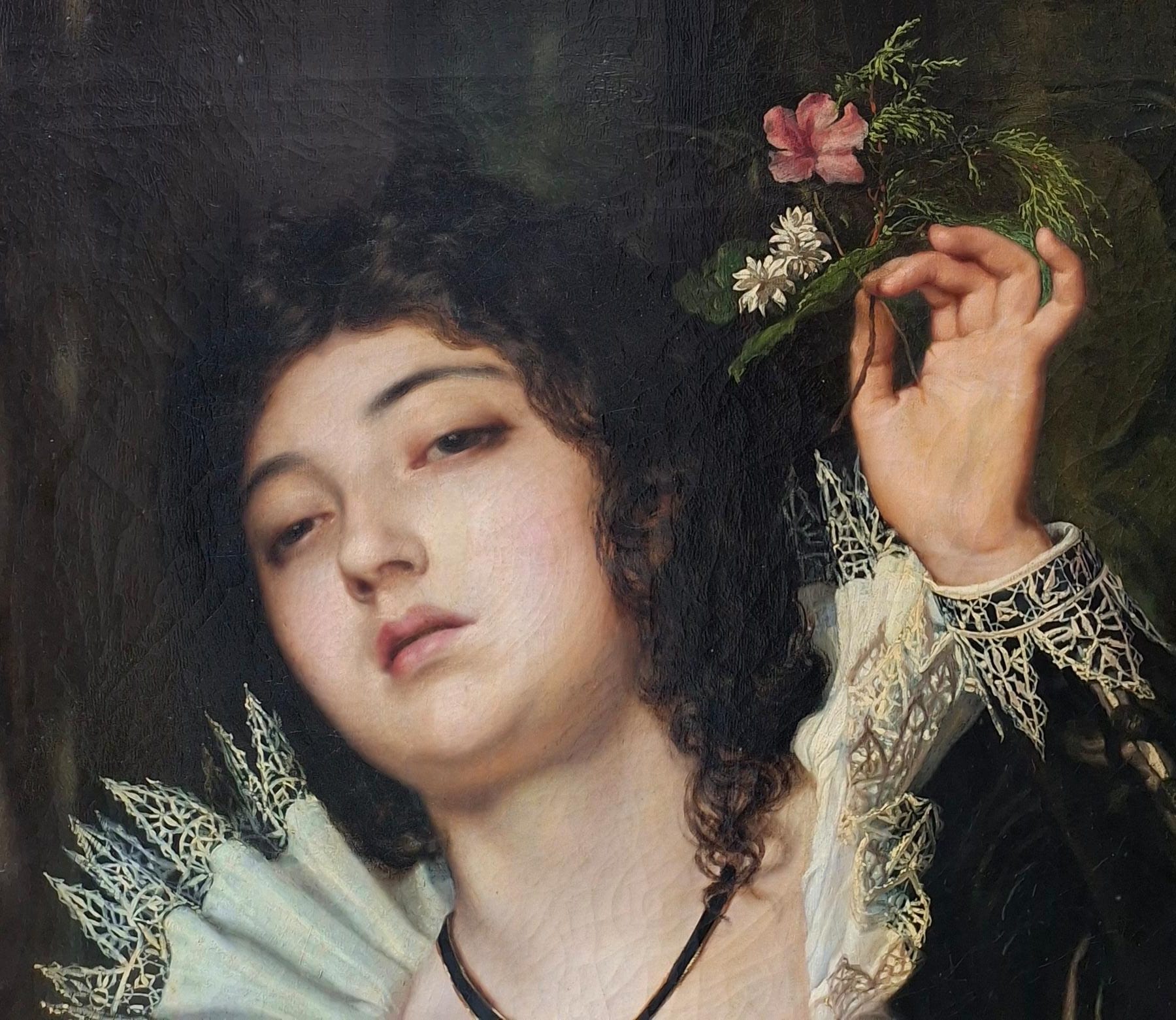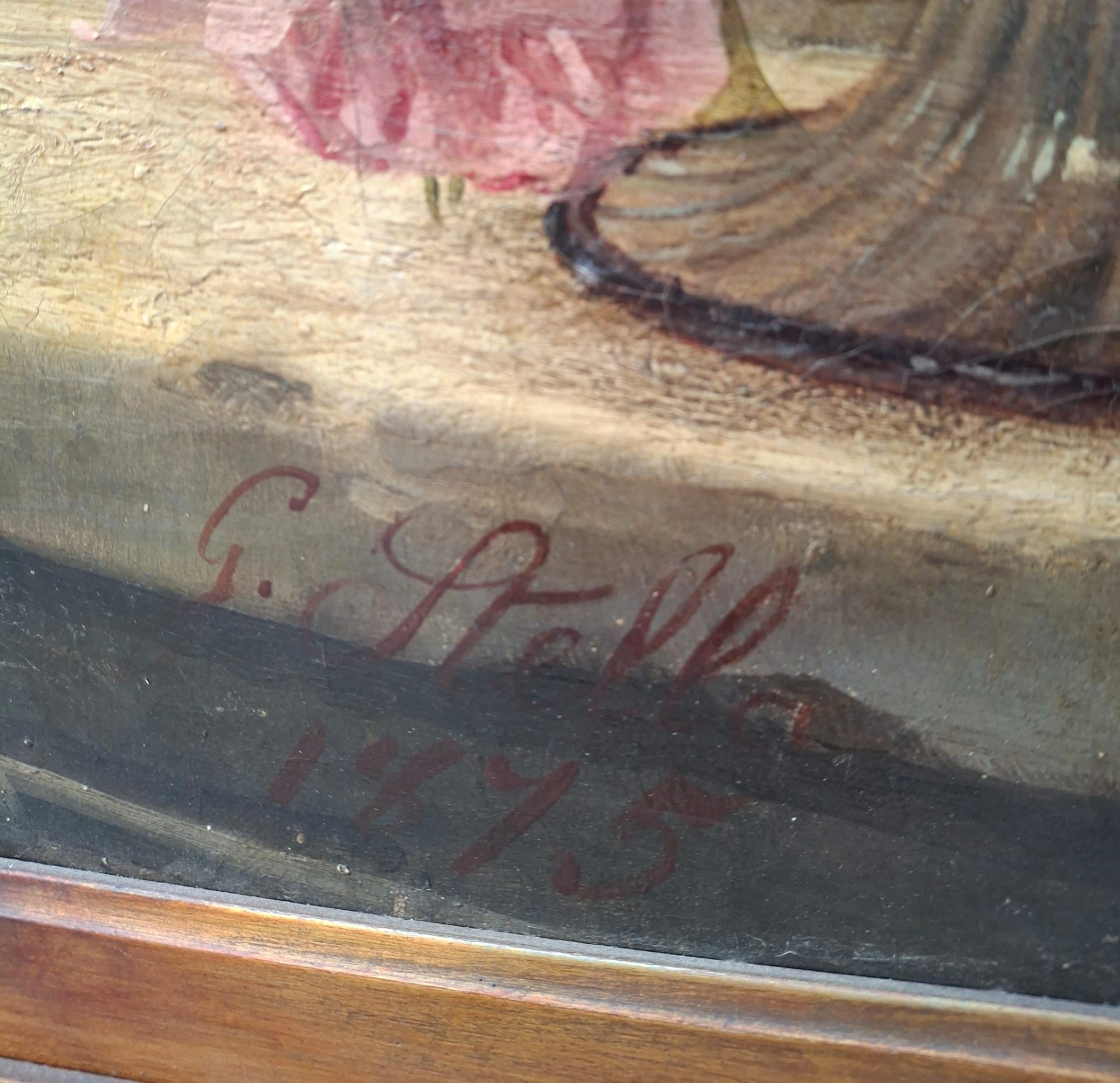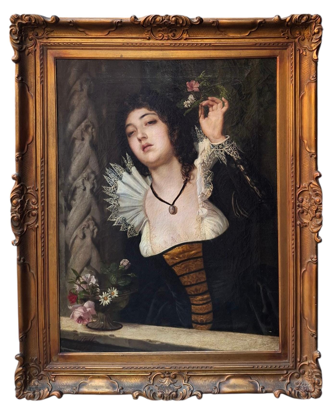 Guglielmo Stella (Milano 1828– Venezia 1888), Giovane donna con natura morta, olio su tela, firmato in basso a sinistra e datato 1875, misure 89x66 cm, con cornice 112x90 cm, timbro della collezione Pietro Biasutti, Venezia.