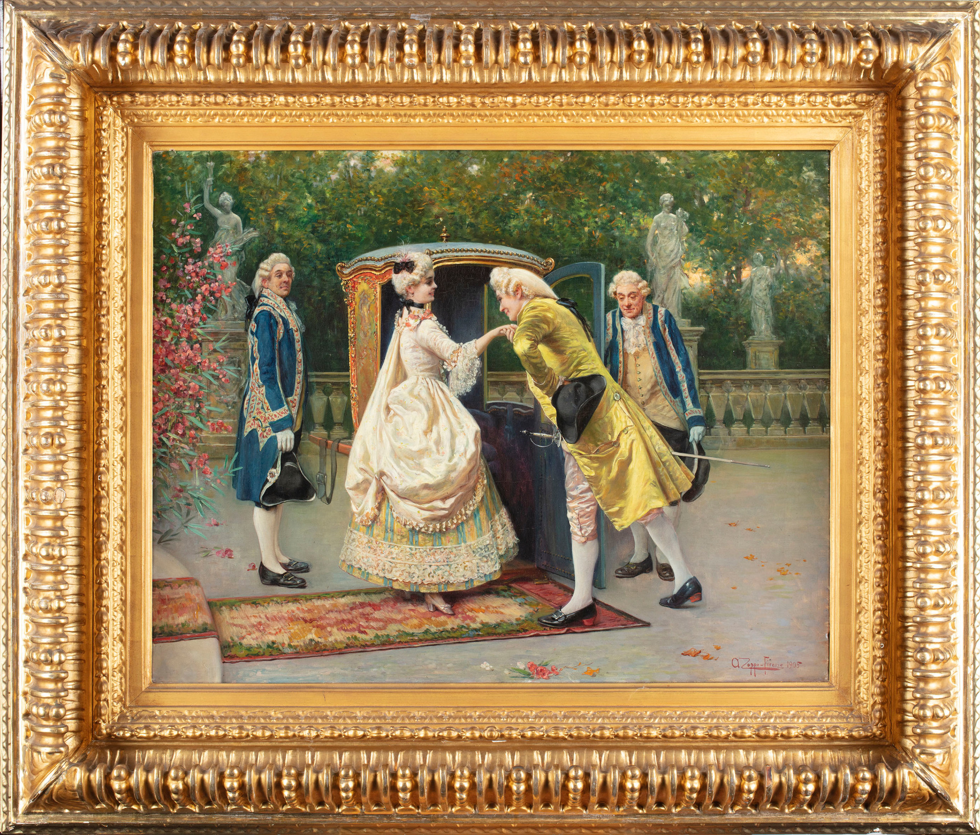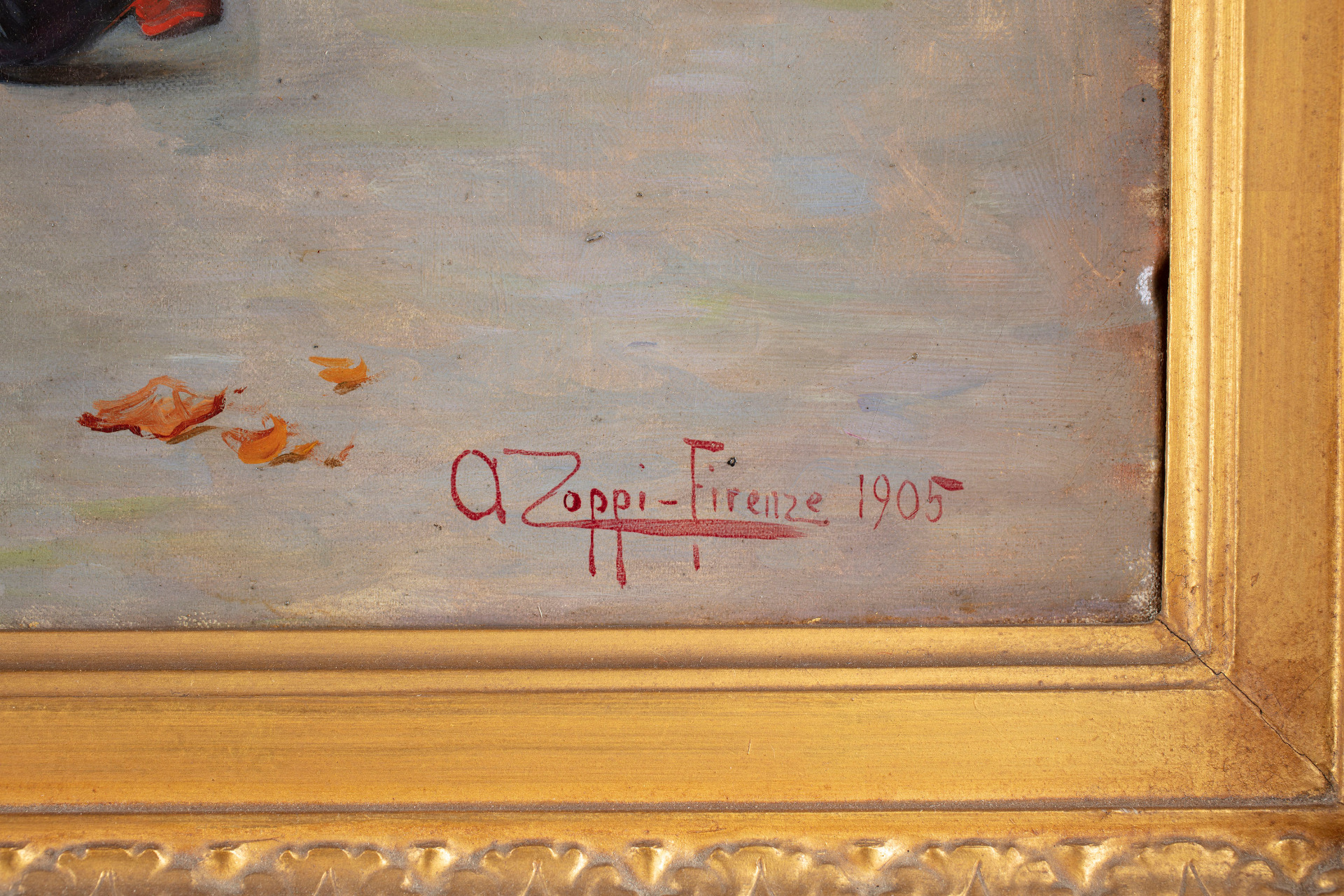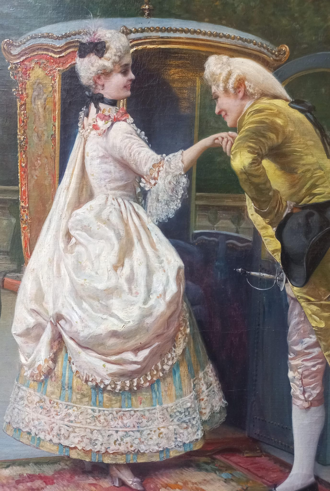 Antonio Zoppi (Novara 1860-Firenze 1926), Scena galante, olio su tela, misure 53.5x68 cm, con cornice intagliata e dorata del XIX secolo misure 82x96 cm, firmato in basso a destra e datato 1905. http://www.oldpaintingsonline.com