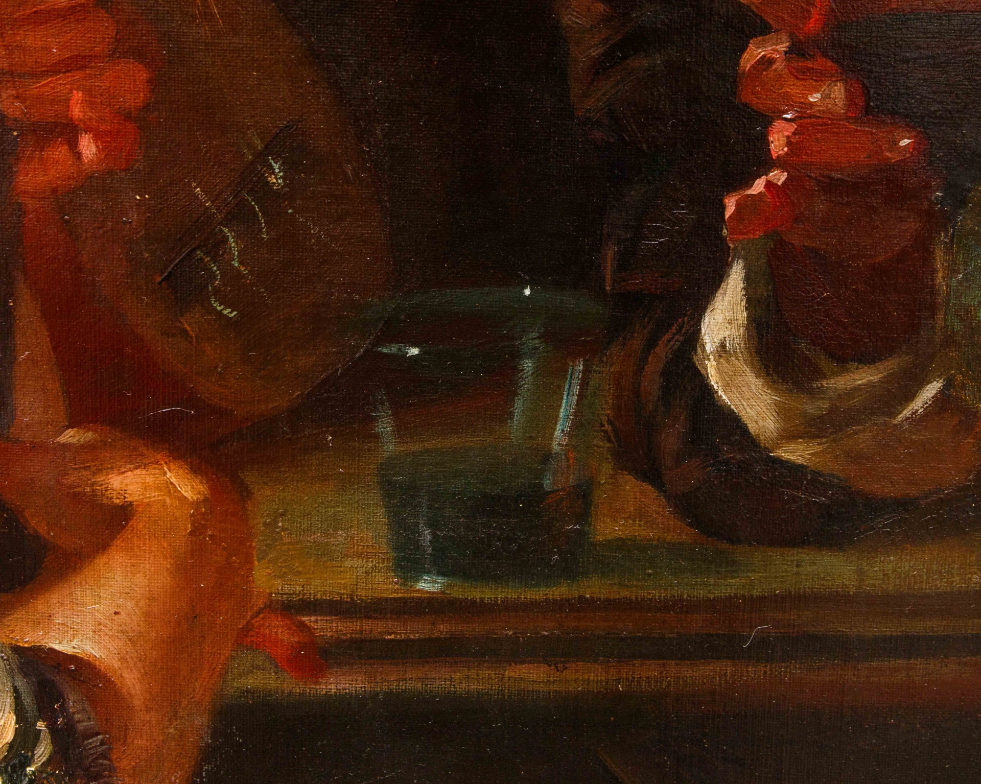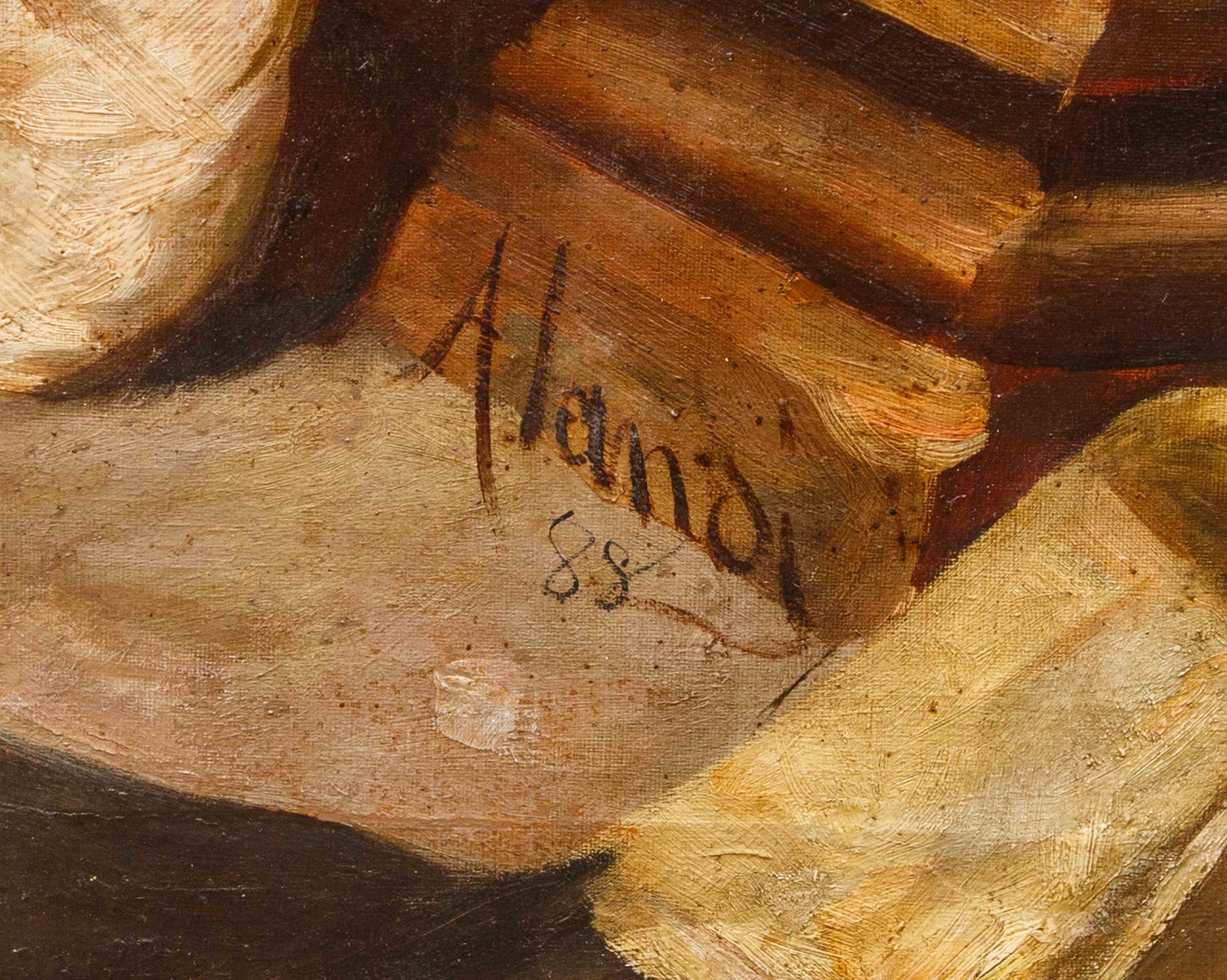 The majestic canvas presented here is the work of one of the main exponents of 19th-century Spanish painting, Cristòfor (or Cristobal) Alandi (Terragona, 1856 – Barcelona, 1896), as evidenced by the signature affixed in the lower right. An artist of whom little biographical information is known, partly due to his premature death at the age of just forty, we know that he trained at the Academy of Fine Arts in Barcelona under the guidance of Simó Gomez Polo, a realist painter and engraver who had worked closely with the French Alexandre Cabanel, Tony Robert-Fleury, allowing himself to be deeply inspired by the masterpieces of Édouard Manet and Eugène Delacroix. At the age of eighteen, during a trip to Rome, he had the opportunity to see and learn about the works of the master Marià Fortuny i Marsal (Reus, 1838 – Rome, 1874), son-in-law of the director of the Prado Museum and undisputed model for many Spanish artists of the second half of the 19th century, whose art was characterized by pragmatic scenes of common life of great vivacity (to quote the words of the critic Théophile Gautier “Fortuny as an etcher equals Goya and approaches Rembrandt”).