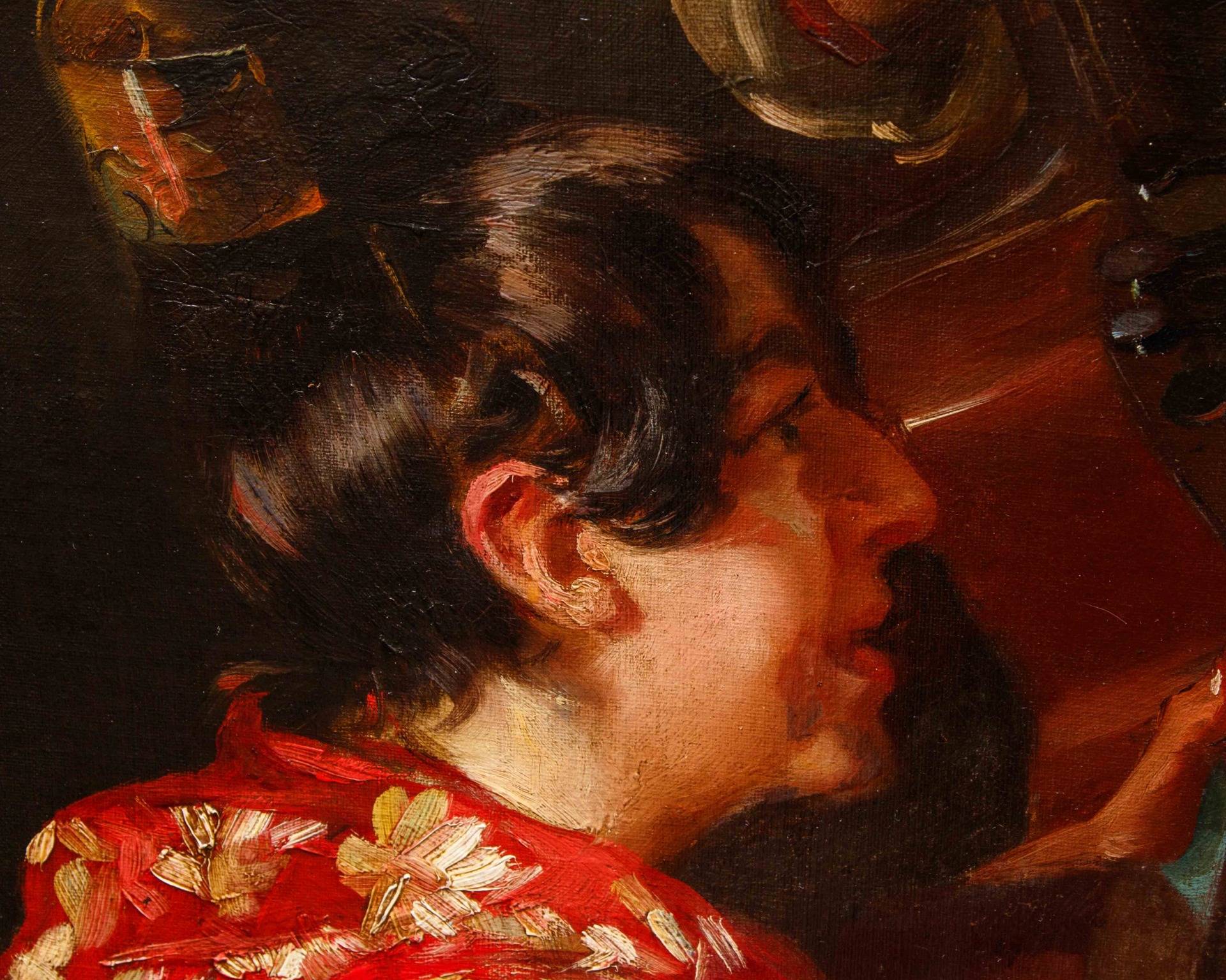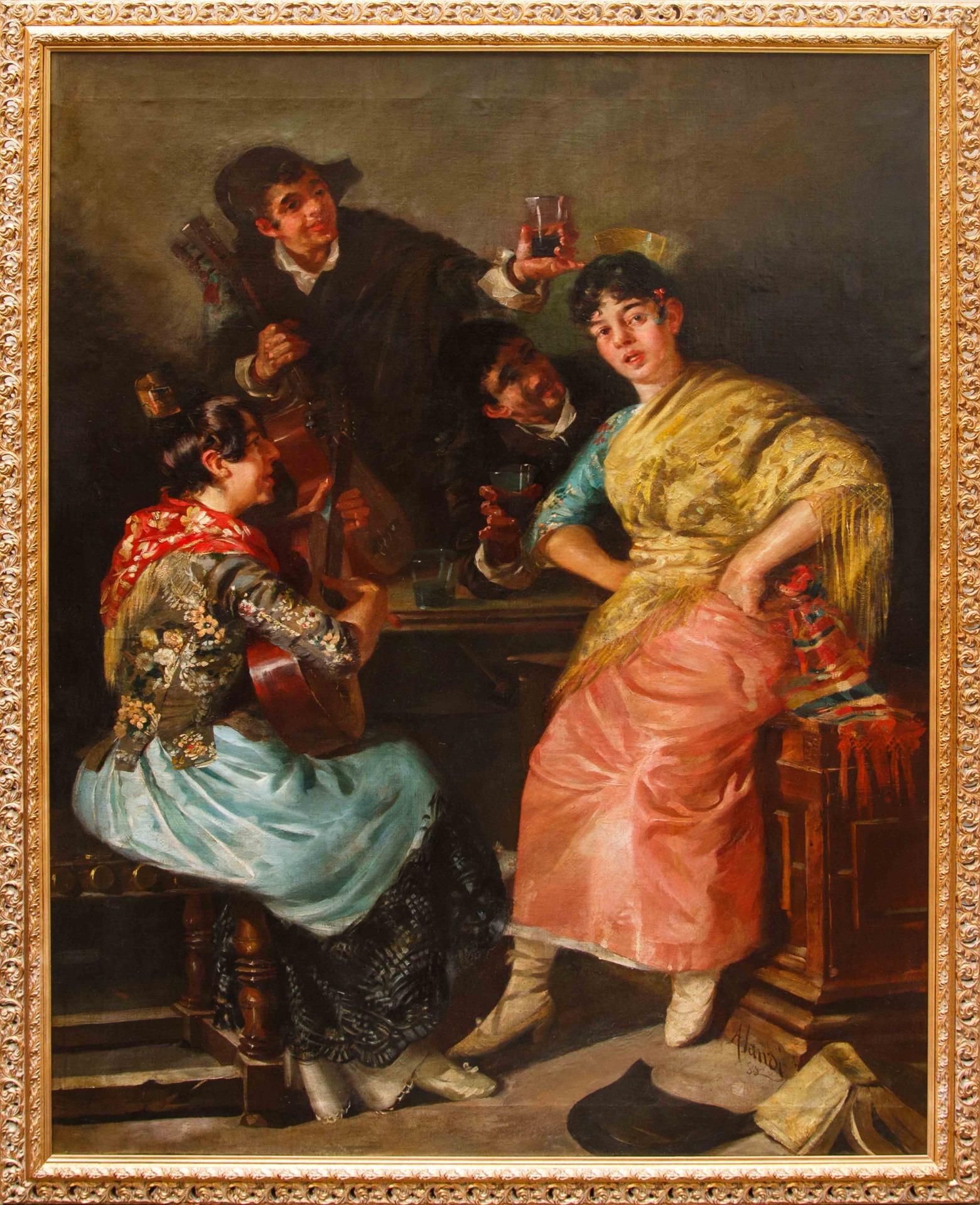 The canvas examined here, created by Alandi in 1888 at the age of thirty-two, shows a Tavern Scene in which two women are visible in the foreground, one sitting with her back turned intent on playing a guitar and the other facing with her gaze fixed on the viewer, and two men in the background, one always with the musical instrument in hand, caught while, bewitched by the female presence, brandishing their glasses of wine. Among the pioneers of realist painting in Spain, Alandi distinguishes himself here for an extraordinary ability to capture the essence and expressiveness of his subjects, through well-calibrated glances and poses. The brushstroke is thick, vibrant, free, with an absolute ability to render the pictorial material, but also intense and fluid, capable of simulating a lively dynamism. The contrast between light and shadow becomes a key element for understanding the painting: the artist, in fact, uses light to model the forms and create a sense of depth and three-dimensionality, made even more accentuated by the chromatic choice. From a dark background in the shadows, where earthy and brownish tones prevail, the two women emerge in all their power, struck directly by the beam of light, whose physiognomies recall the typical Hispanic traits. The two wonderful traditional Catalan dresses certainly do not go unnoticed, a strong symbol of cultural identity, on which Alandi concentrates all his attention: a colorful kaleidoscope of different fabrics, embroidery, lace and lace that has become iconic in Iberian folklore. His portraits, therefore, are not simple physical representations, but real cultural and social investigations.