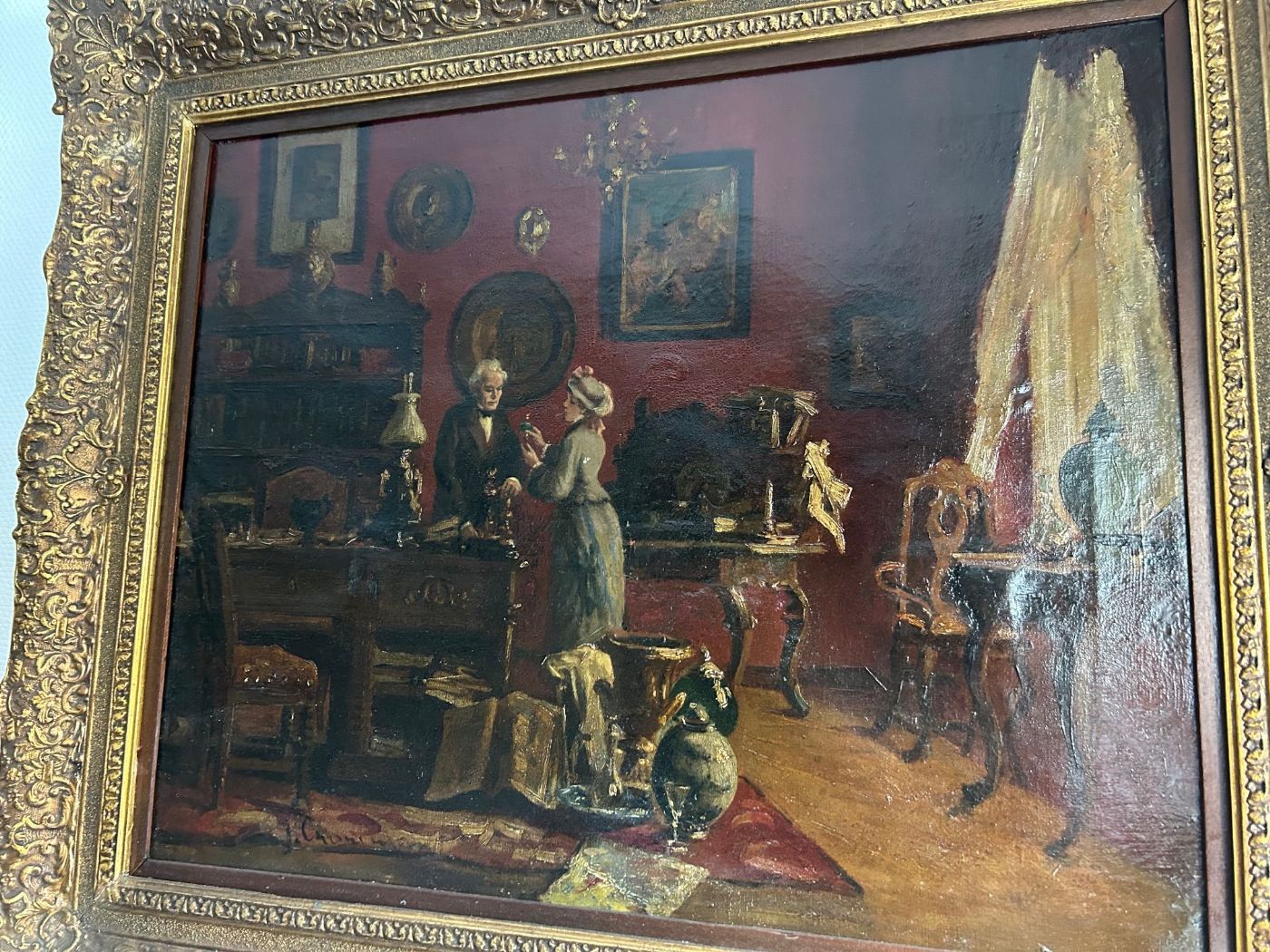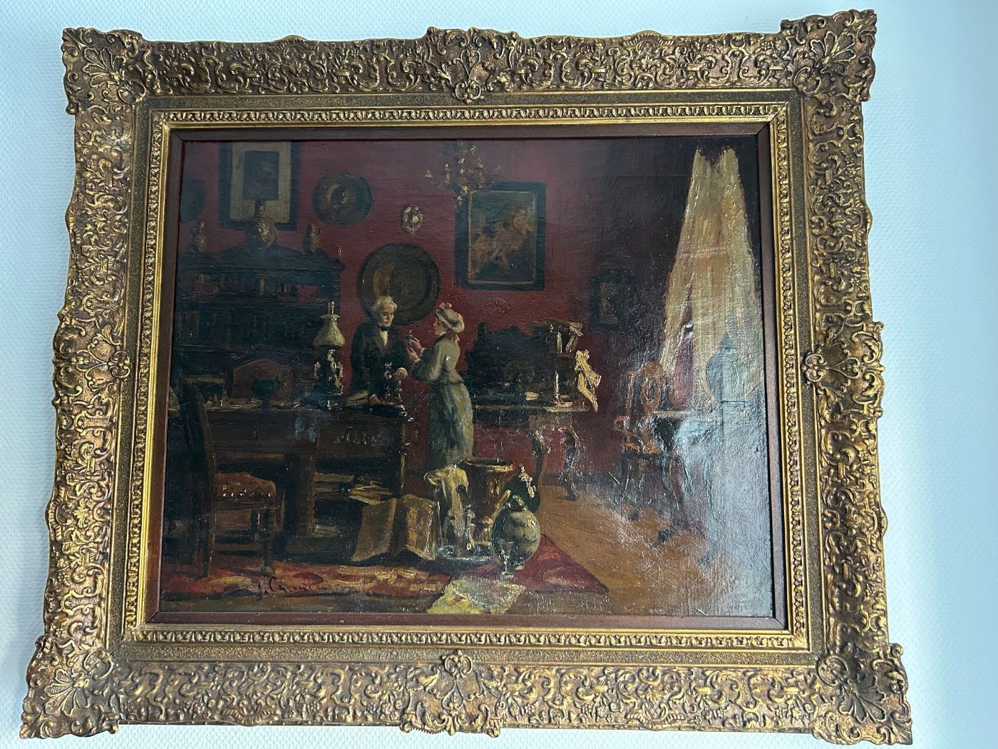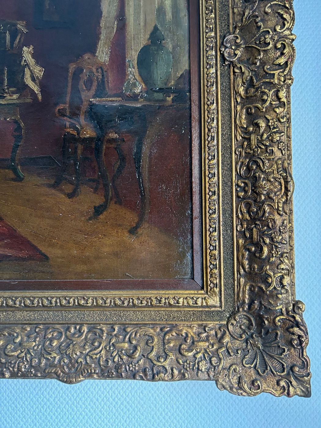 A painting depicting classic furniture from the second half of the 19th century in a gilded frame, oil on canvas, dimensions: 73cm x 87cm (with the frame), the painting has undergone some restoration in the past.