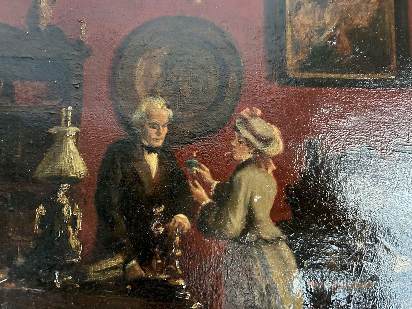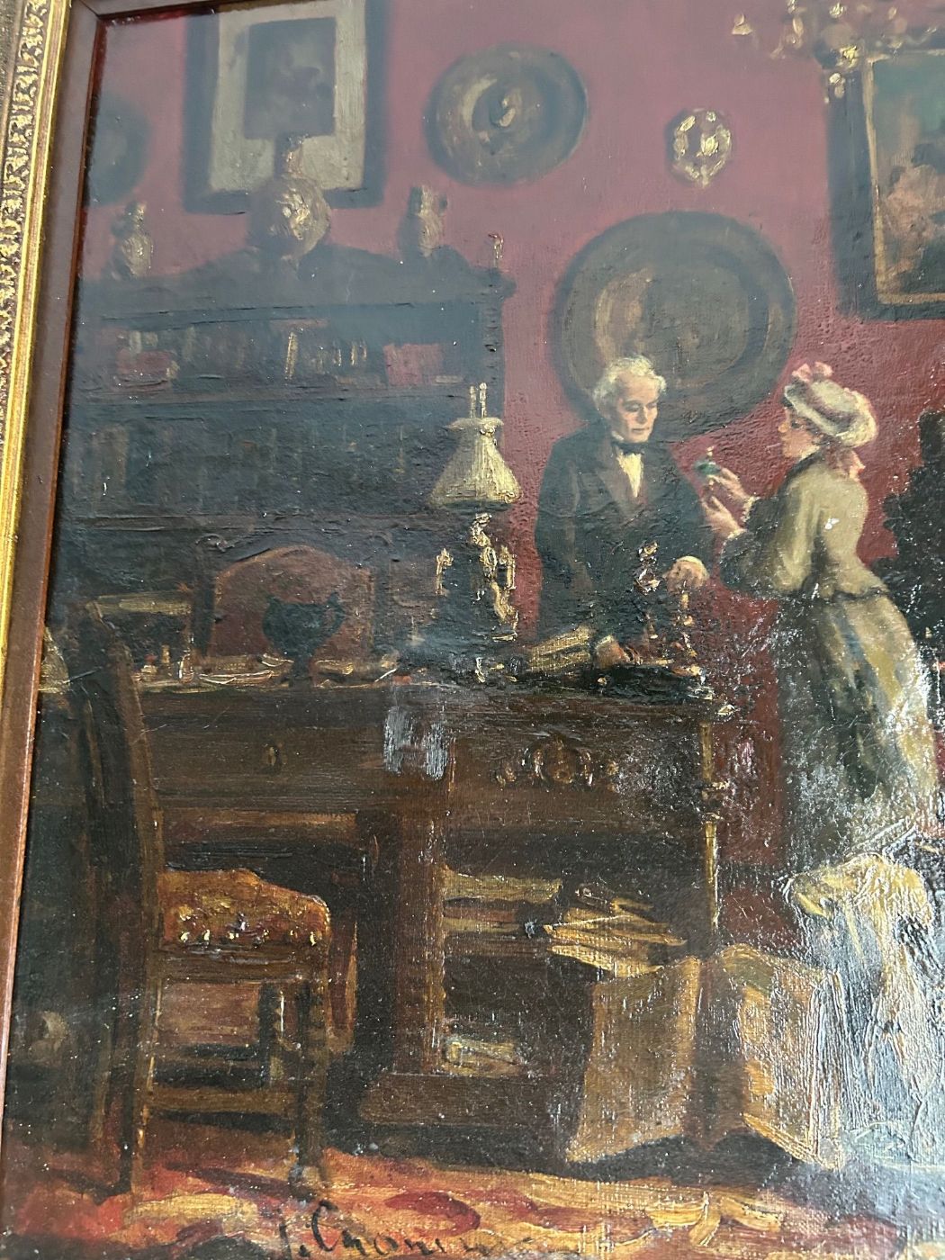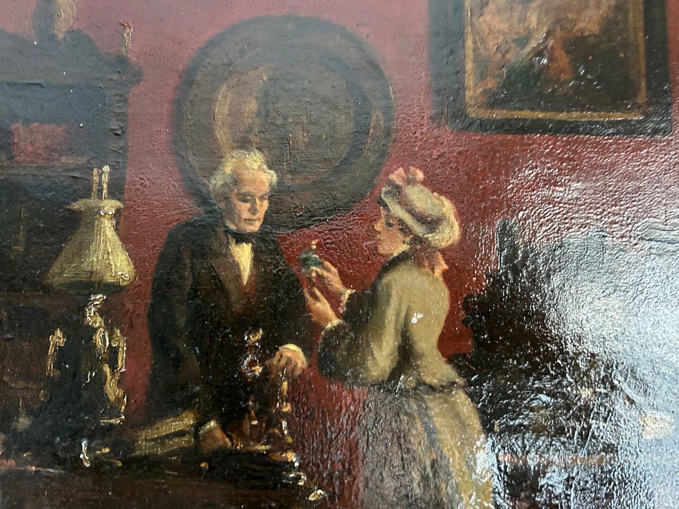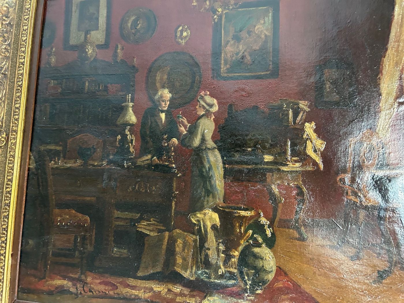 A painting depicting classic furniture from the second half of the 19th century in a gilded frame, oil on canvas, dimensions: 73cm x 87cm (with the frame), the painting has undergone some restoration in the past.