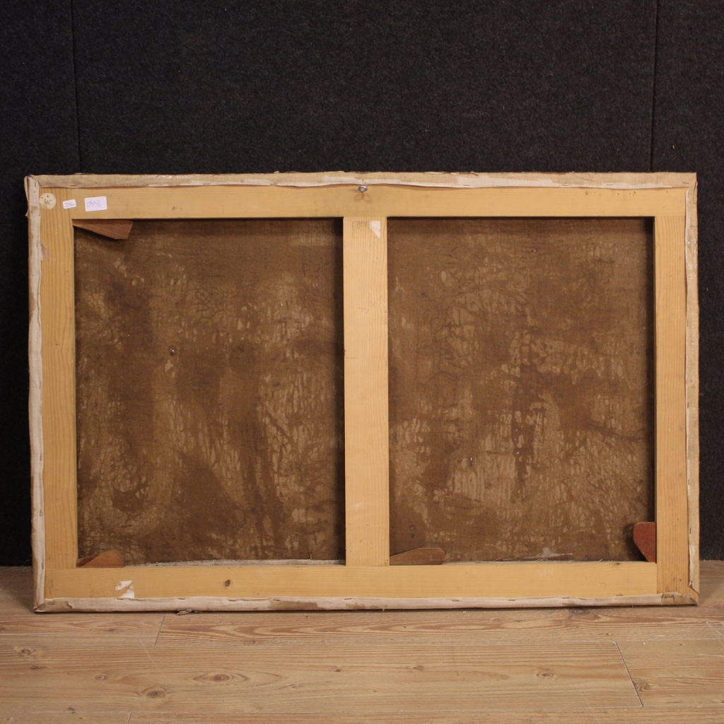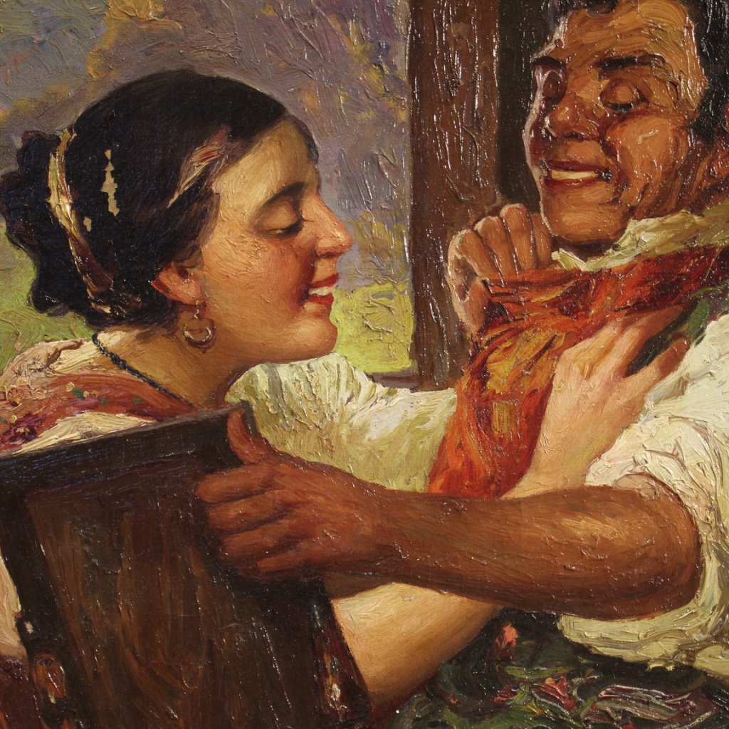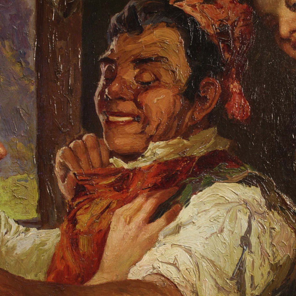 Antique Italian painting from the second half of the 19th century. Framework oil on canvas, depicting interior scene with characters of excellent pictorial quality. Very bright and pleasant painting, signed lower right (see photo), signature in the study phase. Framework showing some small drops of color (see photo). Overall in good state of conservation with some signs of the time.
