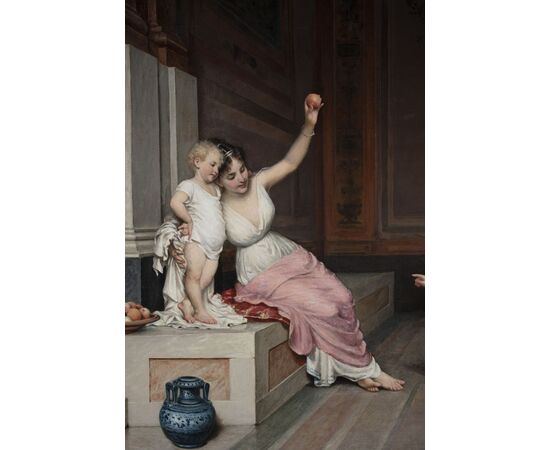 Il pargoletto agita verso l’alto le manine paffute con l’intento di afferrare il frutto, e nel mentre muove passi timidi ed incerti; le dita della giovanissima ancella, riconoscibile per i sandali “a schiava”, reggono il piccolo da un lembo di stoffa. Accanto alla madre e con fare quasi risoluto, un fanciullo poco più grande guarda la scena.