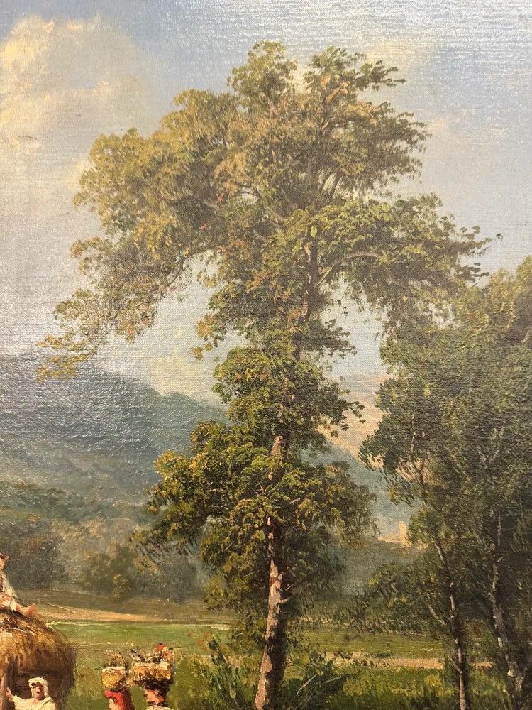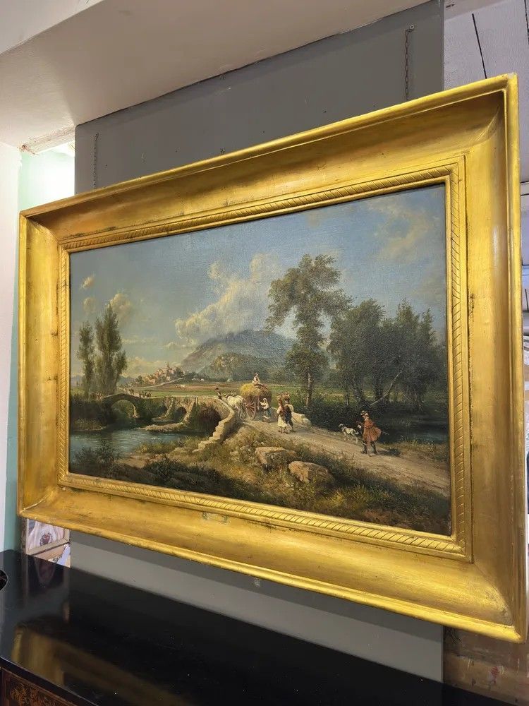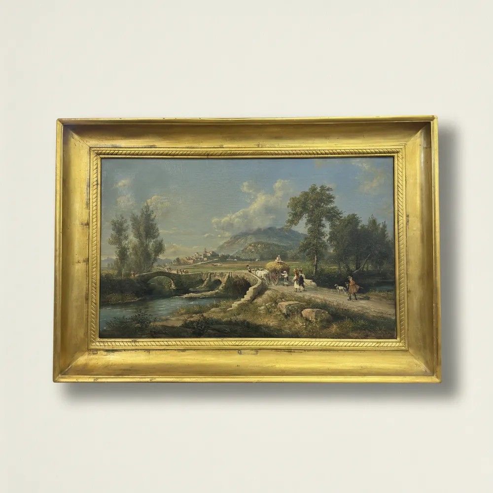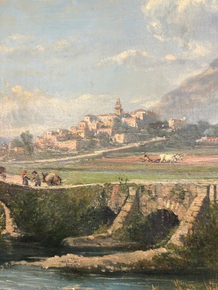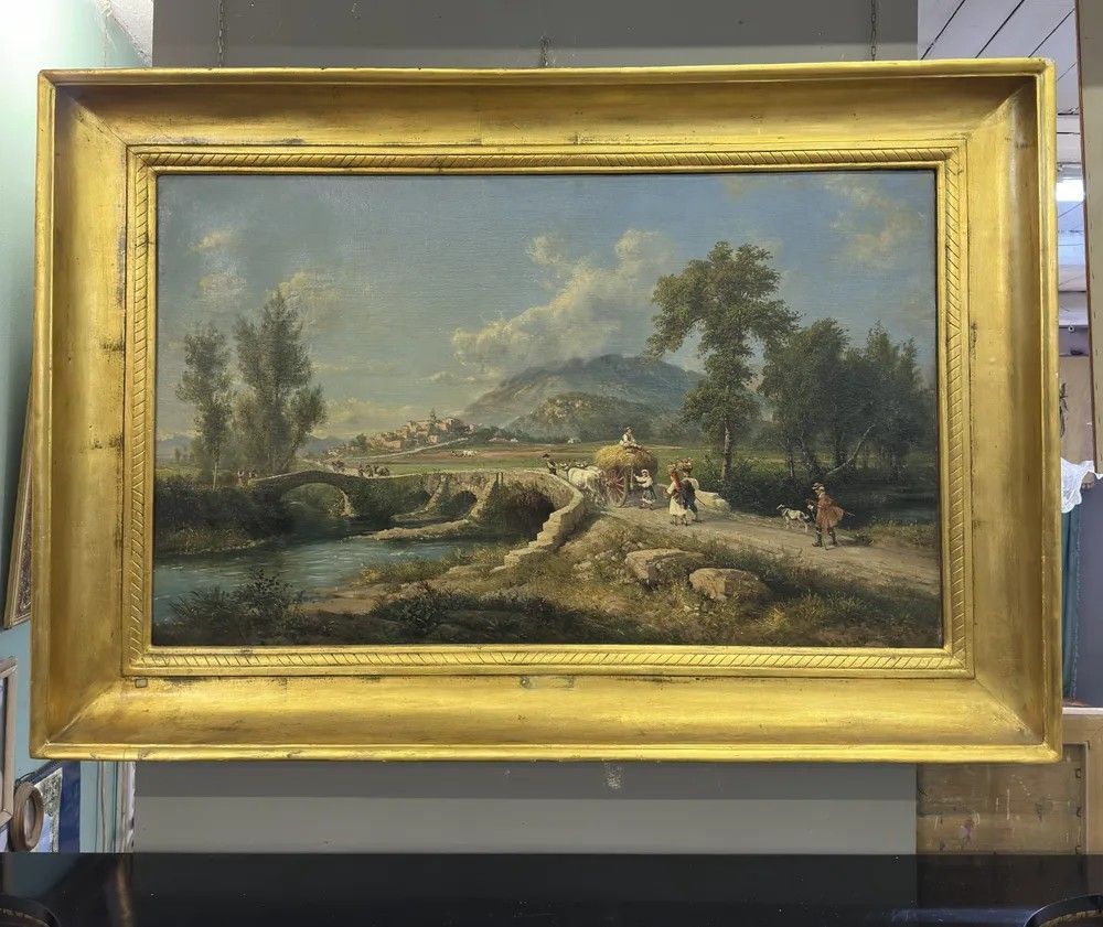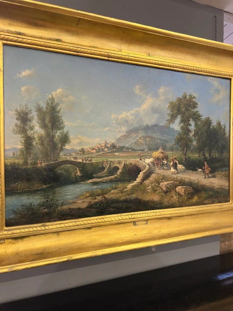 Questo grande olio su tela (101 × 148 cm) appartiene alla Scuola italiana del XIX secolo e raffigura un idilliaco paesaggio con ponte che attraversa un corso d’acqua limpido. Il pittore, vicino al gusto della Scuola di Posillipo e alle coeve esperienze siciliane di Sottile, applica con maestria la nuova sensibilità romantico-naturalista: cieli mossi da nubi vaporose, vegetazione vibrante di luce e la vita quotidiana dei contadini diventano protagonisti poetici.Sullo sfondo si staglia un borgo arroccato, memoria dei taccuini dei viaggiatori del Grand Tour, mentre una montagna avvolta da foschia azzurrina amplifica la profondità della scena. In primo piano, un carro colmo di fieno attraversa il ponte a schiena d’asino; donne con cesti e un cacciatore col cane animano la riva, creando un delicato teatro rurale.Tecnica: pennellate sottili per i cieli, impasti materici per rocce e vegetazione;Cromia: verdi smeraldo e ocra calde dialogano con azzurri cerulei;Luce: tagli luminosi radenti che definiscono ogni dettaglio;Cornice: originale a canna ciaccata, dorata, coeva al dipinto.L’opera è un perfetto esempio di quel paesaggismo che, a partire da Napoli e dal Sud Italia, seppe rinnovare la tradizione vedutista fondendo l’osservazione dal vero con un sentimento lirico della natura. Ogni minuscolo riflesso sull’acqua o foglia agitata dal vento testimonia la straordinaria qualità pittorica di un artista attento sia al dettaglio sia alla resa atmosferica.Con le sue dimensioni importanti e la cornice dorata originale, questo dipinto diventa un fulcro scenografico per interni classici o contemporanei, offrendo al collezionista l’autentica emozione di un viaggio nel tempo al cuore dell’Ottocento italiano.Stile: Altro stileMateriale: Dipinto ad olio su telaAltezza (cm): 101Larghezza (cm): 148Epoca: XIX Secolo - 1800