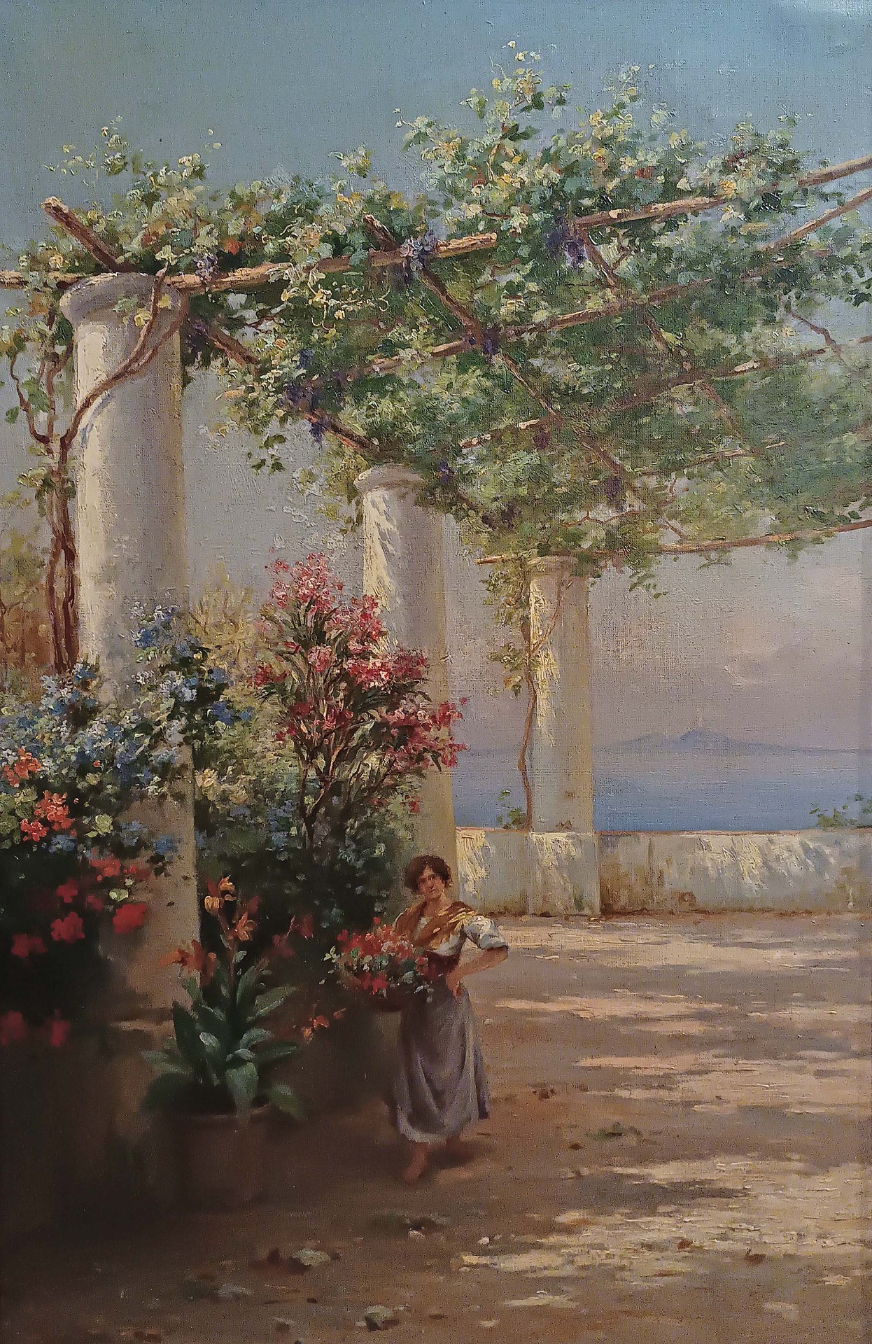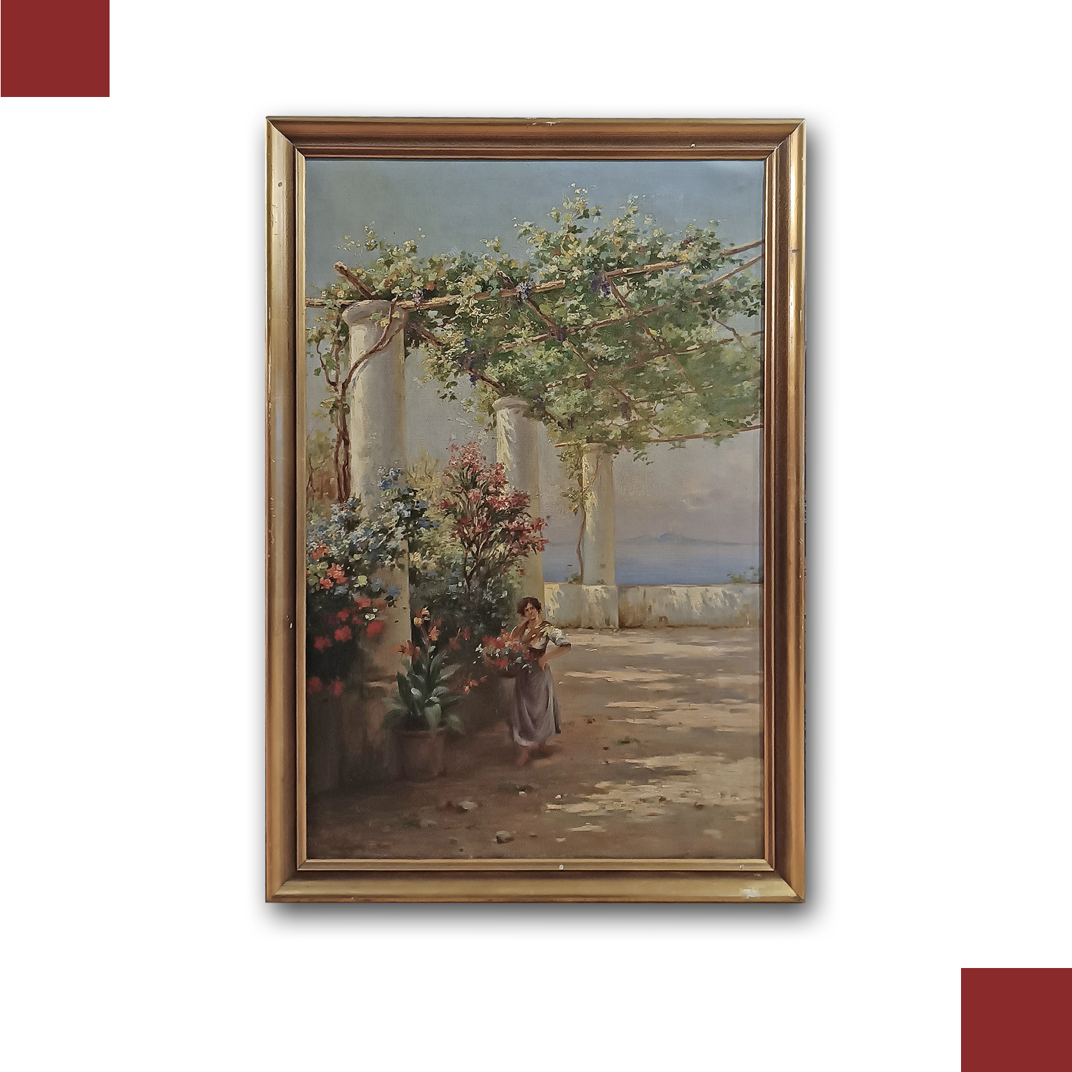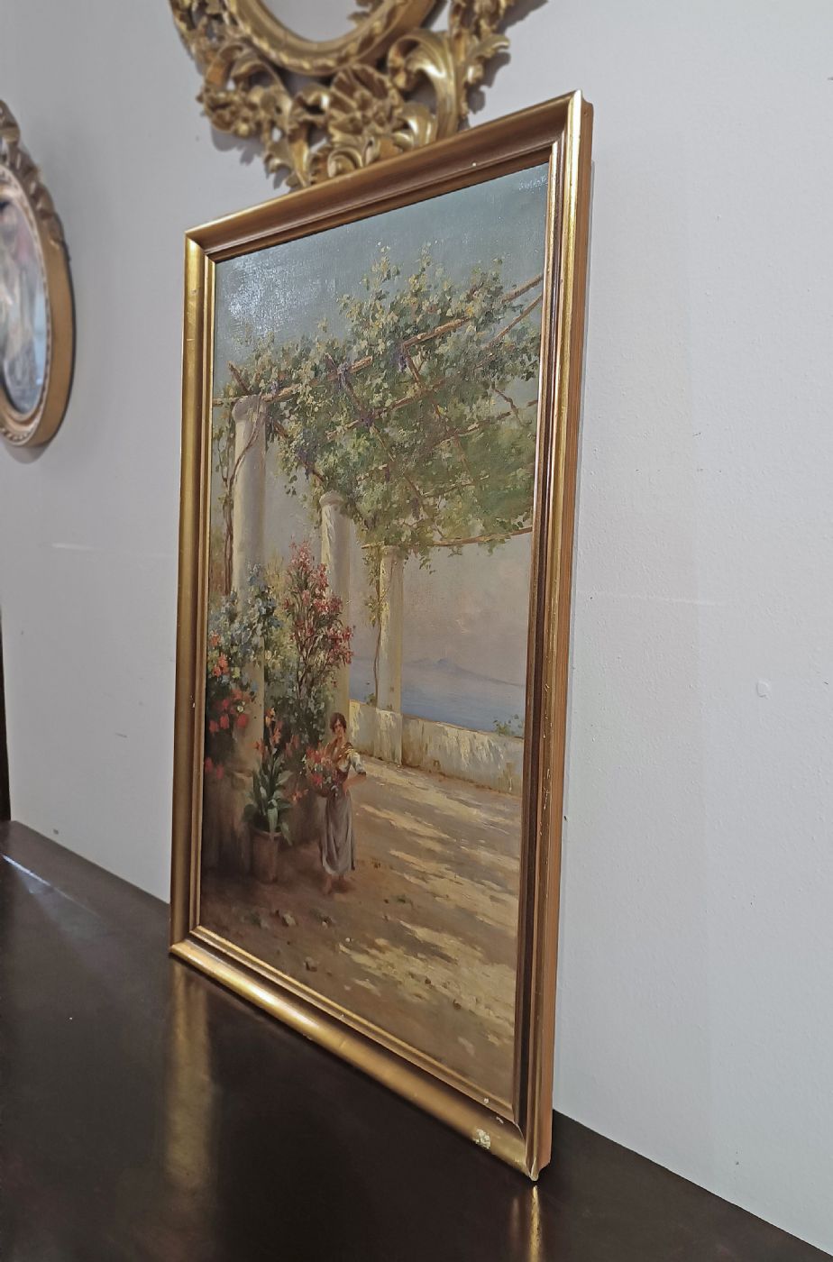 Oil painting on canvas, framed by a carved and gilded wooden frame. The painting depicts a view of a terrace on the Neapolitan coast. In the distance, you can see the sea and Vesuvius, while in the foreground, inside a flowered terrace open to the sea, a young woman is depicted holding flowers. This is a painting that is appreciable for its technique and pictorial rendering, capable of furnishing any environment with class and elegance. Manufacturing attributable to the Neapolitan School, of the first half of the 19th century.