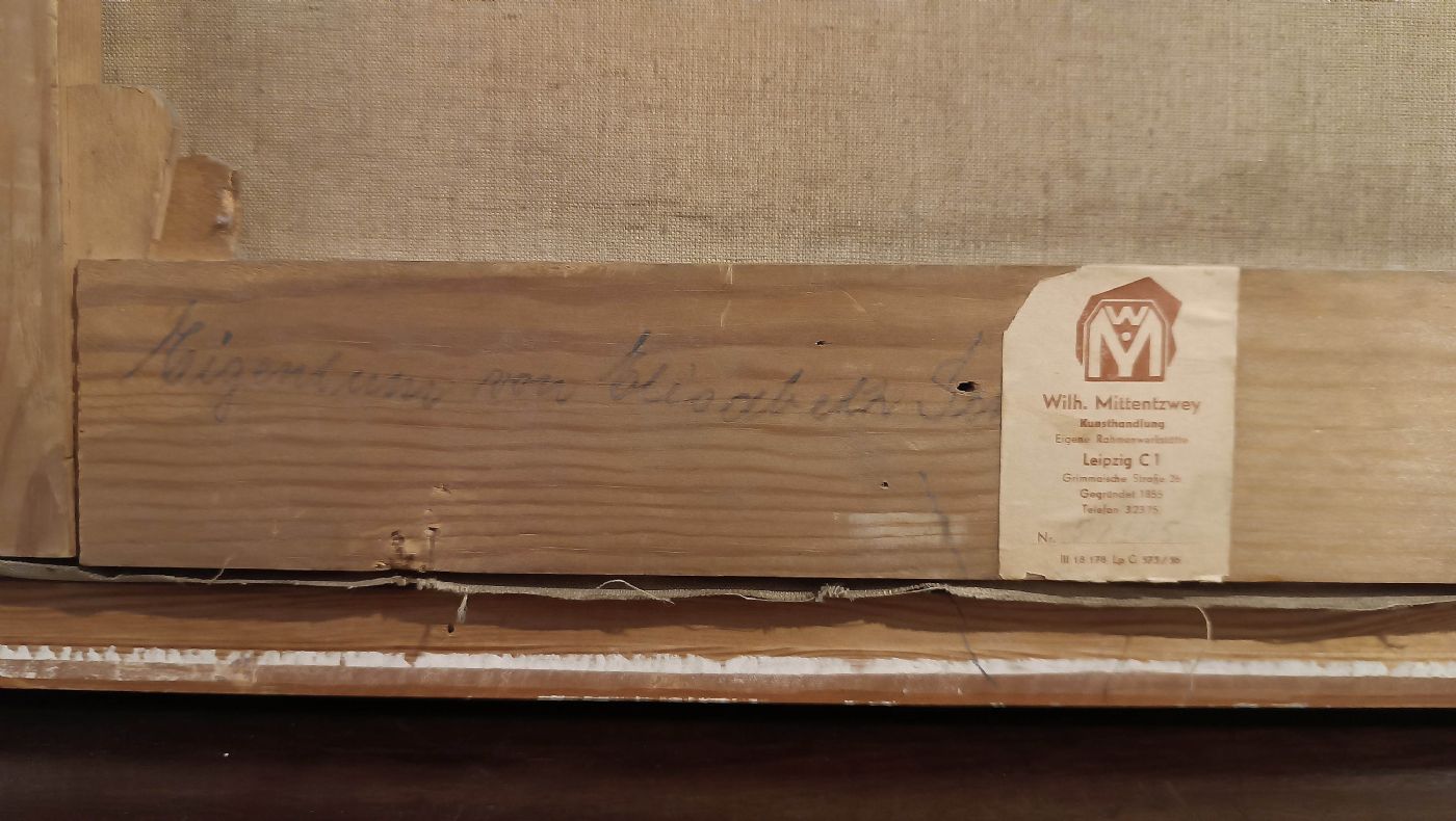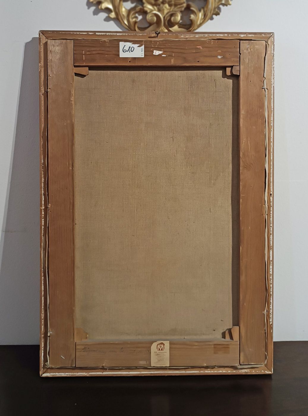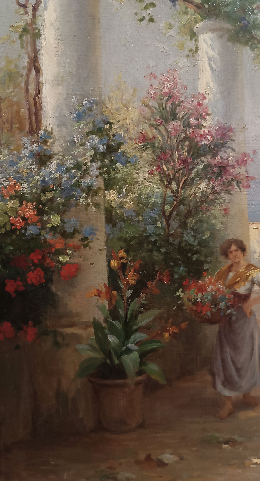 Oil painting on canvas, framed by a carved and gilded wooden frame. The painting depicts a view of a terrace on the Neapolitan coast. In the distance, you can see the sea and Vesuvius, while in the foreground, inside a flowered terrace open to the sea, a young woman is depicted holding flowers. This is a painting that is appreciable for its technique and pictorial rendering, capable of furnishing any environment with class and elegance. Manufacturing attributable to the Neapolitan School, of the first half of the 19th century.