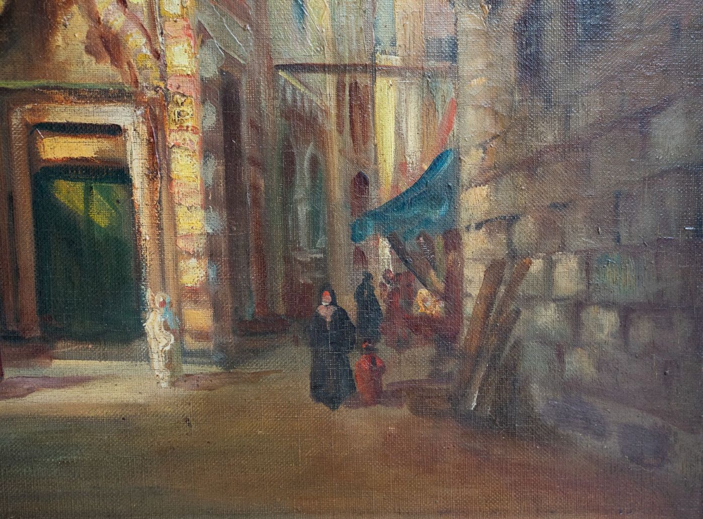 Descrizione: Affascinante veduta orientale di fine Ottocento, realizzata con sensibilità luministica e gusto esotico tipici del periodo orientalista. La scena raffigura una via assolata di una città mediorientale, animata da figure in abiti tradizionali e dominata dall’imponente architettura di una moschea o portale monumentale. Le tonalità calde dell’intonaco e della pietra si fondono con l’azzurro del cielo, creando un suggestivo gioco di luci e ombre.