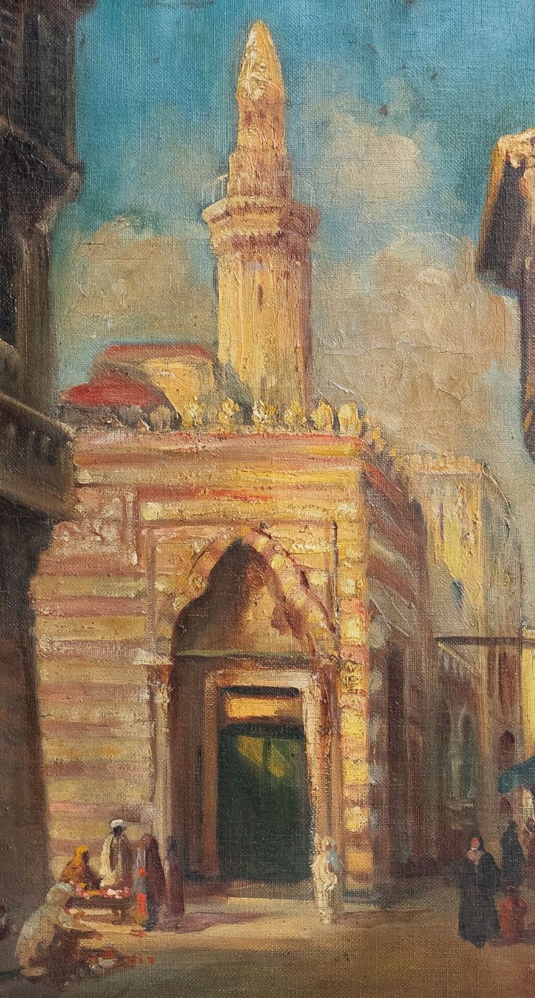 Descrizione: Affascinante veduta orientale di fine Ottocento, realizzata con sensibilità luministica e gusto esotico tipici del periodo orientalista. La scena raffigura una via assolata di una città mediorientale, animata da figure in abiti tradizionali e dominata dall’imponente architettura di una moschea o portale monumentale. Le tonalità calde dell’intonaco e della pietra si fondono con l’azzurro del cielo, creando un suggestivo gioco di luci e ombre.