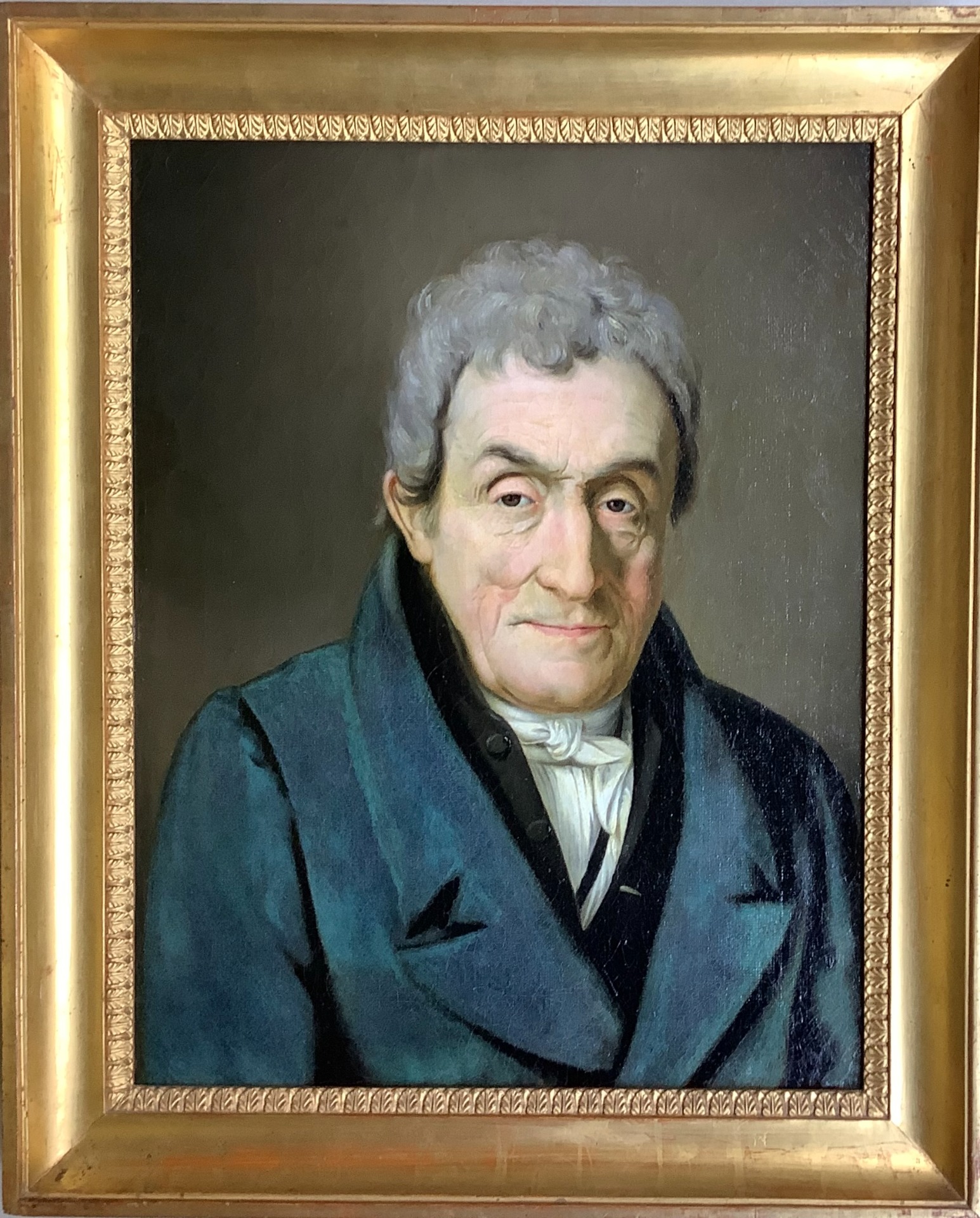 Portrait of an octogenarian gentleman, datable to around 1815, attributed to Giuseppe De Albertis (Arona 1863 - Gallarate 1845). Old age has not diminished the spirit of the protagonist, who smiles amiably while his eyes twinkle with a hint of irony. The artist precisely renders the numerous, small wrinkles that envelop the elderly protagonist's face, the thin skin now lacking elasticity and almost transparent, the wig worn without much care: it is an analytical but not crude realism, because empathy prevails over details and tempers the signs of aging. In the portrait, De Albertis confirms his solid roots in Lombard realism, which he makes current in the new Romantic taste. Oil on canvas, 47x35 cm, in a gilded cove frame, contemporary and original.