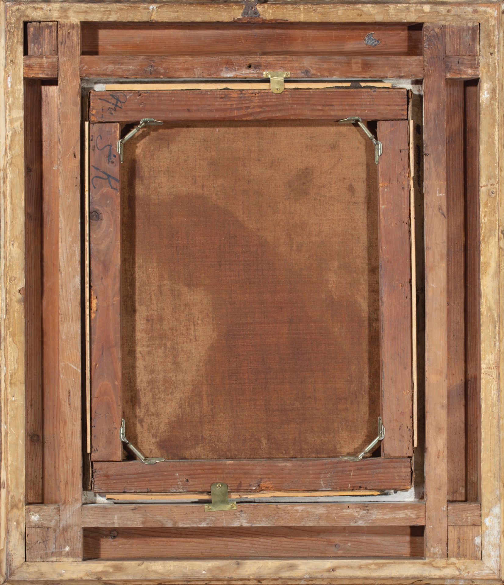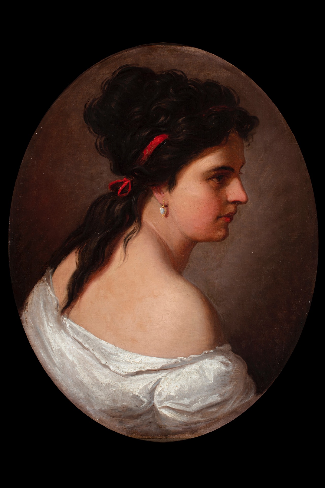 Scuola tedesca, “Profilo di fanciulla con nastro rosso” seconda metà del XIX secolo. Olio su tela. 63x50 cm. Cornice coeva in legno dorato. Misure con cornice: 94x81cm. Il ritratto, in un’atmosfera di quiete e riservatezza, raffigura una donna nel momento in cui volta elegantemente la testa verso destra. La sua attenzione è infatti catturata da qualcosa - o qualcuno - che si trova fuori dal campo visivo di chi osserva. La luce, uniforme e diffusa, esalta il candore della pelle e la morbidezza del tessuto bianco, messi in risalto dallo sfondo neutro. Il vestito drappeggiato lascia scoperte le spalle e il collo, richiamando un ideale di semplicità neoclassica. La donna porta ornamenti sobri, ma efficaci. I capelli scuri, acconciati voluminosamente, sono raccolti da un nastro rosso fuoco. L'orecchino, un pendente di perla, brilla sull’incarnato, attirando l’attenzione; le perle erano un bene di lusso, importate dall’Oceano Pacifico. Il ritratto è racchiuso in una forma ovale all'interno di una tela rettangolare. Questo formato era estremamente popolare per la ritrattistica intima. La cornice in legno dorato, riccamente scolpita con motivi a volute all’interno e con un motivo di foglie d’acanto all’esterno, è tipica del gusto sfarzoso della fine dell'Ottocento. Il secondo Ottocento fu un periodo di grandi commissioni di ritratti privati da parte della borghesia tedesca. Il dipinto riflette il gusto tipico del periodo per una rappresentazione idealizzata dei soggetti, ma non sfarzosa. La borghesia amava farsi ritrarre in pose intime e riflessive, in opere di un realismo non marcato, ma pacato e pulito, in pieno stile Biedermeier. Questo stile proseguì e incanalò le tendenze romantiche, attente alla personalità dei soggetti e a enfatizzarne la spiritualità.