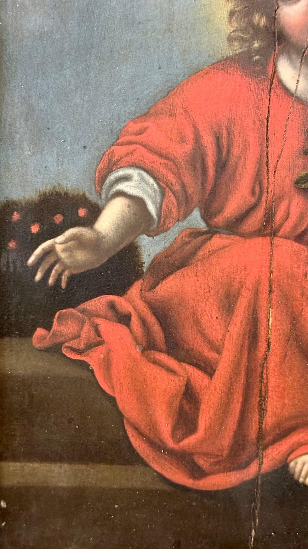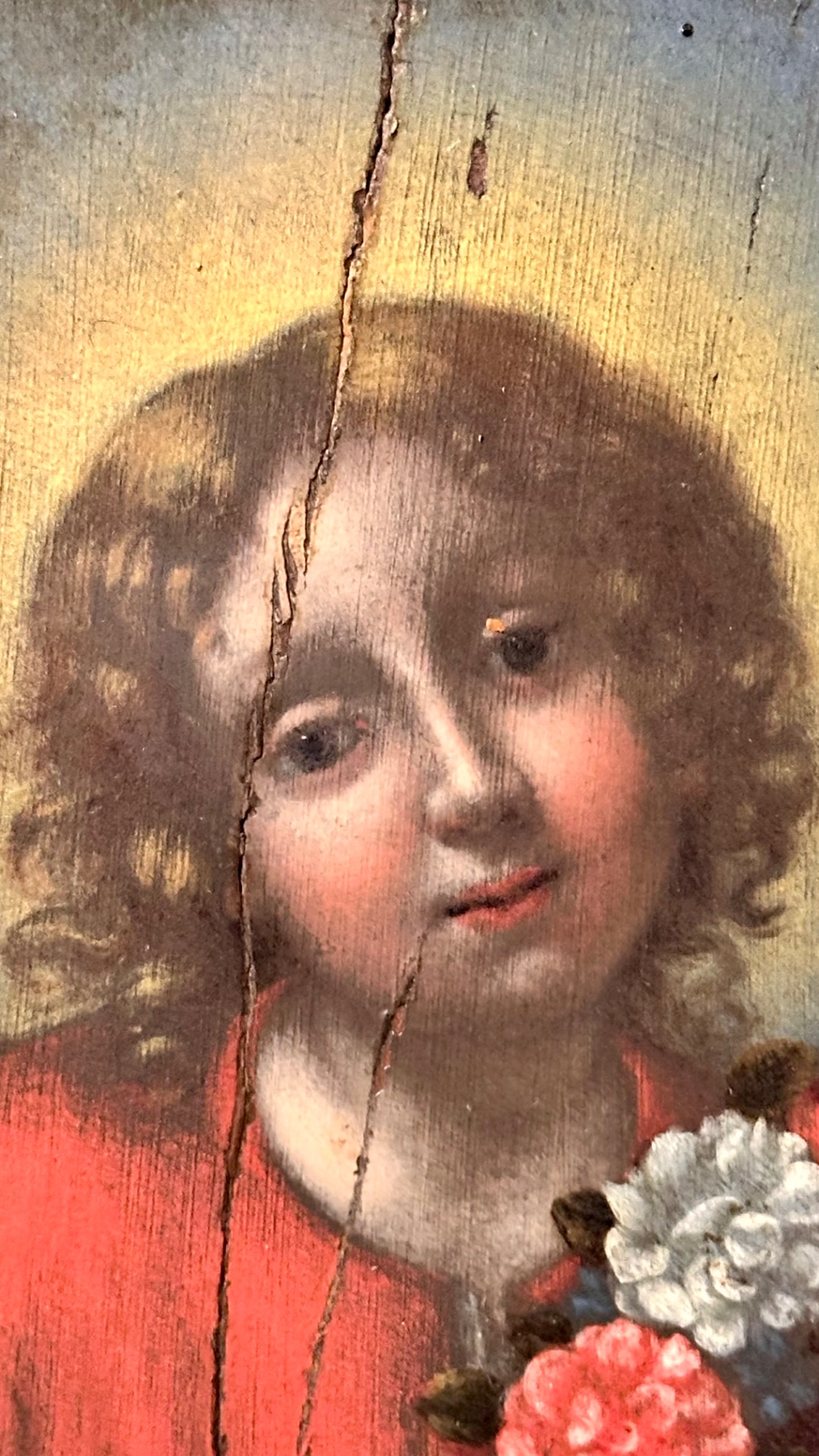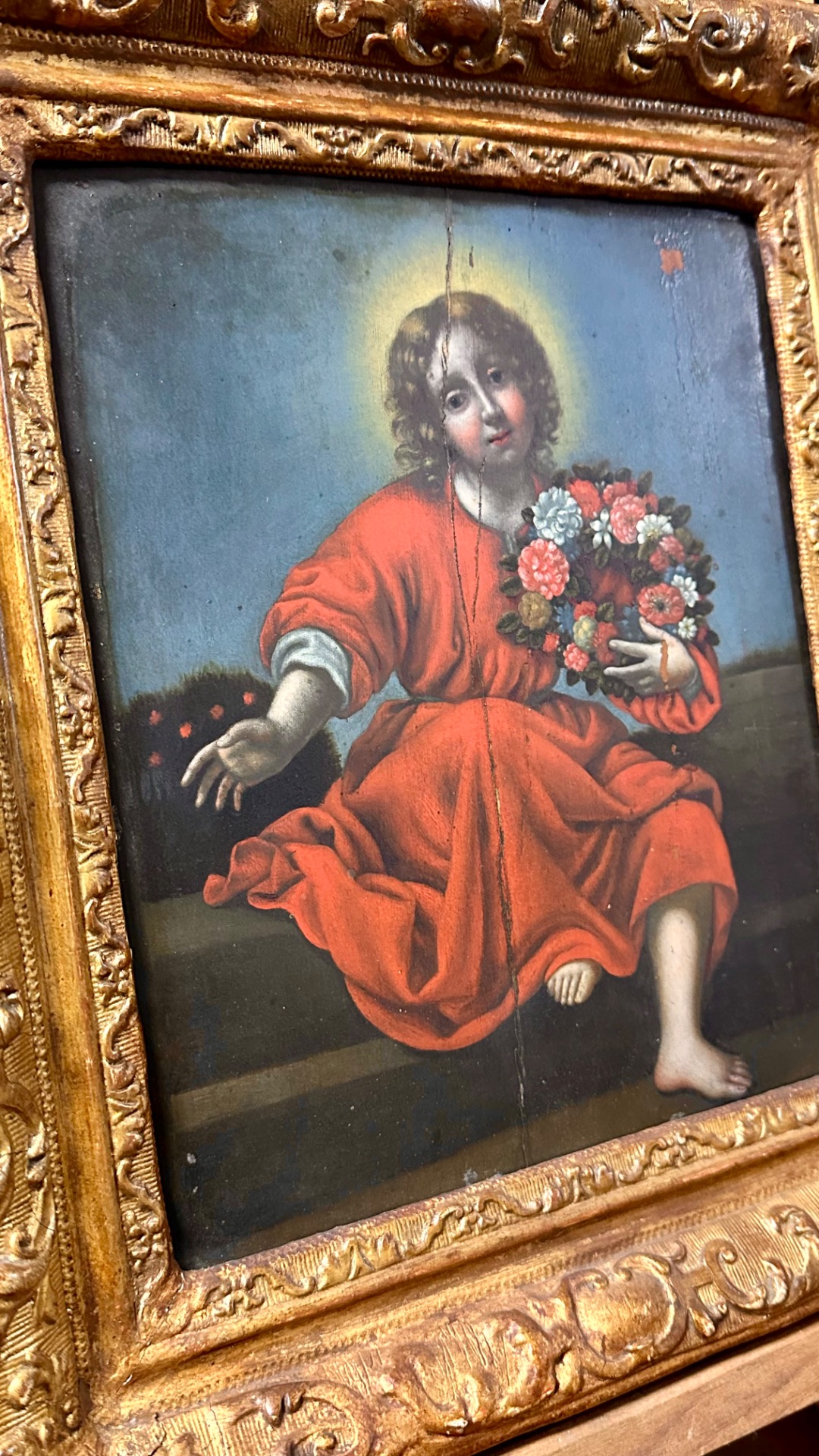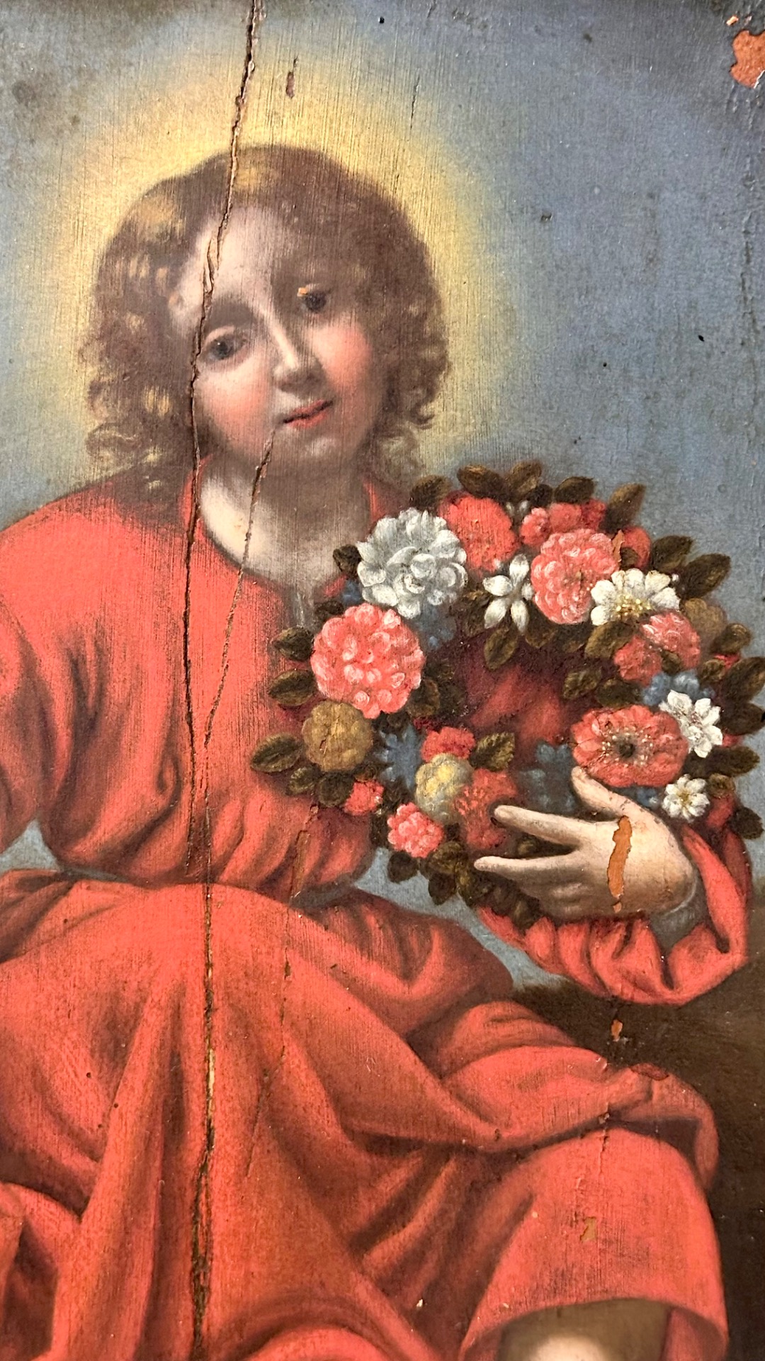 Oil painting on panel “Sacred Image of the Child with Garland of Flowers” - Early 19th century.