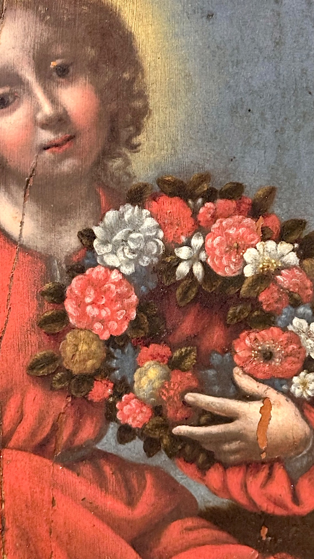 Oil painting on panel "Sacred Image of the Child with Garland of Flowers" - Early 19th century