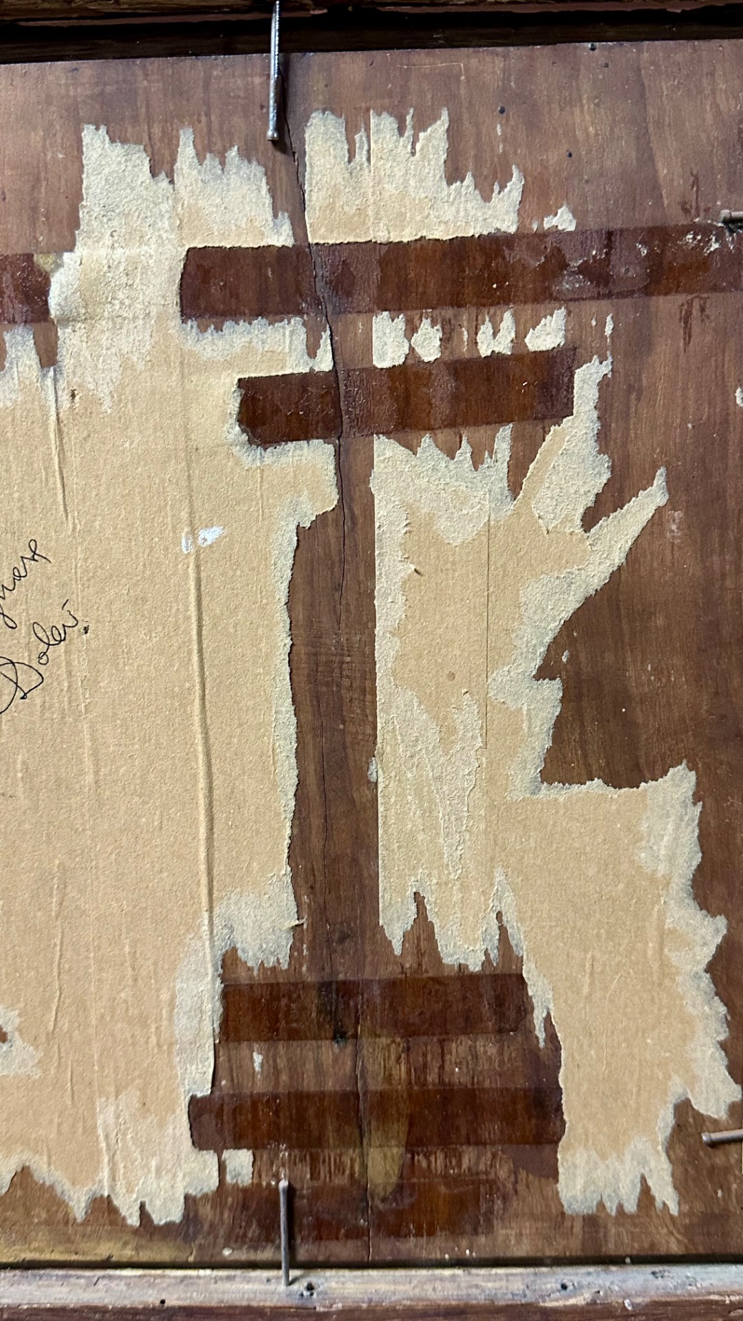 The panel has a vertical split and slight signs of aging that testify to the age of the work without compromising its legibility.