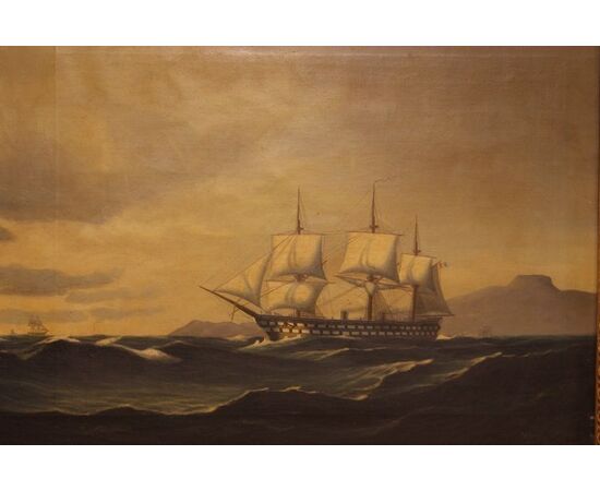 Olio su tela raffigurante in primo piano un veliero in navigazione in mare aperto. In lontananza sulla destra monti, sulla sinistra altre imbarcazioni. Cornice coeva in legno intagliato dorato.