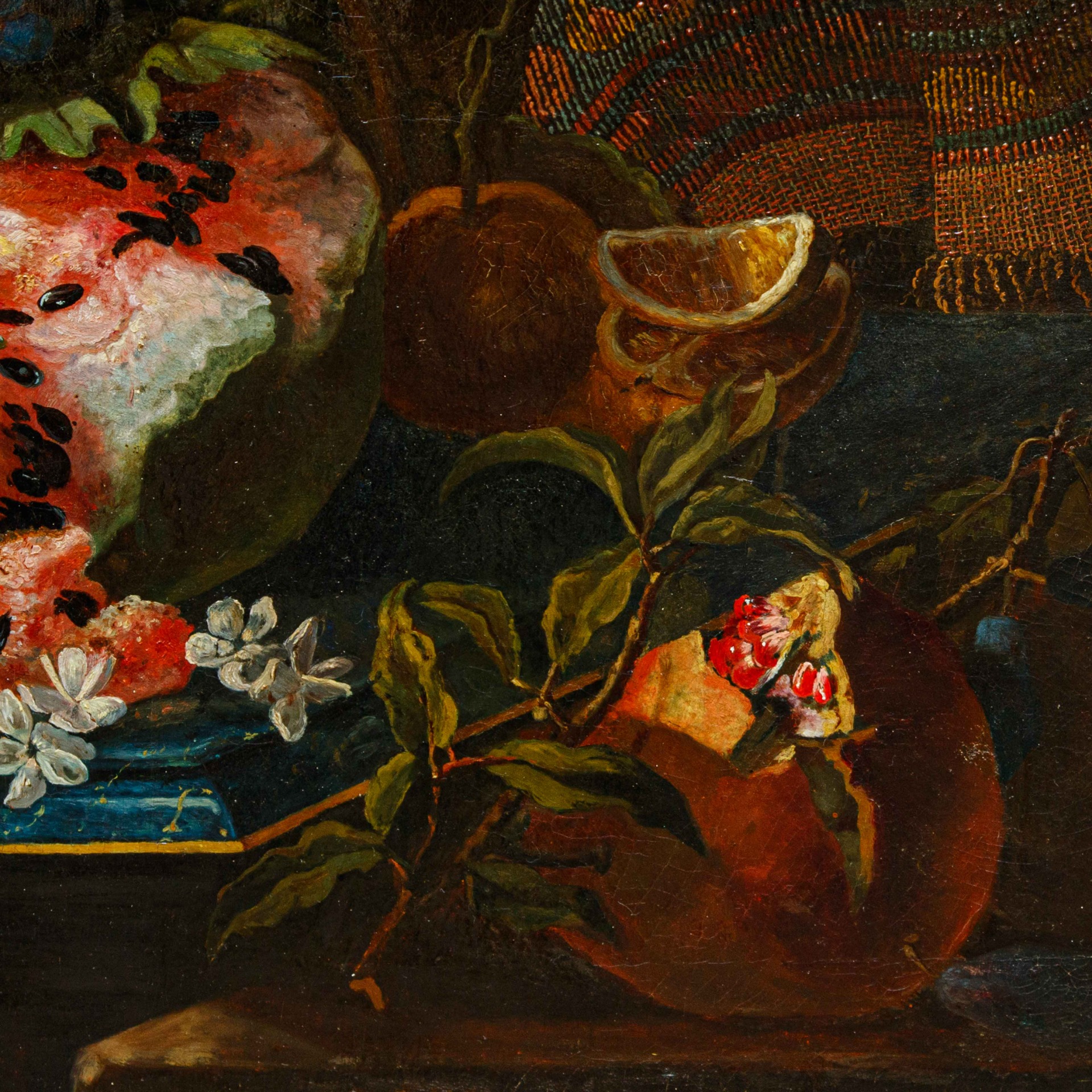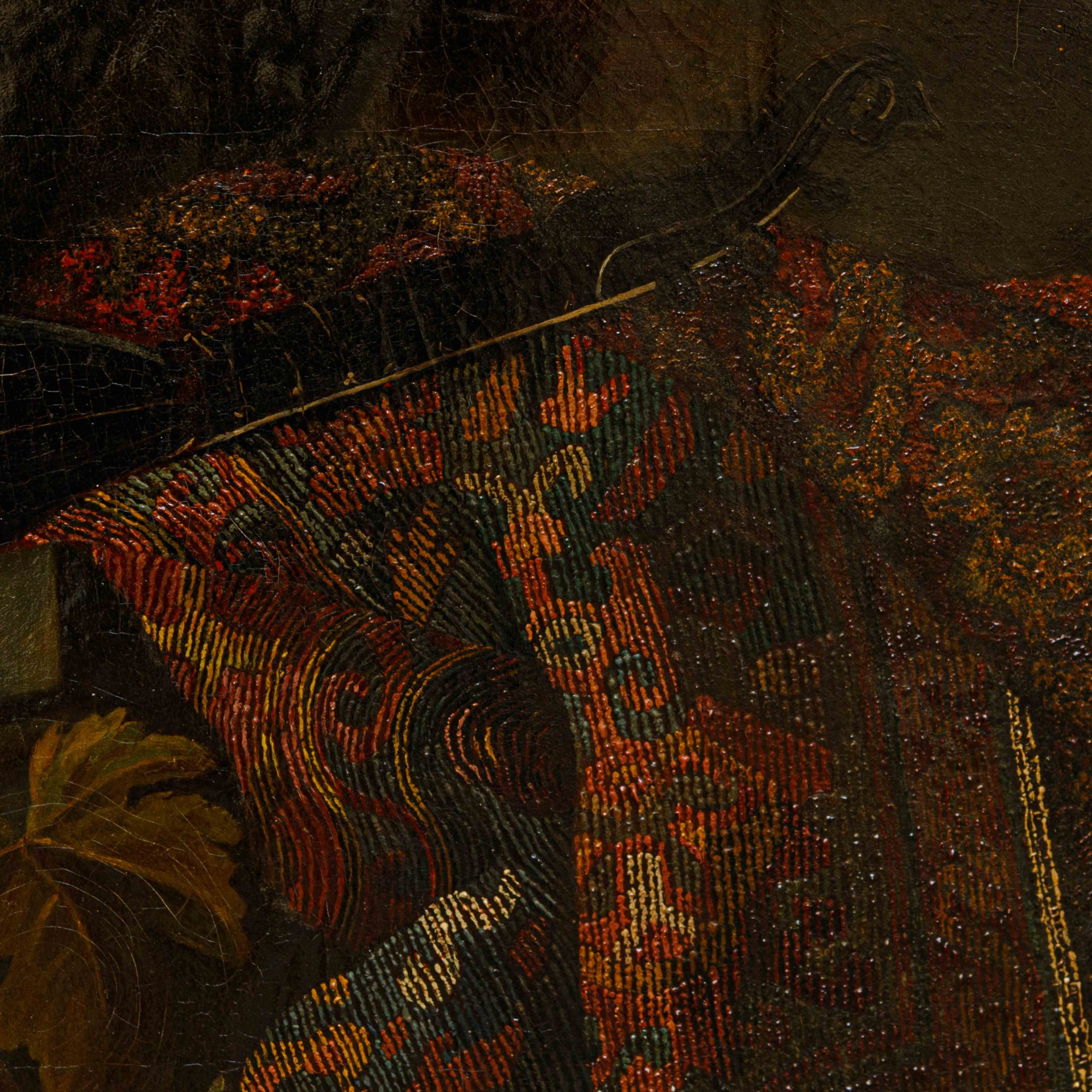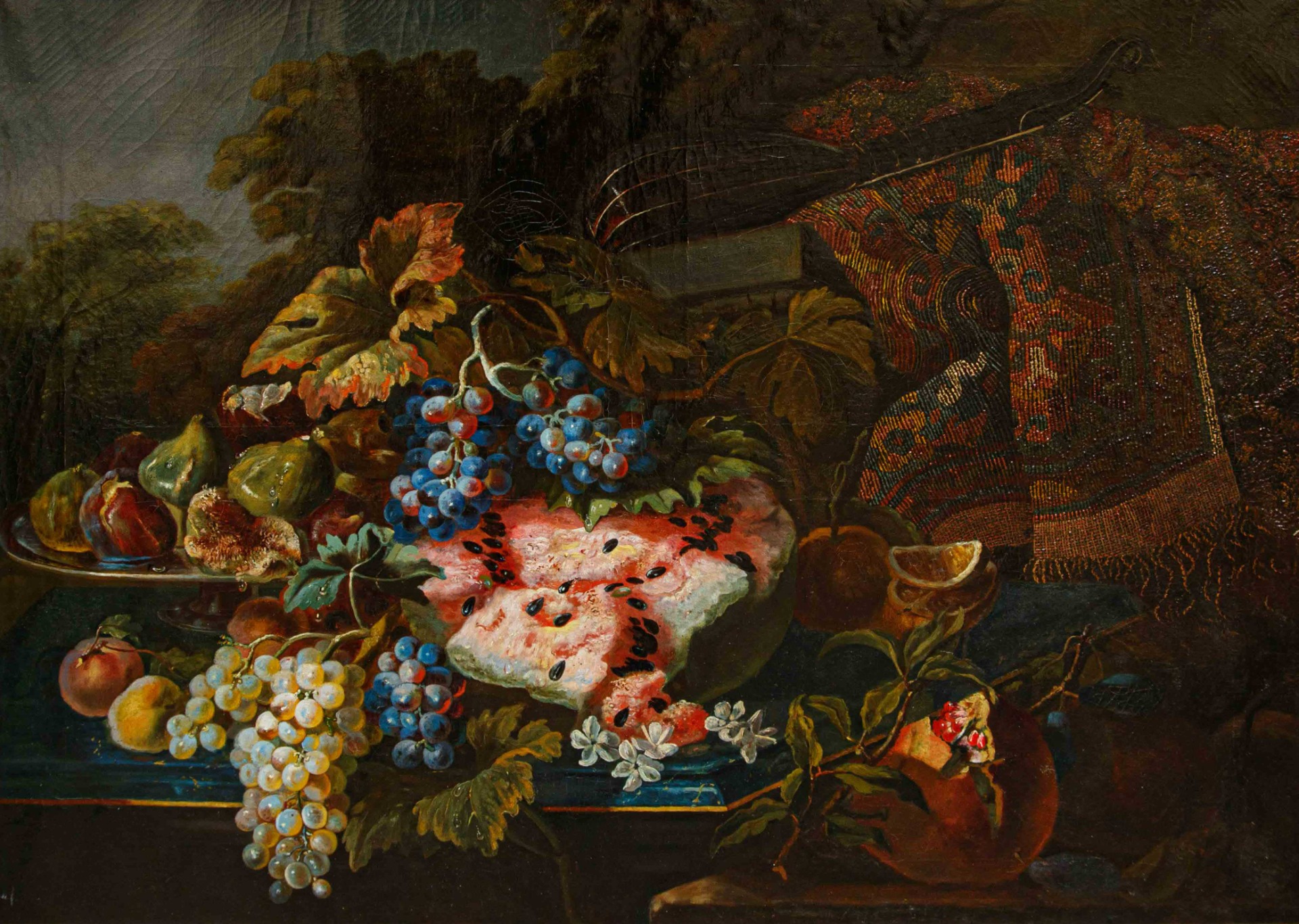The elegant still life under examination presents an orderly fruit banquet accompanied by an elaborate Persian carpet and musical instruments. In a multi-layered composition, one can recognize juicy figs, vine shoots and bunches of grapes, a pomegranate, and finally some lemons.