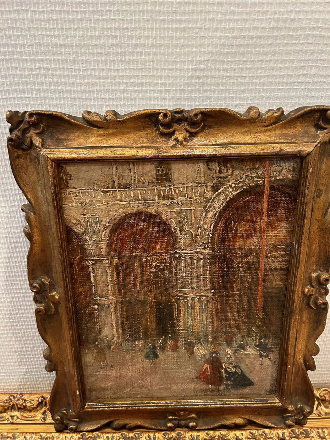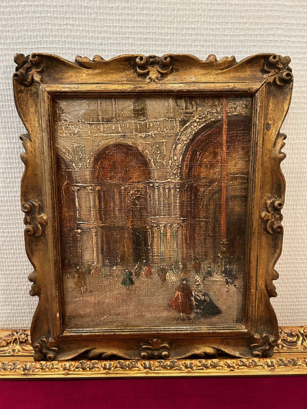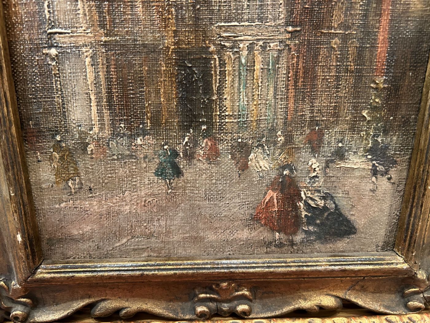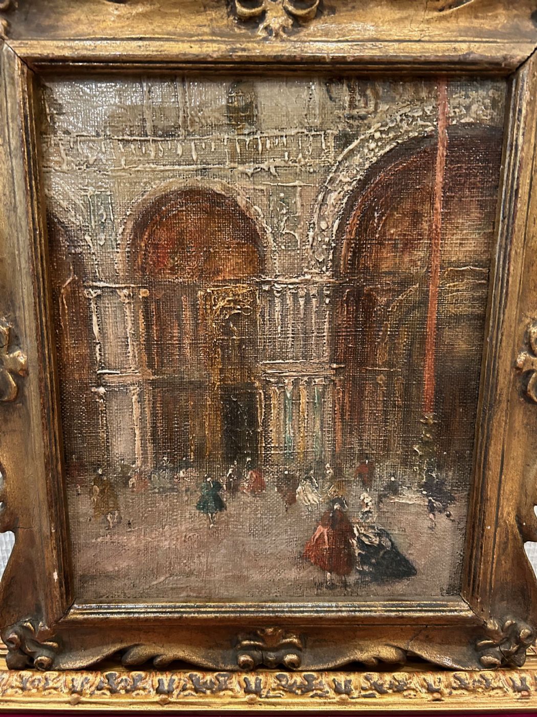 A small expressionist painting depicting a group of masked people in St. Mark's Square in Venice, oil on canvas in the original gilded wooden frame, dimensions: 32cm x 37cm (including frame), Italy, Venice, late nineteenth century.
