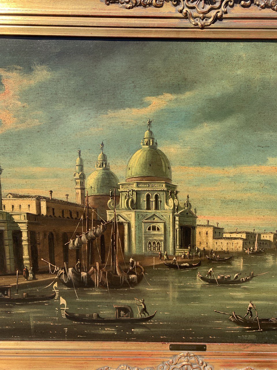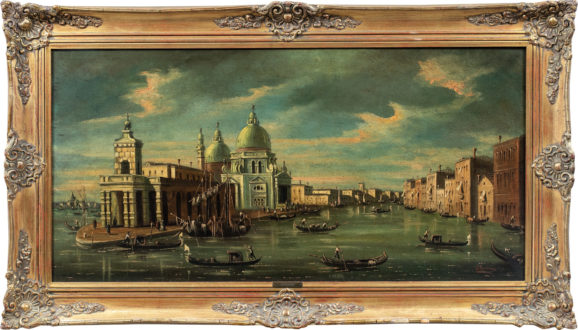 Olio su tela, in cornice in legno intagliato e dorato.