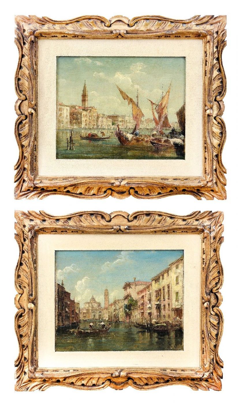 A pair of very fine Venetian views depicting the Giudecca Canal and a glimpse of the Grand Canal. They are two small paintings of exquisite workmanship, executed in the pictorial manner of the Venetian master Giuseppe Ponga, one of the most valid view painters working in Venice between the end of the 19th and the beginning of the 20th century.