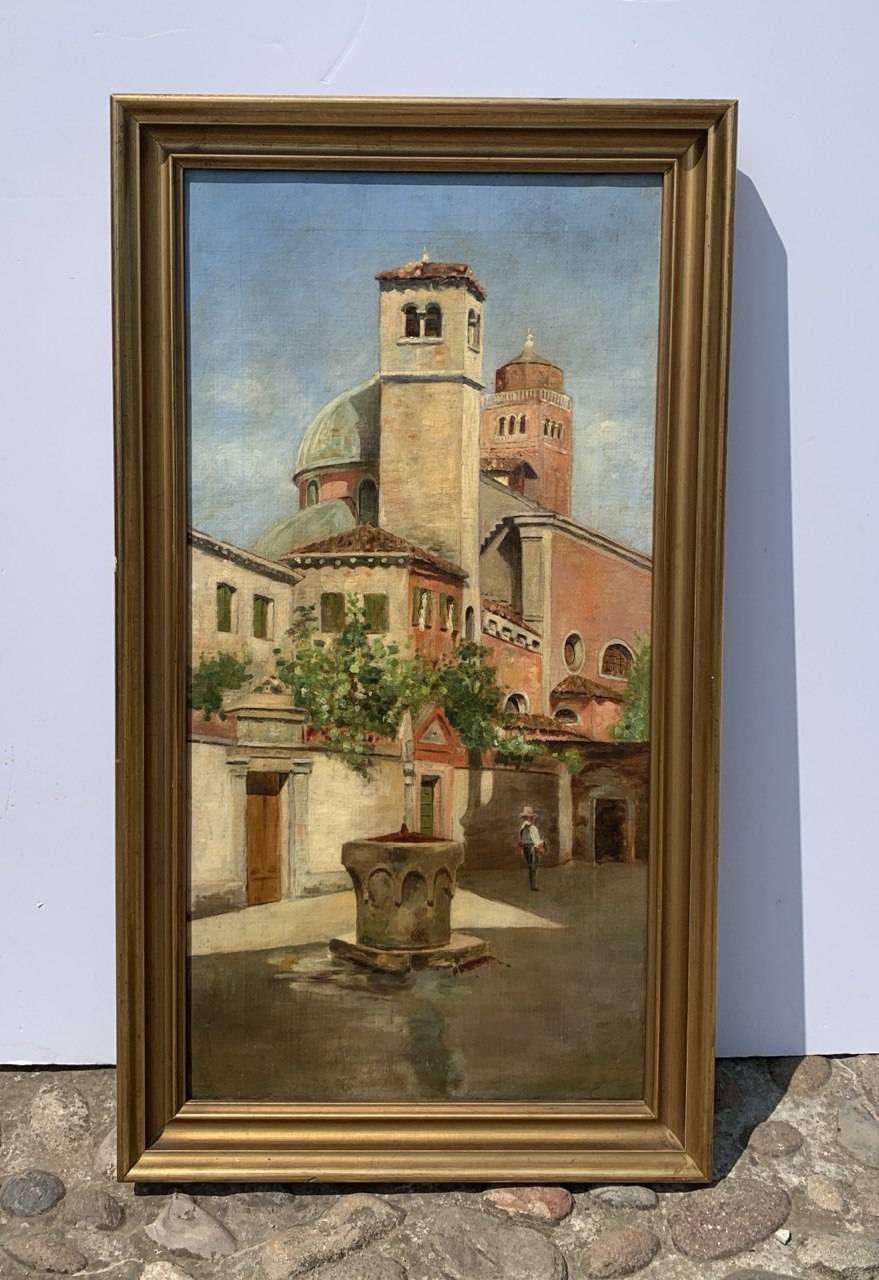Venetian painter (19th century) - Venice, view of the Campiello del le Chiovere towards the church of S. Rocco and the bell tower of S. Maria Gloriosa dei Frari. 73 x 37 cm without frame, 82 x 46 cm with frame. Antique oil painting on canvas, in a gilded wooden frame. Condition report: Lined canvas. Good state of preservation of the painted surface. - All shipments within the EU are free and professionally packaged. - Each item is sold with a certificate of authenticity with legal validity. - Further details on the condition report are available upon request. - Viezzi Arte guarantees quality and professionalism at competitive prices, contact us at info@viezziarte.it or via WhatsApp at +39 3402841279. *Message to non-Italian buyers: Please note that this work has not yet obtained the free export certificate from Italy from the Superintendence of Cultural Heritage. This document certifies that the work is not part of the Italian cultural heritage. Normally, the issuing times for the certificates are 40 days from the appointment date: The new regulation in force since 2021 provides, for amounts declared less than €13,500, shorter times at the discretion of the expert commission. All costs of this operation are included.