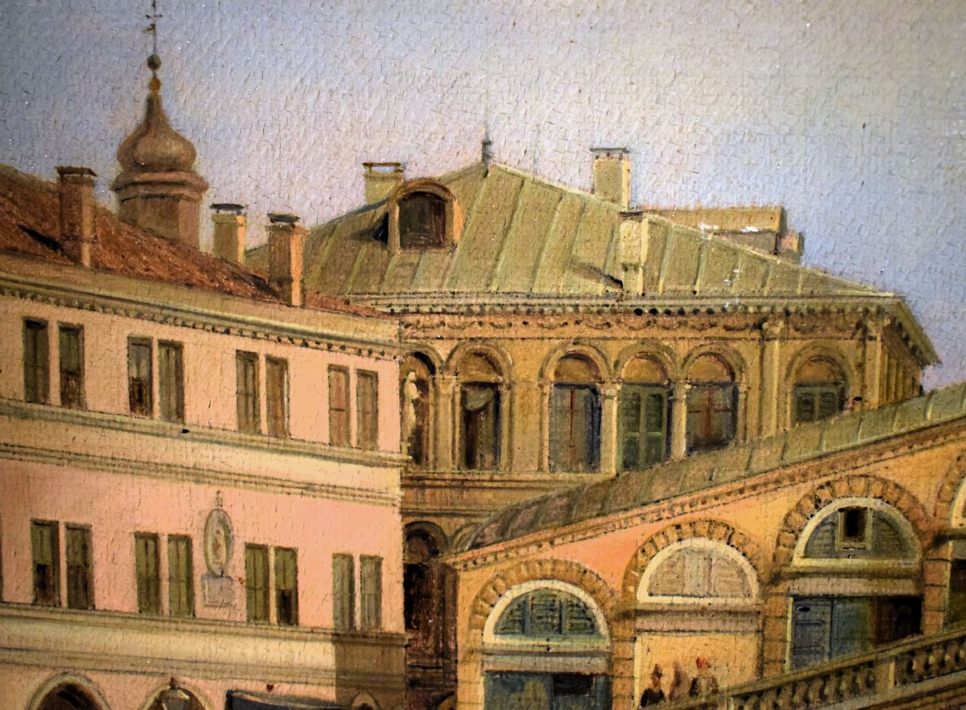 The canvas excellently depicts a wide panoramic view of the Grand Canal crossed by the superb silhouette of the Rialto Bridge. On either side of the bridge, on the two banks of the canal, the famous palaces of the City face each other, aligned and meticulously described with extreme skill in all architectural details, some in full light and others in shadow.