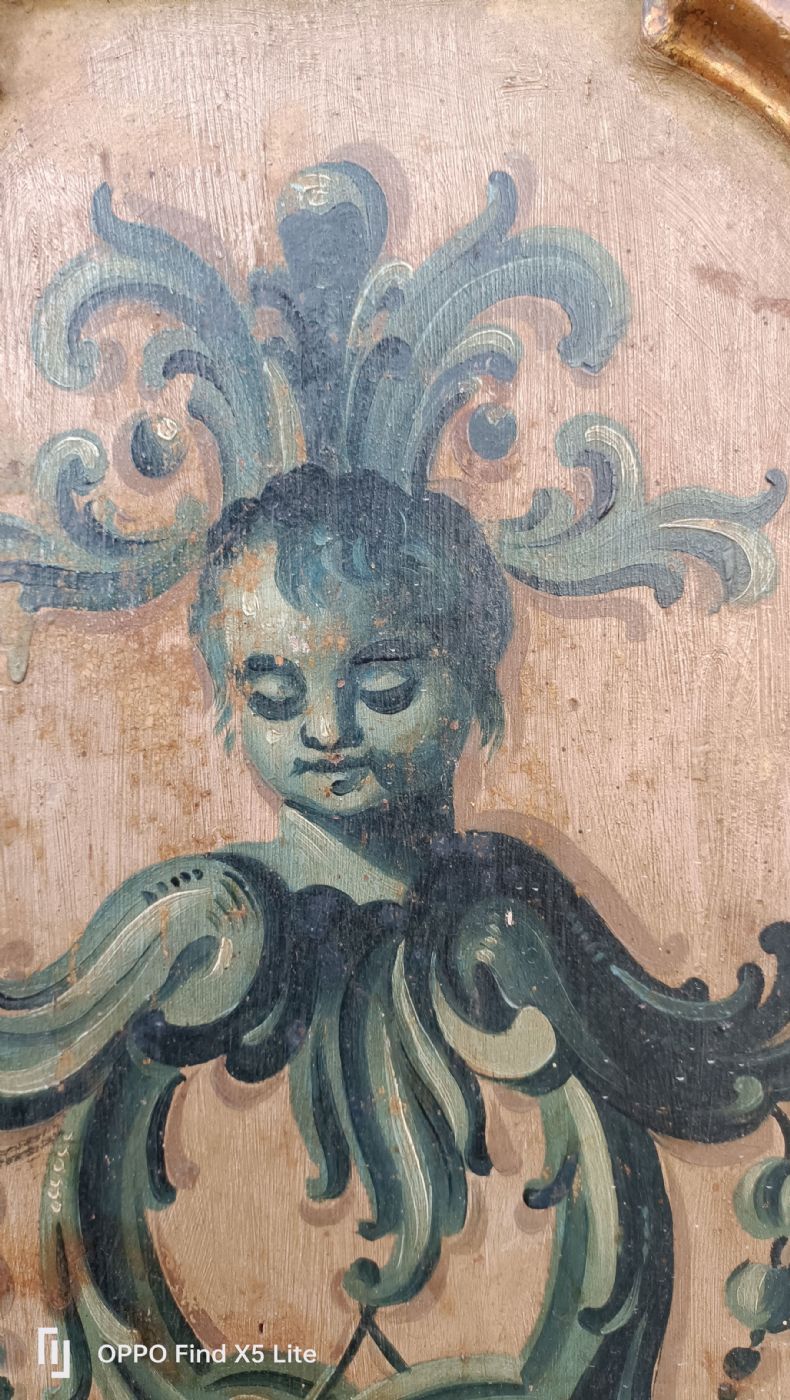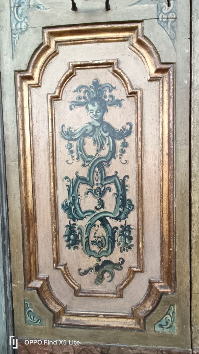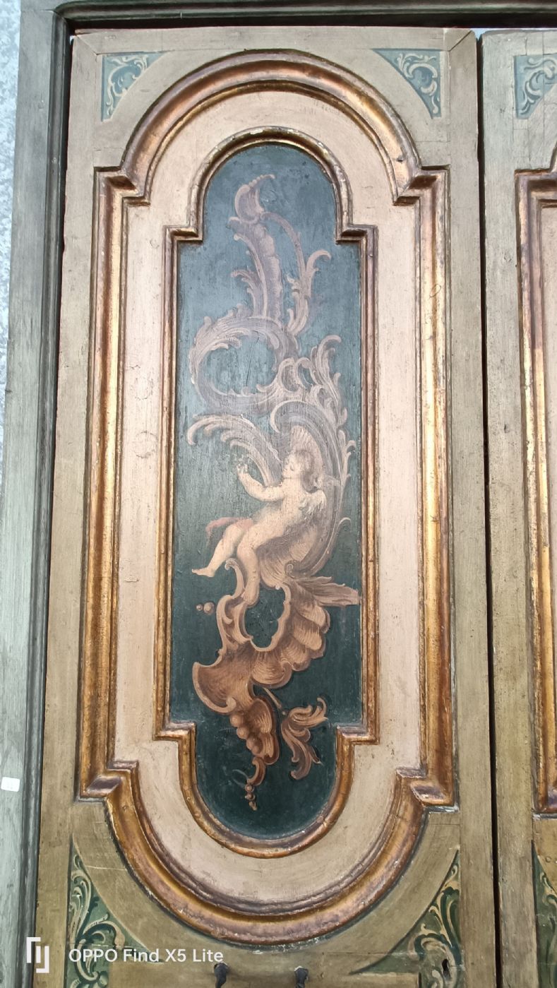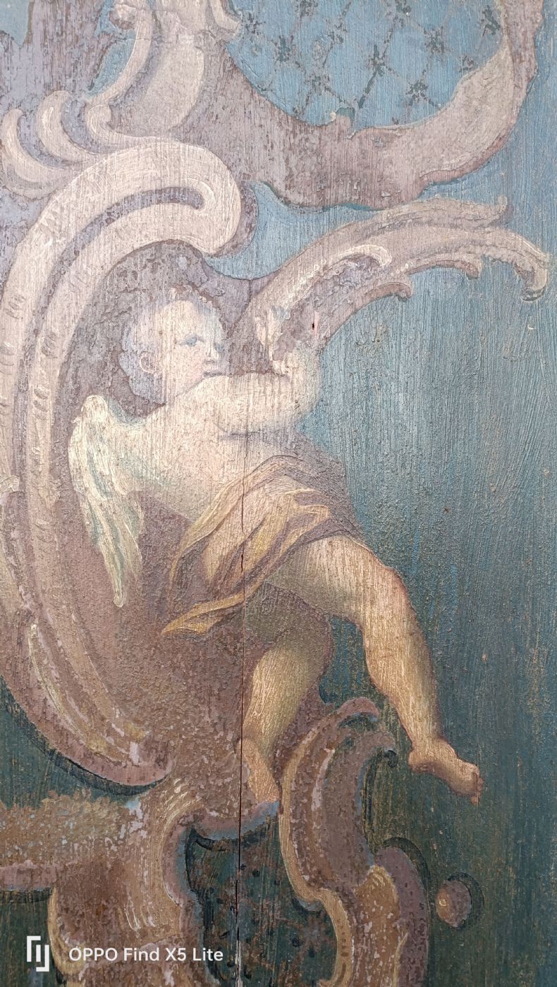 Double-leaf door with gilded frames, featuring paintings of cherubs within floral motifs, and blue angel heads and decorations below. The back has a light monochrome lacquer with frame decorations. The door measurements are: Front Opening Height 227 x 109 wide. Back 229 x 112.