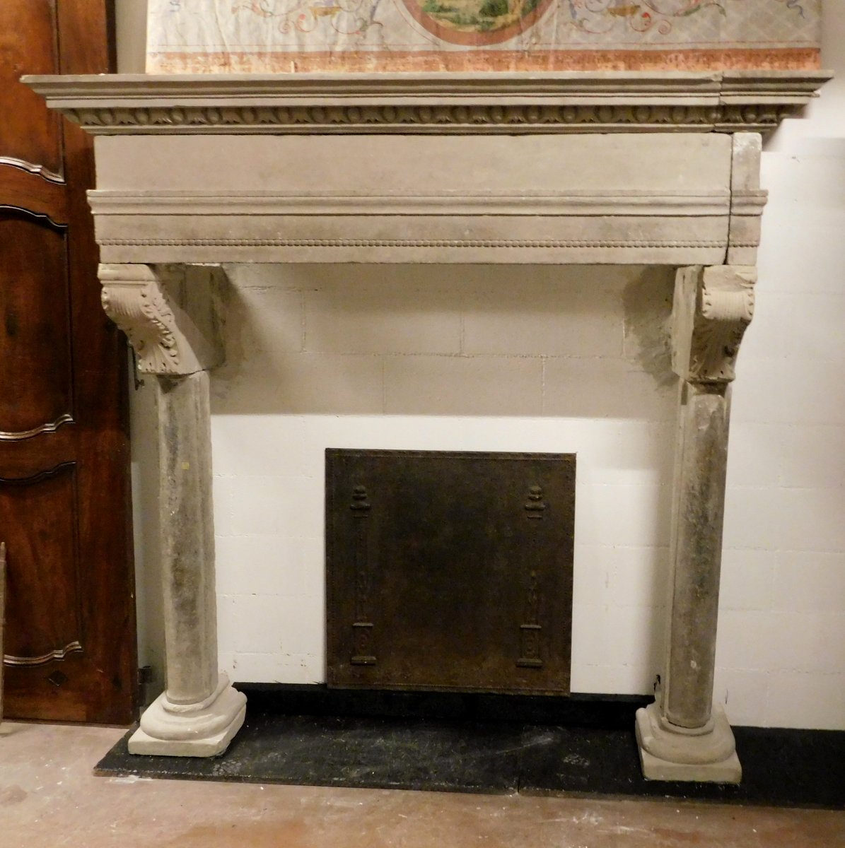CHP266 - Majestic antique fireplace in sandstone. Sandstone is a sedimentary rock composed of granules of varying mineralogical composition, which resemble sand in appearance. The fireplace is richly carved with columns and acanthus leaves. 16th century, from Umbria. It can be completed with various fireplace accessories: fire dogs or ash screen and back plate. Maximum dimensions cm L 196 (top) x H 194, central part width cm 168. The mouth measures cm L 145 x H 148, montant depth cm 36, shelf depth cm 63.