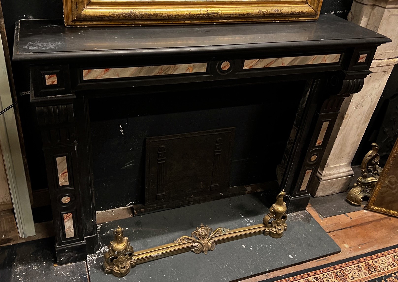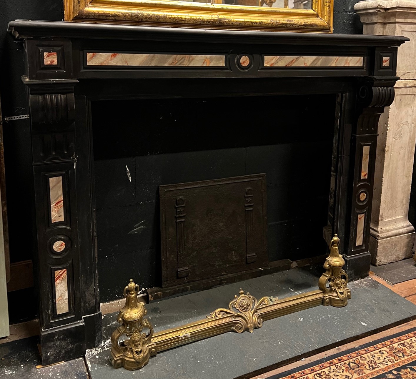 CHM901 - Black marble fireplace with inlays, 19th century, dimensions cm W 144 x D 37 x H 107