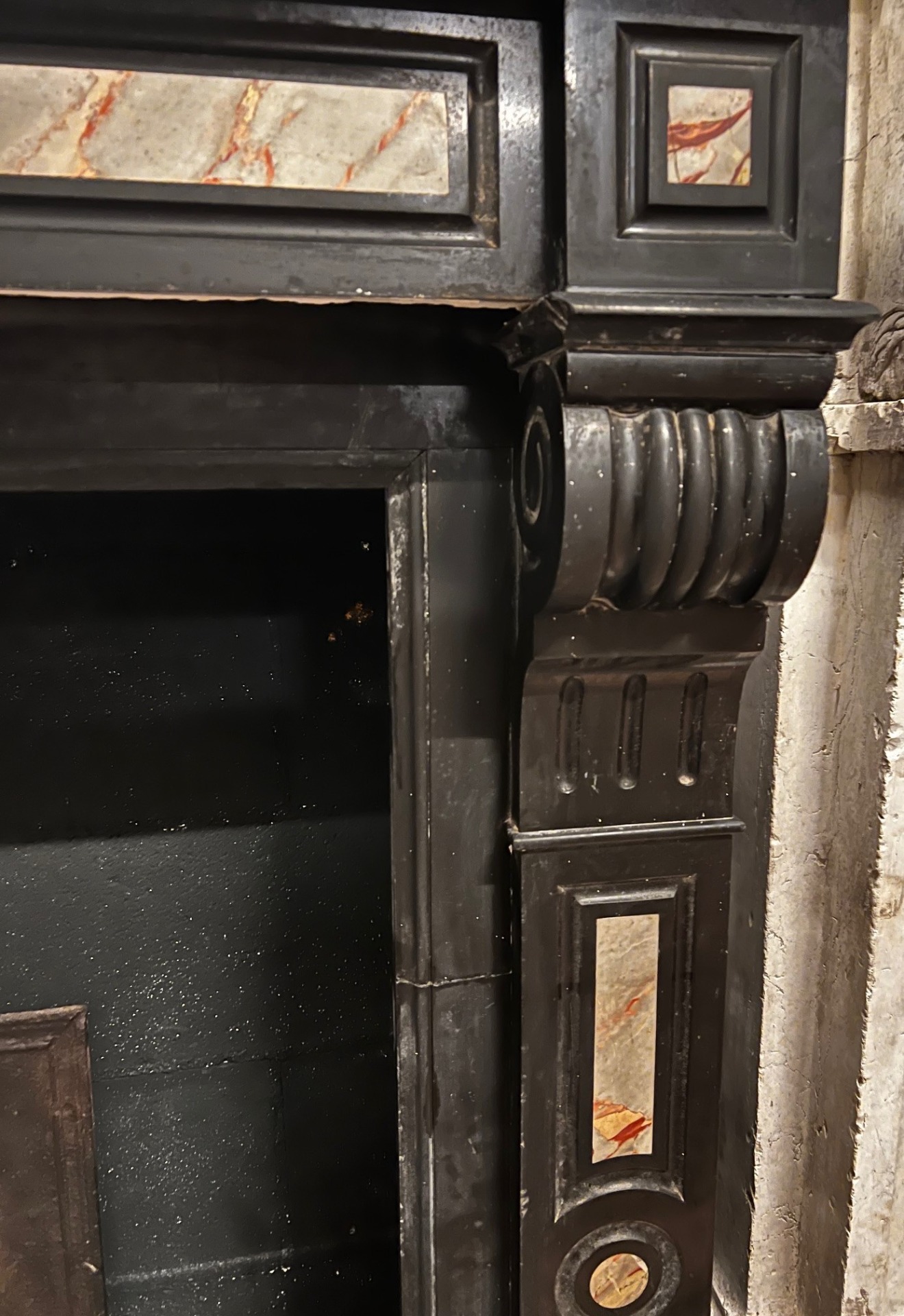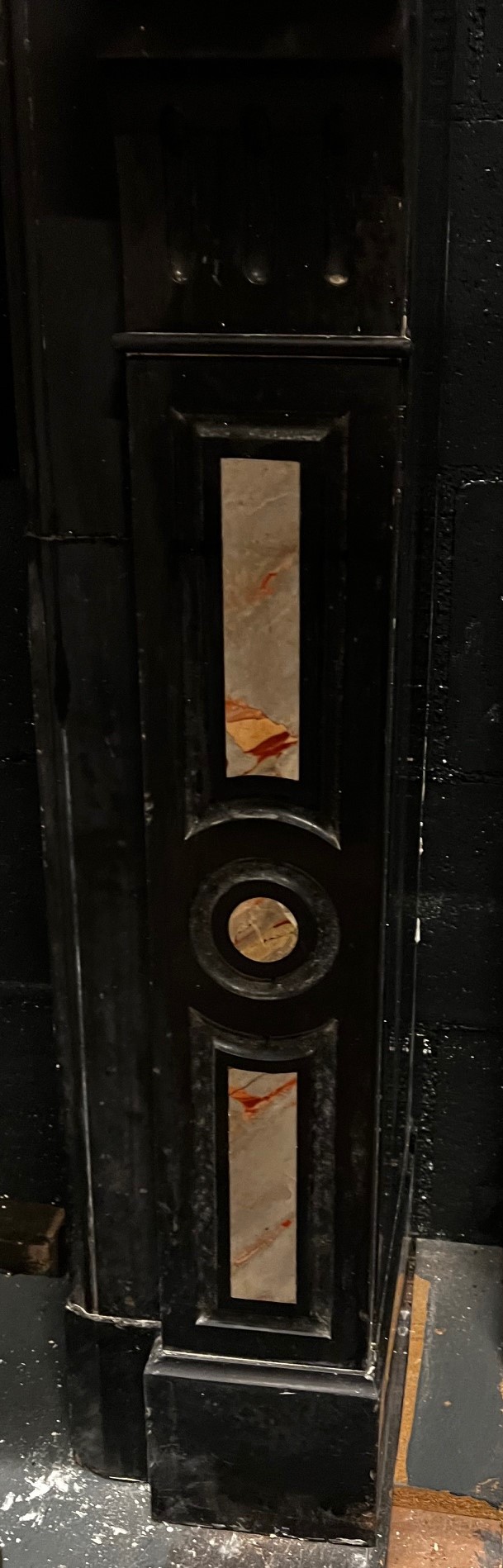 CHM901 - Black marble fireplace with pink marble inlays.