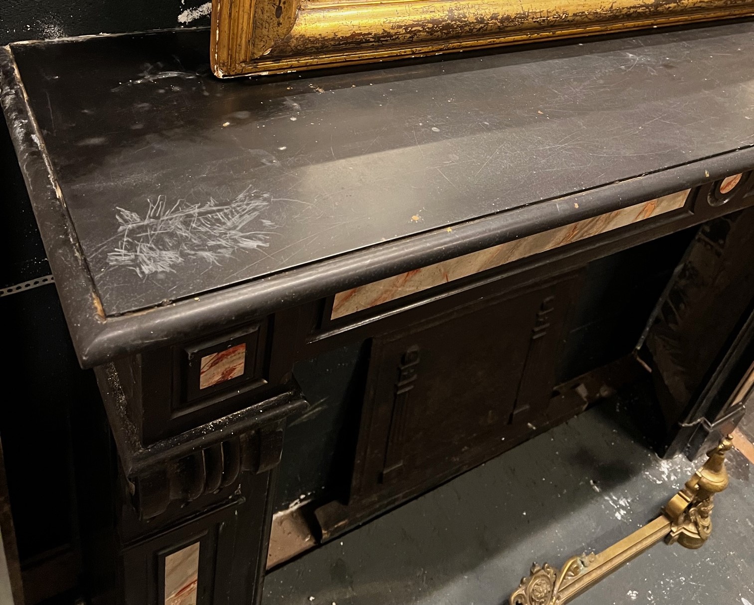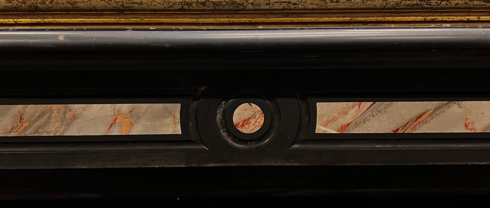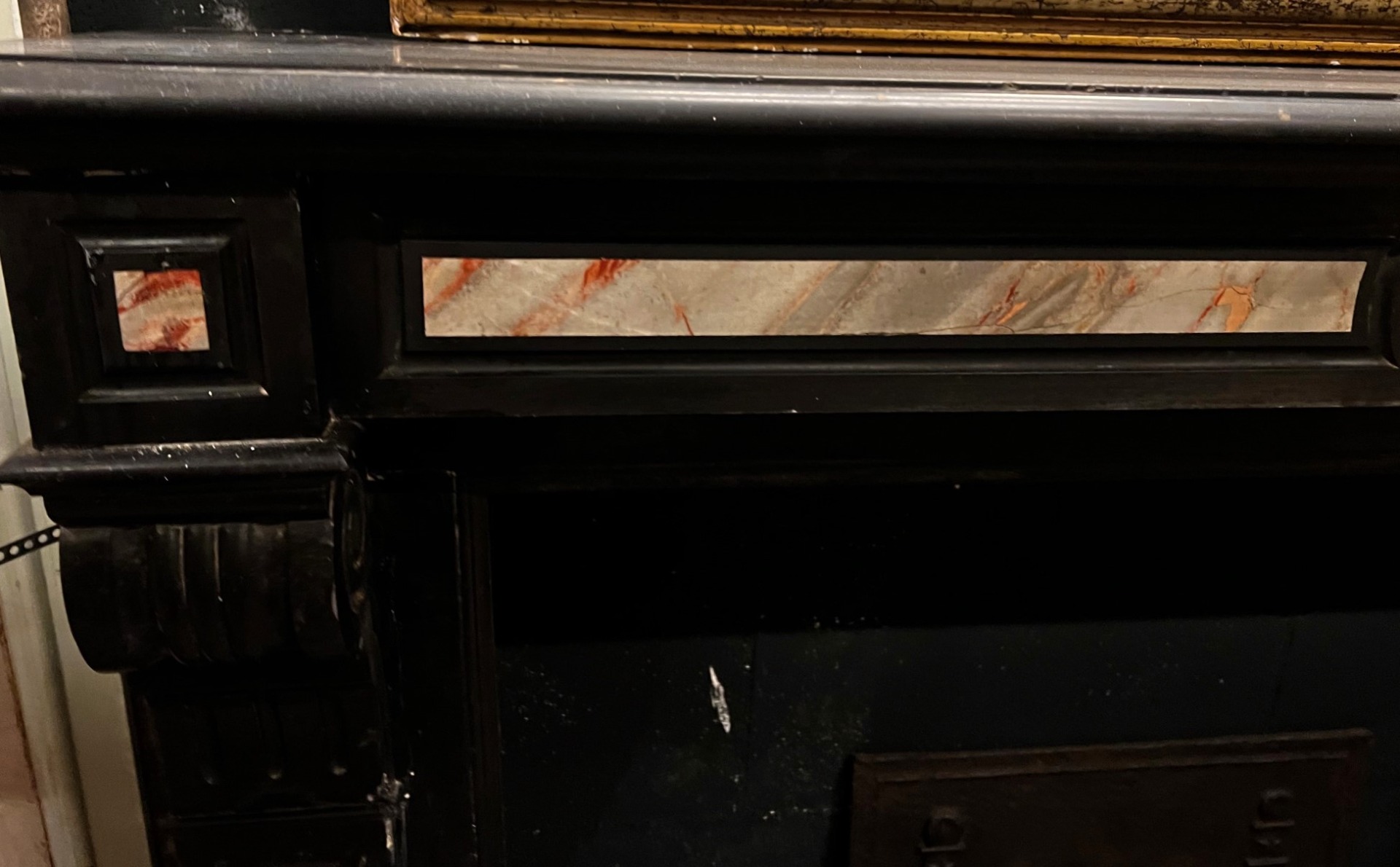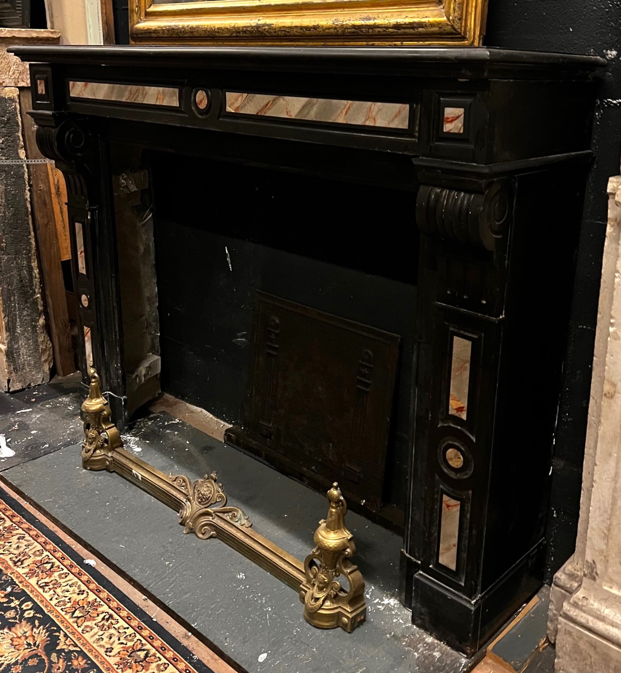 CHM901 - Camino in marmo nero con intarsi, epoca '800, misure cm L 144 x P 37 x H 107
