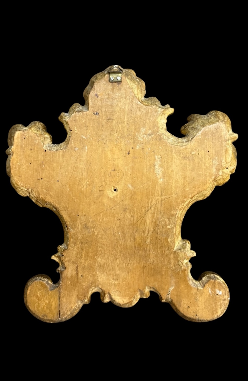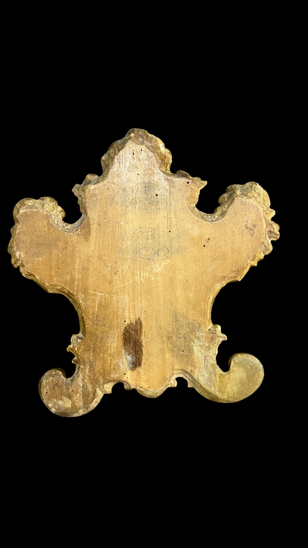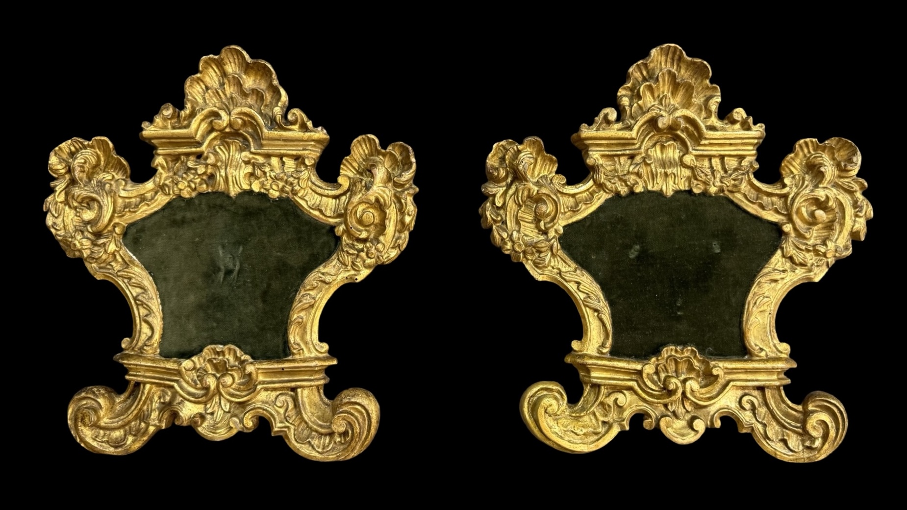 Coppia di cartaglorie in legno intagliato e foglia oro con decoro a conchiglie,motivi rocaille e elementi vegetali stilizzati.Cm 30x27.Luce:cm 16x12.