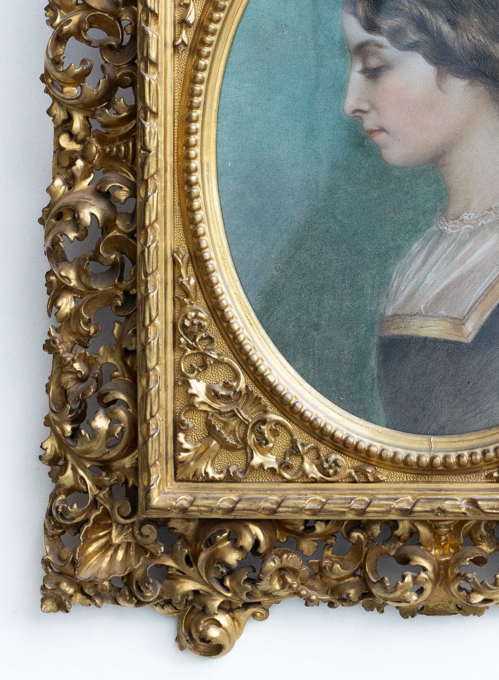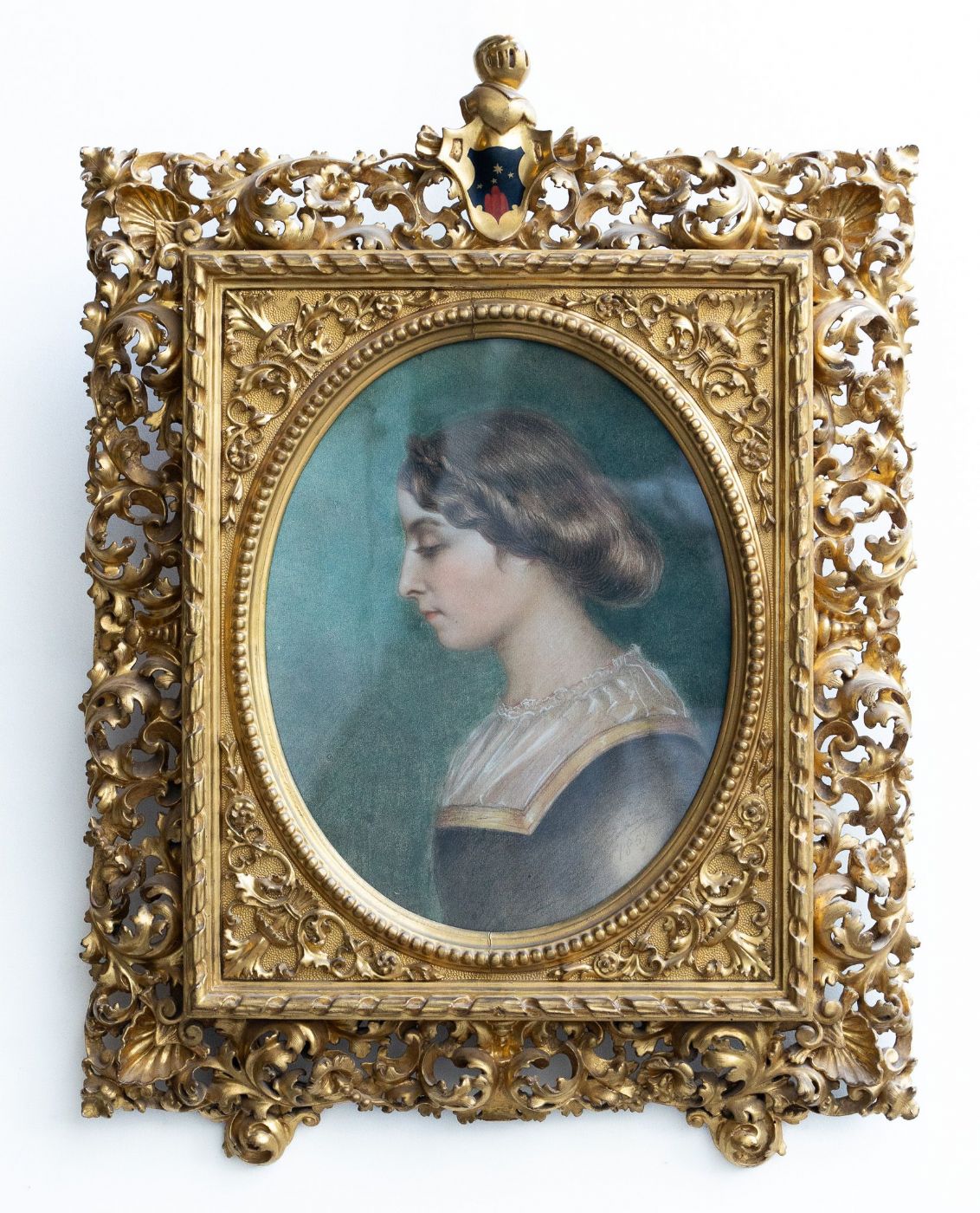 Wonderful carved and gilded wooden frame from the 19th century Size: 73 x 98 cm. Provenance: private collection in Lucca Description: Splendid 19th-century frame, finely inlaid, embellished with a heraldic coat of arms at the top, testimony to its ancient belonging to a noble family, which increases its elegance, history, and uniqueness. The frame, perfectly preserved, frames a delicate pastel dated 1857 depicting the profile of a woman with sweet and elegant features, with her hair up, an expression of grace and refinement typical of the period. The drawing represents a refined example of 19th-century portraiture and harmonizes with the precious frame, which alone constitutes an object of great aesthetic and historical value. A perfect piece for collectors and enthusiasts of art and antiques, capable of enriching any environment with its timeless charm. Code: 344 Additional information: The work is available in our exhibition space in Badia Polesine (RO) and is sold with a certificate of authenticity. We take care of and organize the transport of purchased works, both for Italy and abroad, through professional and insured carriers. Contact us for any information, we will be happy to answer you: +393351010528; artearredoandriollo@gmail.com We also advise you to consult our website https://www.artearredoandriollo.it/ and our social profiles: https://instagram.com/artearredoandriollo?igshid=YmMyMTA2M2Y= https://www.facebook.com/Arte-Arredo-Andriollo-681724861934185/