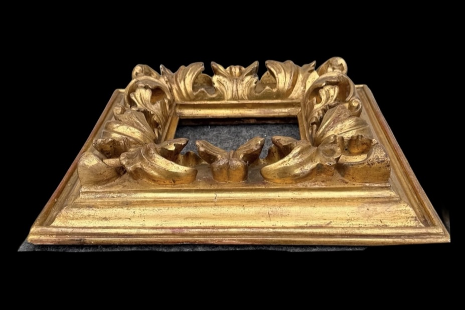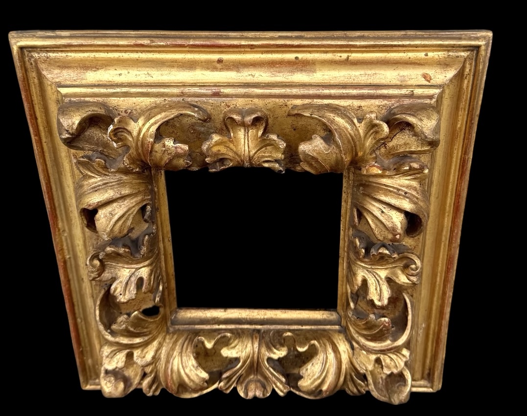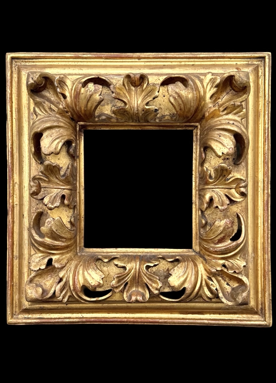 Carved and gilded wooden frame with a stylized leaf motif. Cm 33.5x32.5. Light: cm 14.5x13.5. Rear rebate: cm 16.4x15.2.