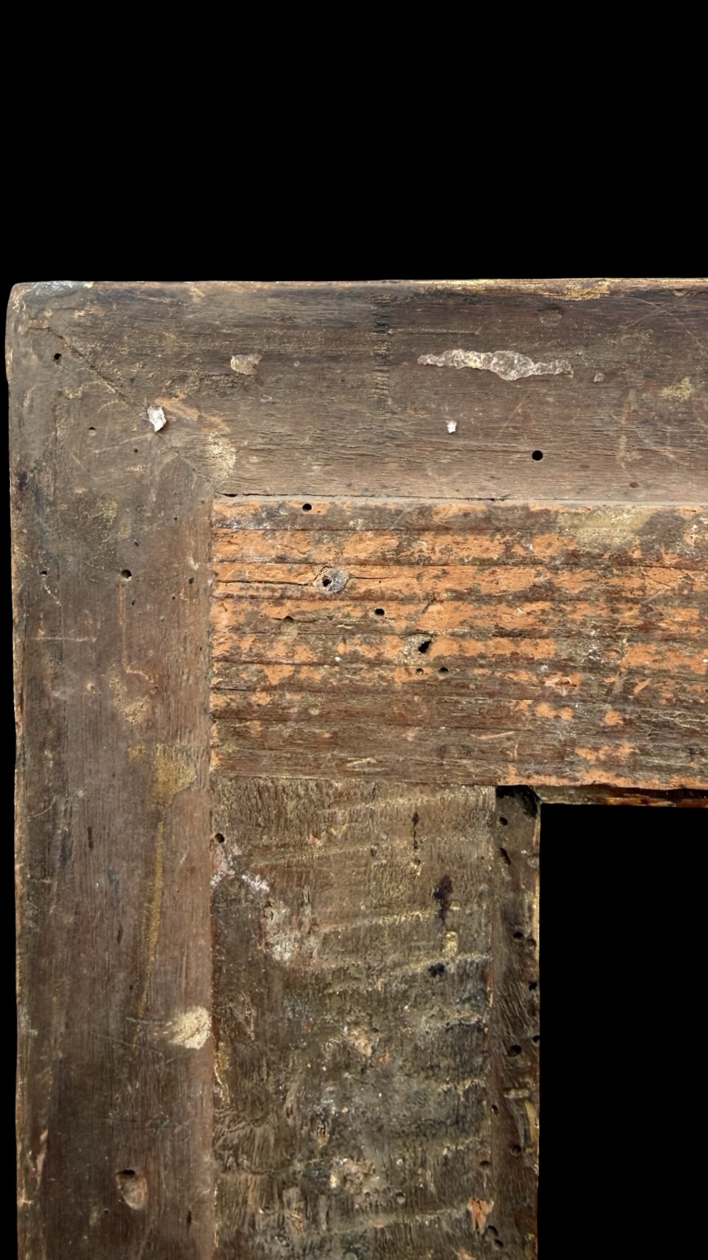 Carved and gilded wooden frame with a stylized leaf motif. Cm 33.5x32.5. Light: cm 14.5x13.5. Rear rebate: cm 16.4x15.2.