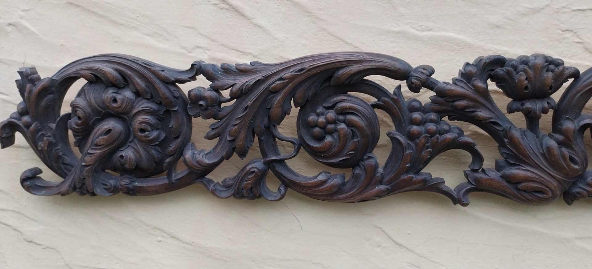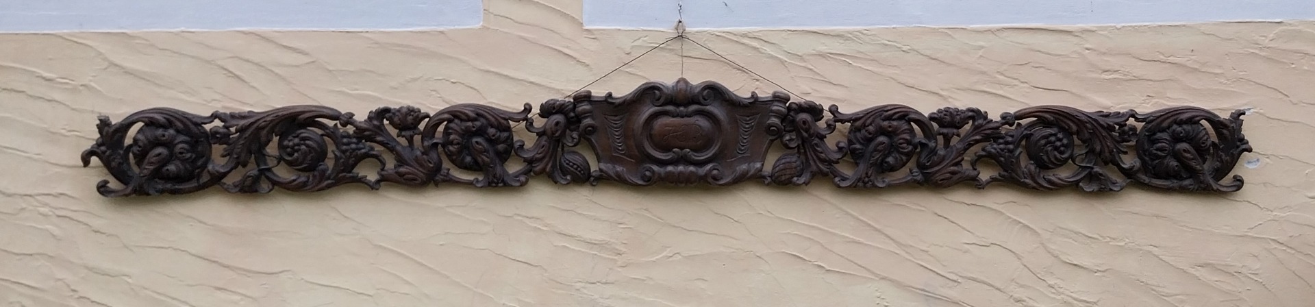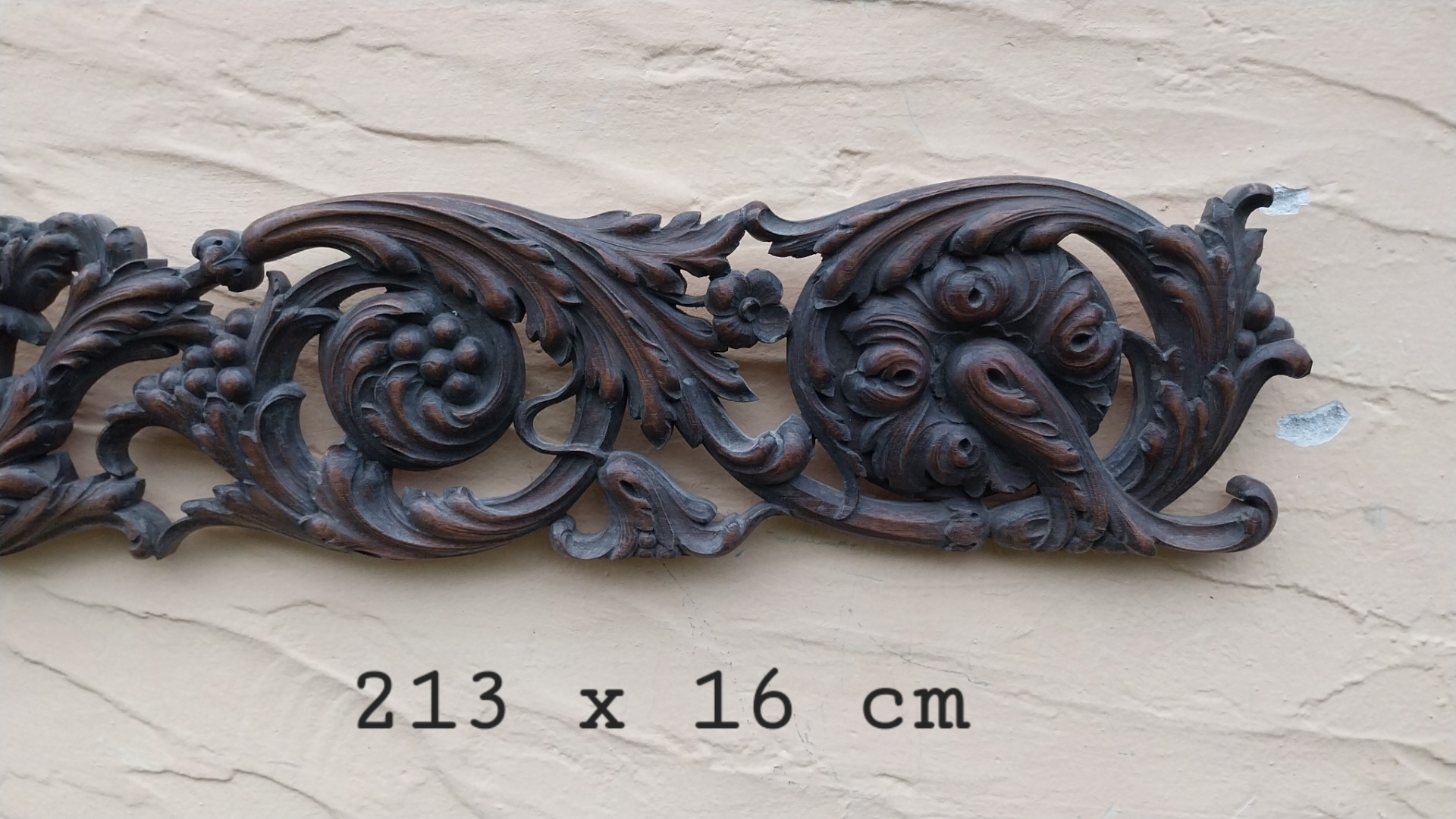 Carved decoration in walnut wood. Fine and delicate workmanship and beautifully hand-sculpted. Ornament made in Renaissance style in the late 1800s or early 1900s. Perfect state of preservation. Beautiful quality work. Dimensions: 213 cm length and 16 cm height plus the central part a little higher. The decoration is divided into 3 parts.