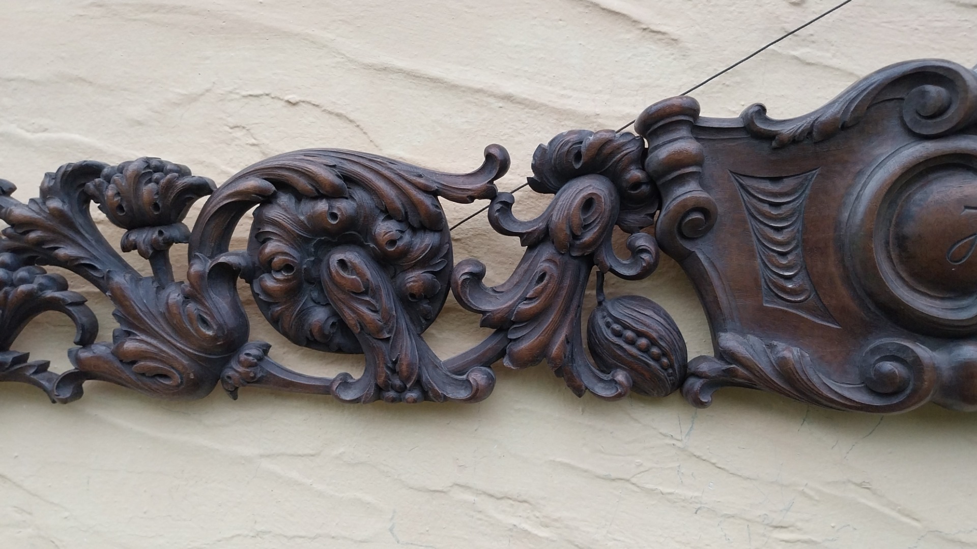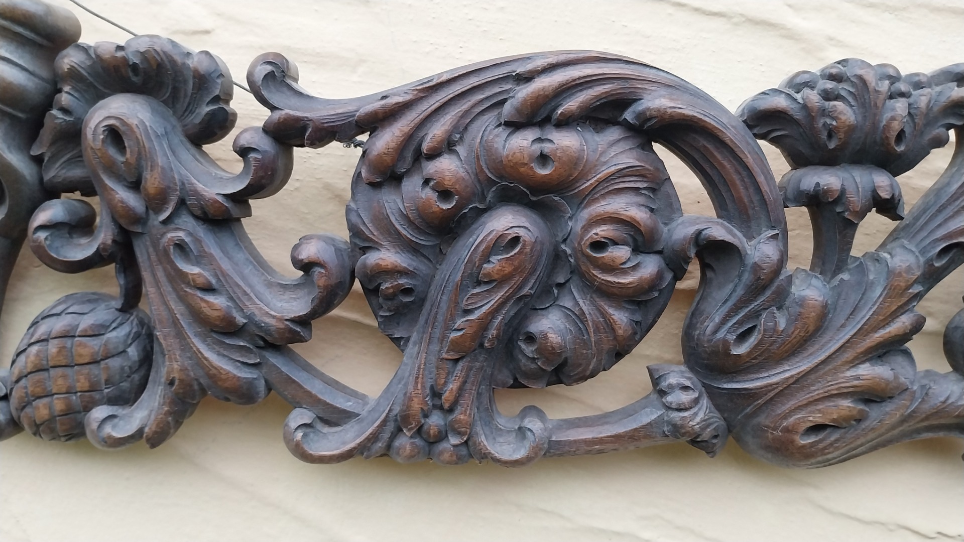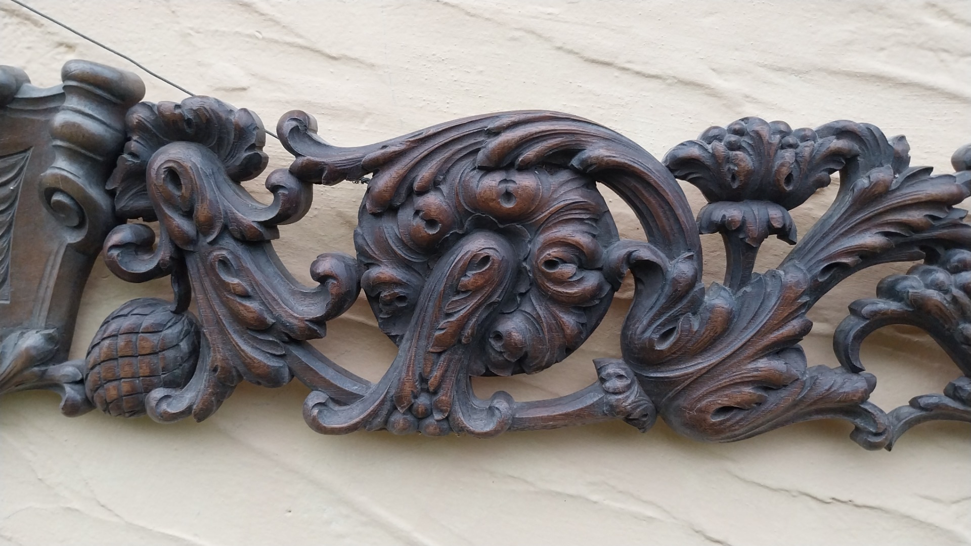 Carved decoration in walnut wood. Fine and delicate workmanship and beautifully hand-sculpted. Ornament made in Renaissance style in the late 1800s or early 1900s. Perfect state of preservation. Beautiful quality work. Dimensions: 213 cm length and 16 cm height plus the central part a little higher. The decoration is divided into 3 parts.