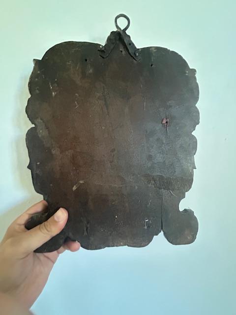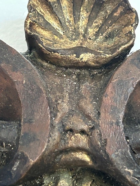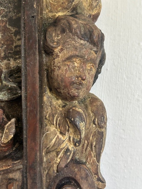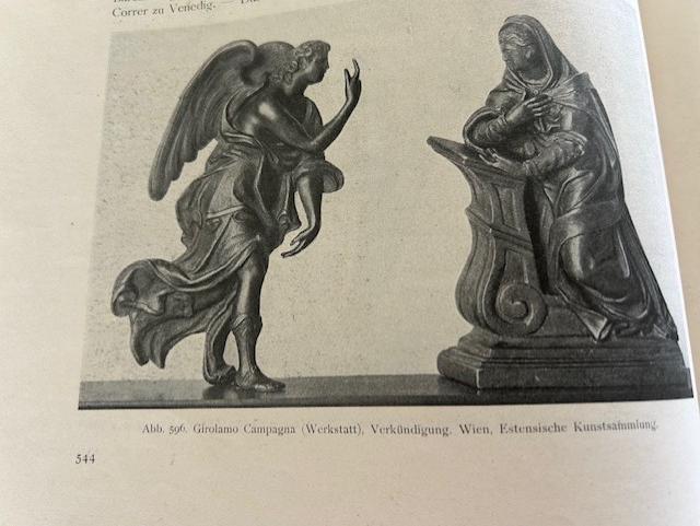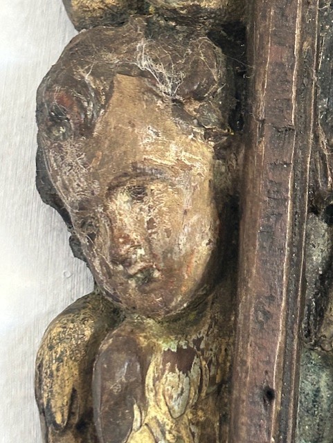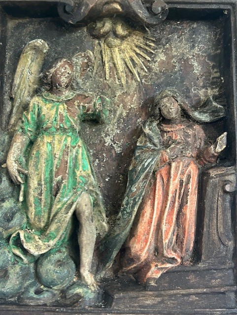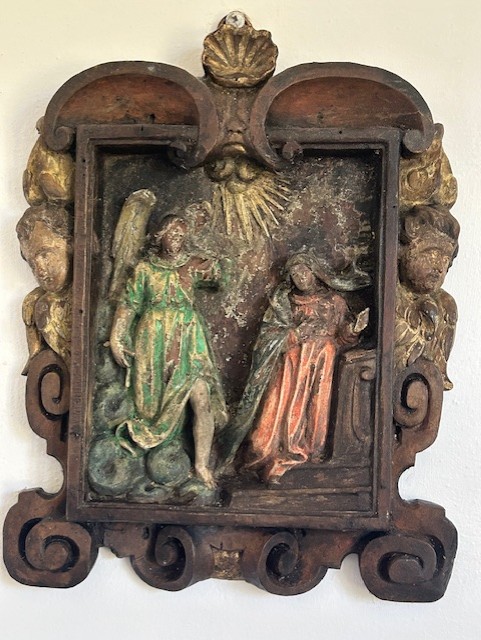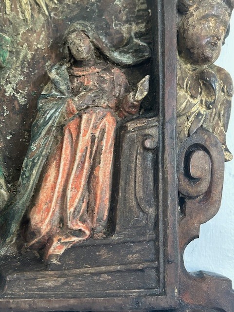 Inside, the Annunciation. Polychromy with color losses. In the style of Girolamo Campagna, Venetian sculptor 1550 - 1625.