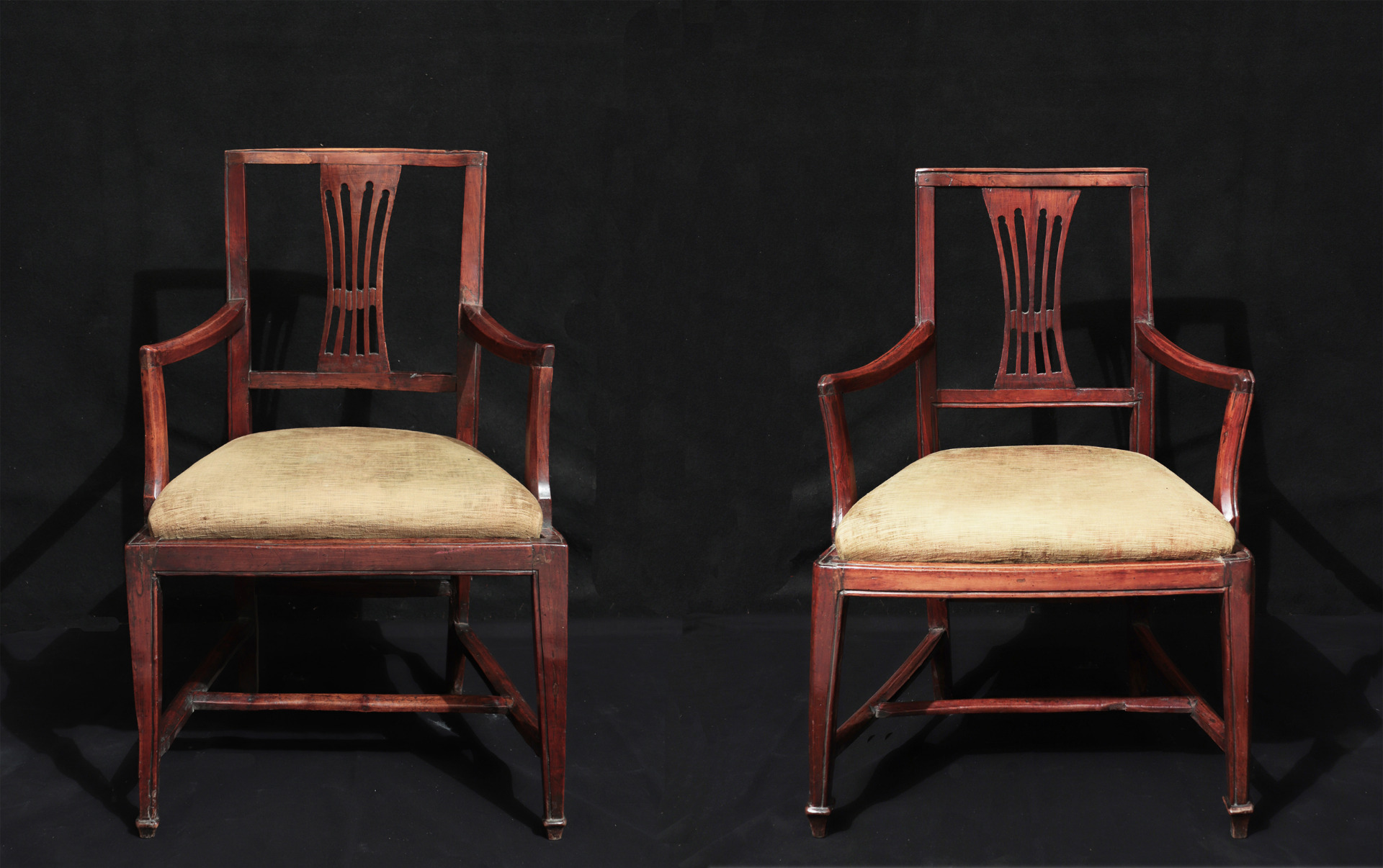 Two elegant Venetian armchairs with a folder-shaped backrest. Very similar to each other, almost a pair, they differ in small details.