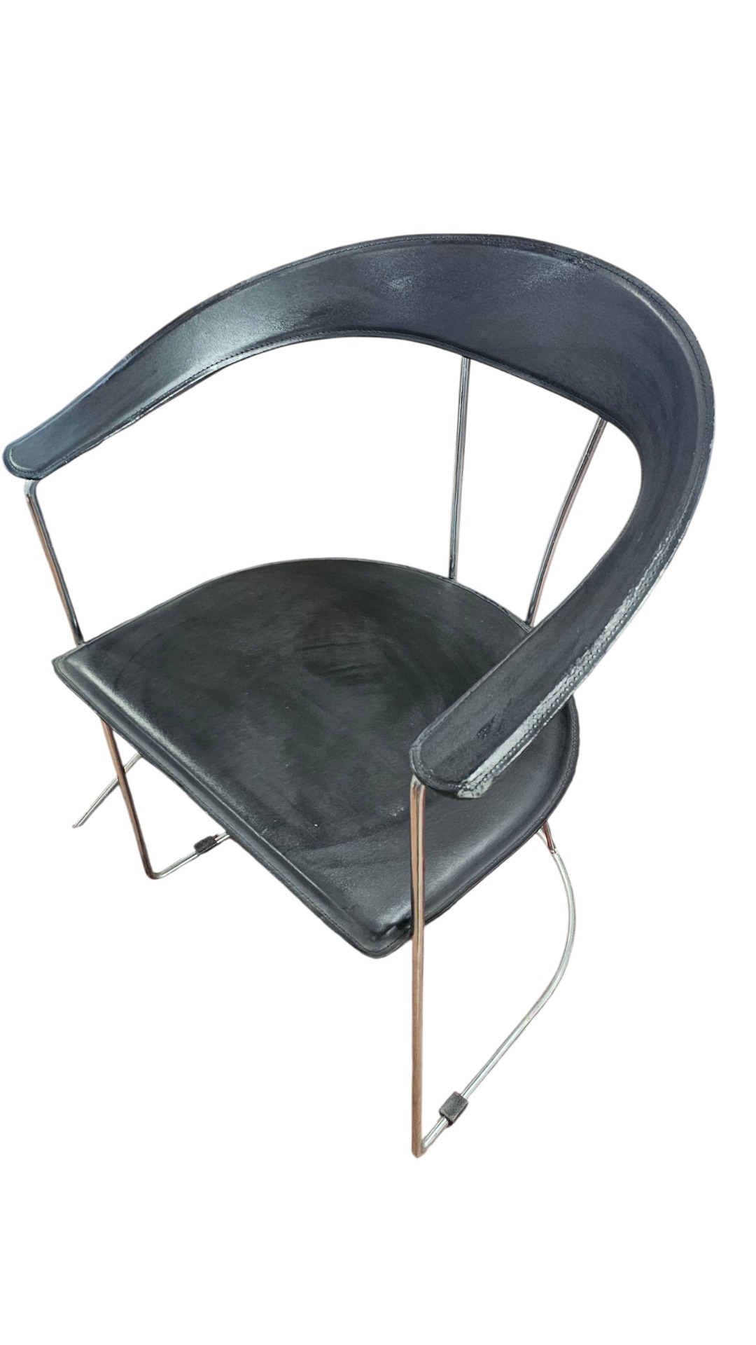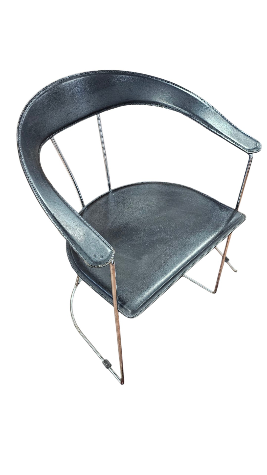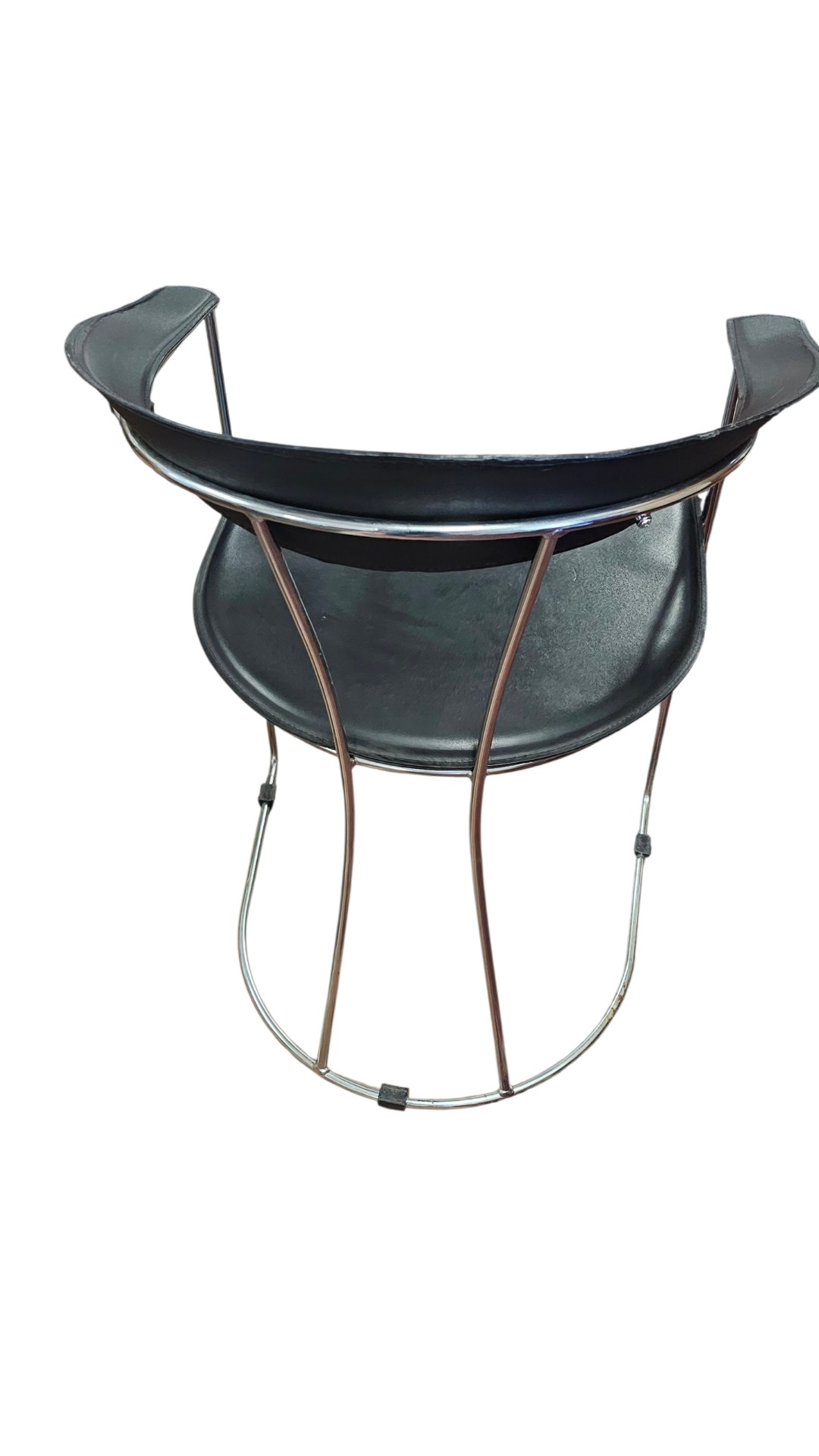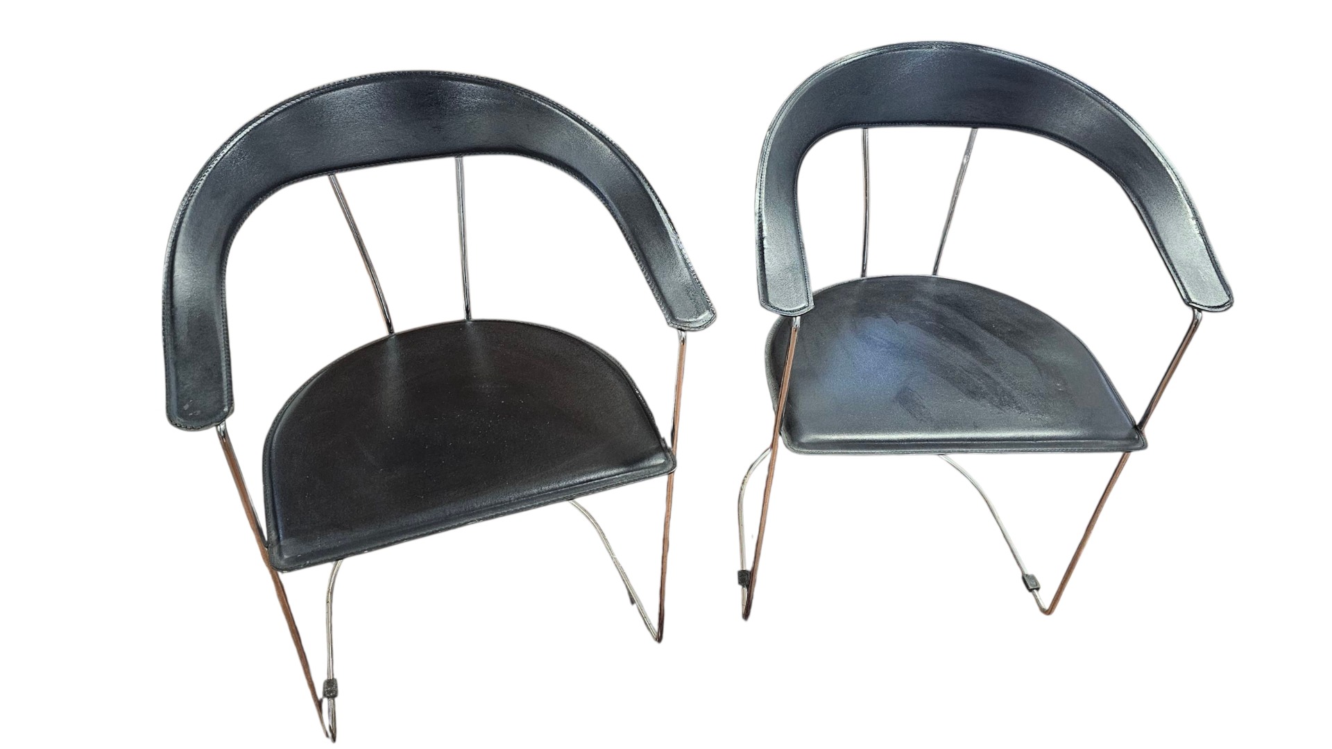Pairs of 1970s armchairs, with curved metal structures. Seats and backrest in black leather. Dimensions: fifty by fifty, height seventy-eight.