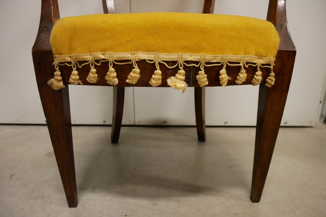 COD. 2687 Antique armchair, early 1800s, with armrests Antique Directoire walnut armchair with armrests. Northern Italy “Veneto” model with a curved shape. Curved solid walnut back with veneered parts. In original patina, UNRESTORED, good condition Upholstered seat with yellow fabric,...