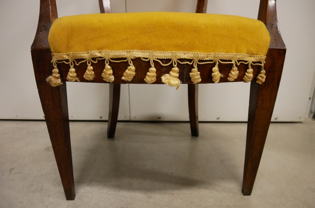 Antique Directoire walnut armchair with armrests.
