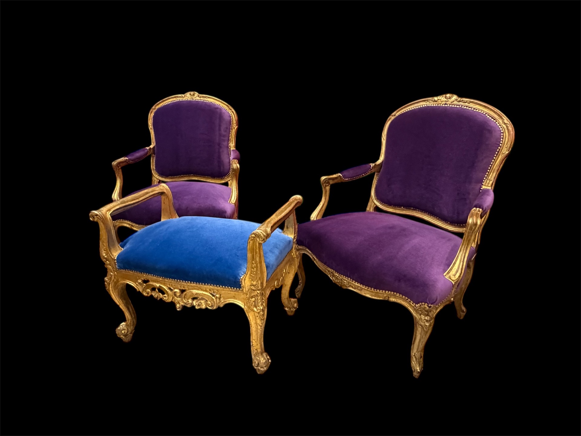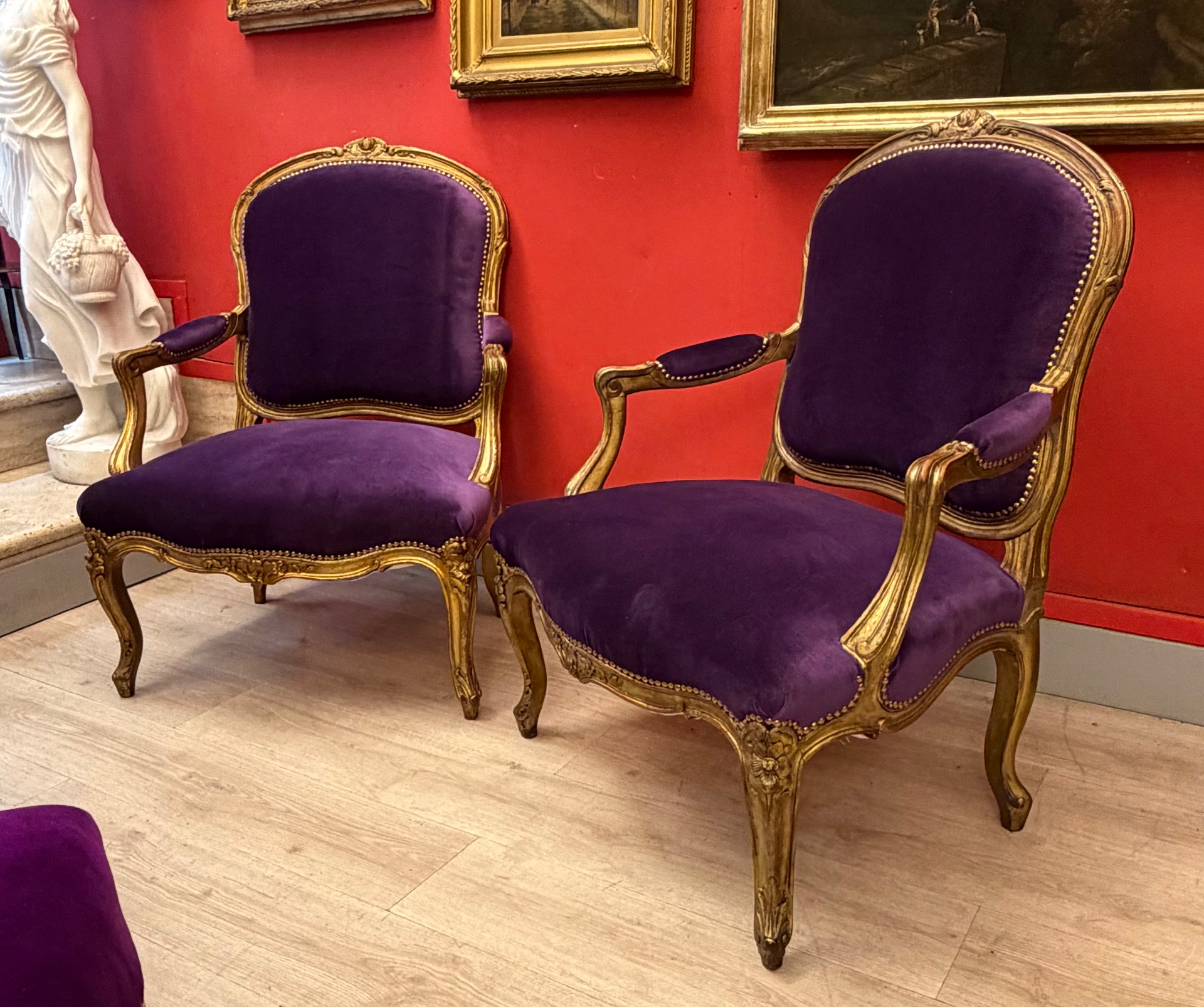 Coppia di poltrone in legno intagliato e dorato , stile Luigi XV con tappezzeria in velluto viola in perfette condizioni