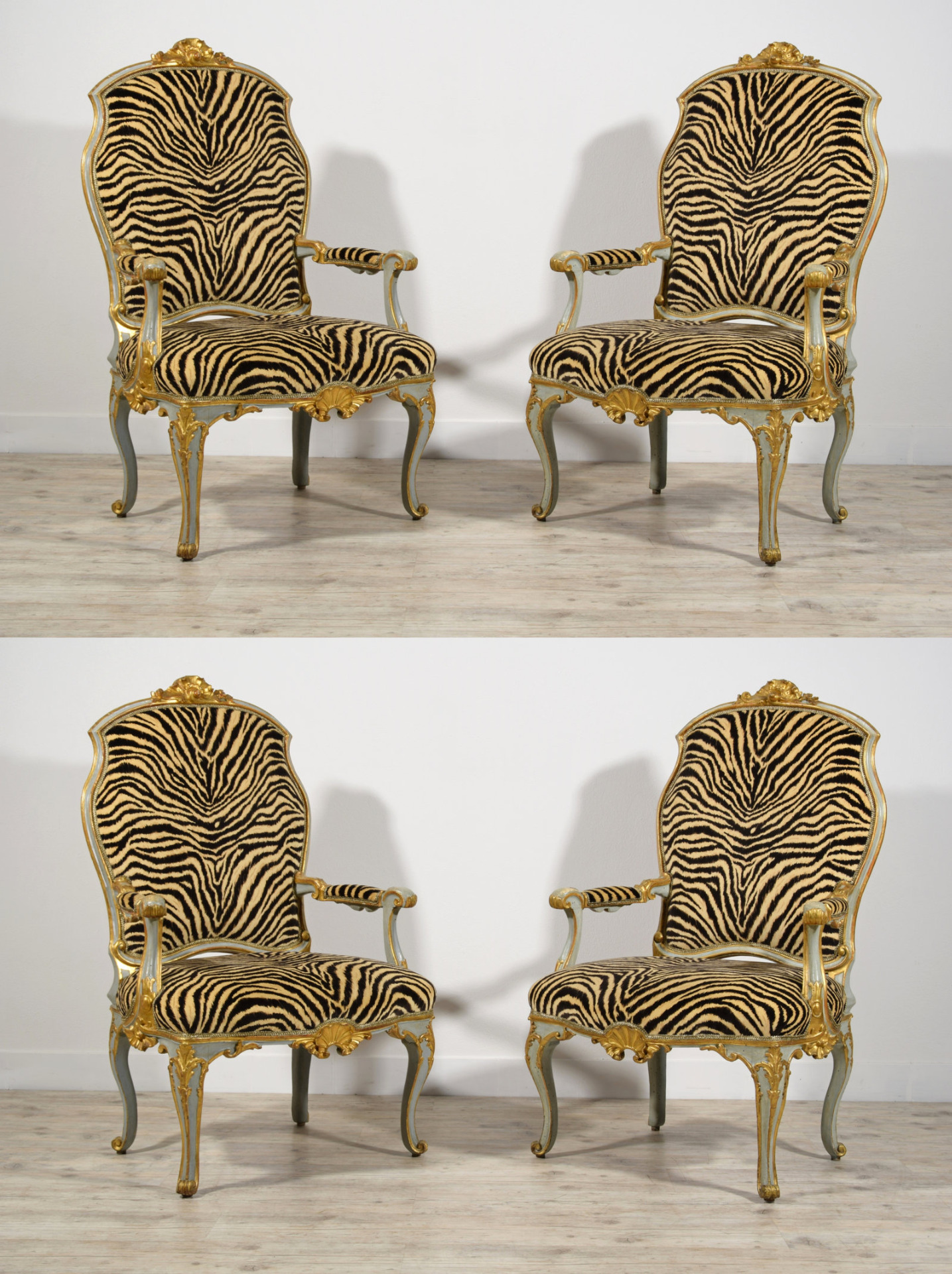 These refined four armchairs were made in the first half of the 18th century in central Italy. The structure, with a very wide seat, is made of gilded and lacquered wood in shades of light blue, finely carved with rocaille motifs characteristic of the Louis XV era. The carvings create phytomorphic elements in low relief of great plasticity and elegance. The backrest, with a quadrangular shape with a wavy and shaped profile, is crowned by a carved wooden element with volutes and fan-shaped foliate elements. The armrests are decorated with small volutes and vegetal motifs and end with a curl sculpture decorated with acanthus leaves that connects to the seat with a slightly curvilinear element. The band under the seat is richly decorated with rocaille motifs in the center and connecting to the armrests. The arched and wavy legs are decorated with vegetal motifs and end with a curled foot.