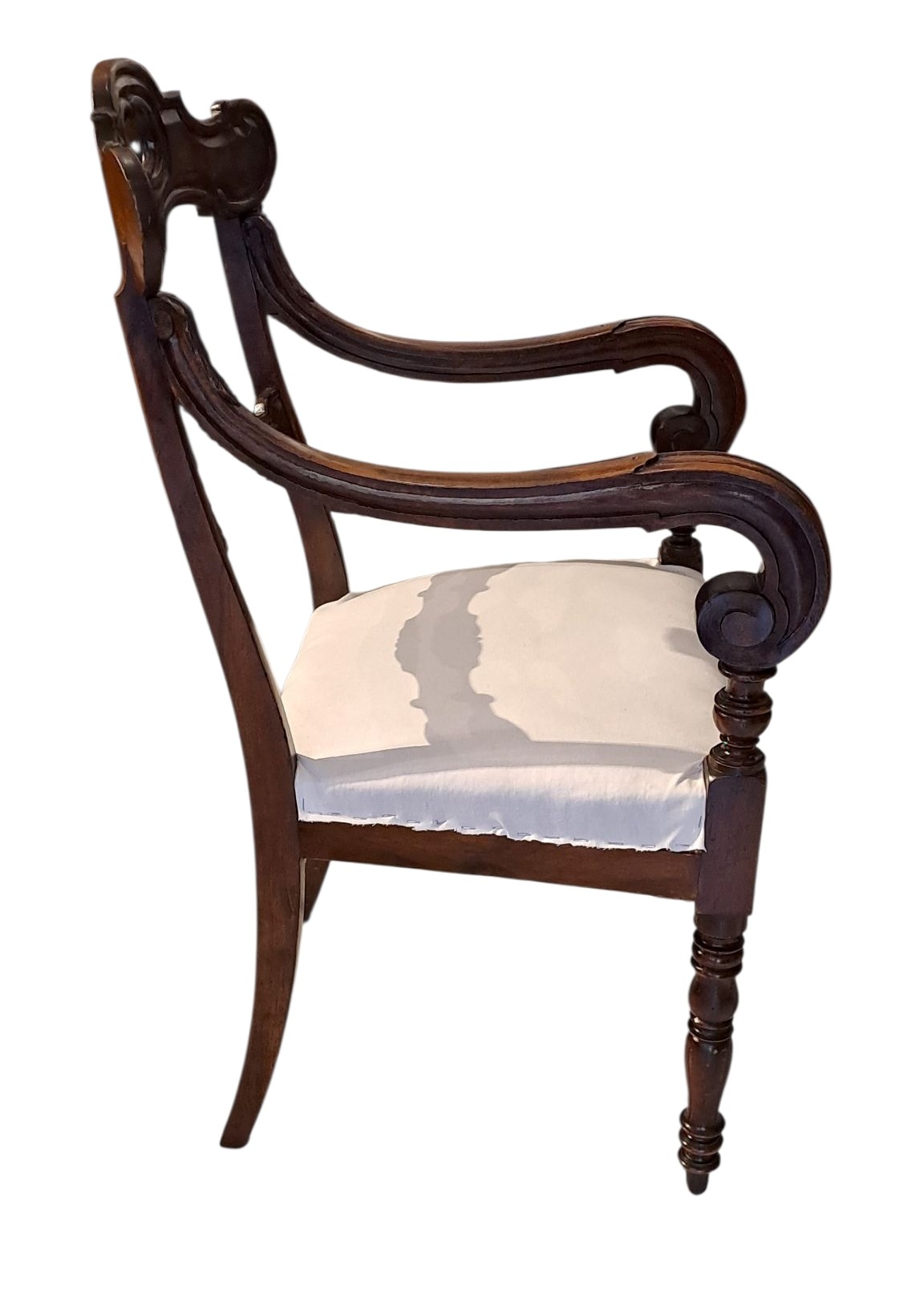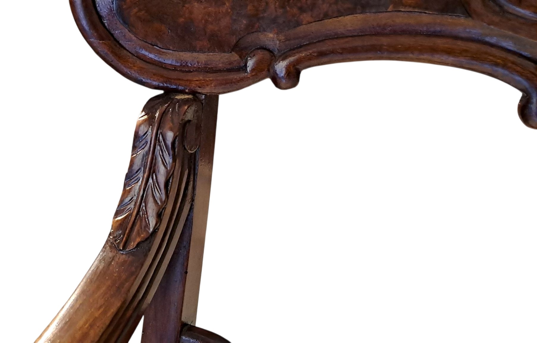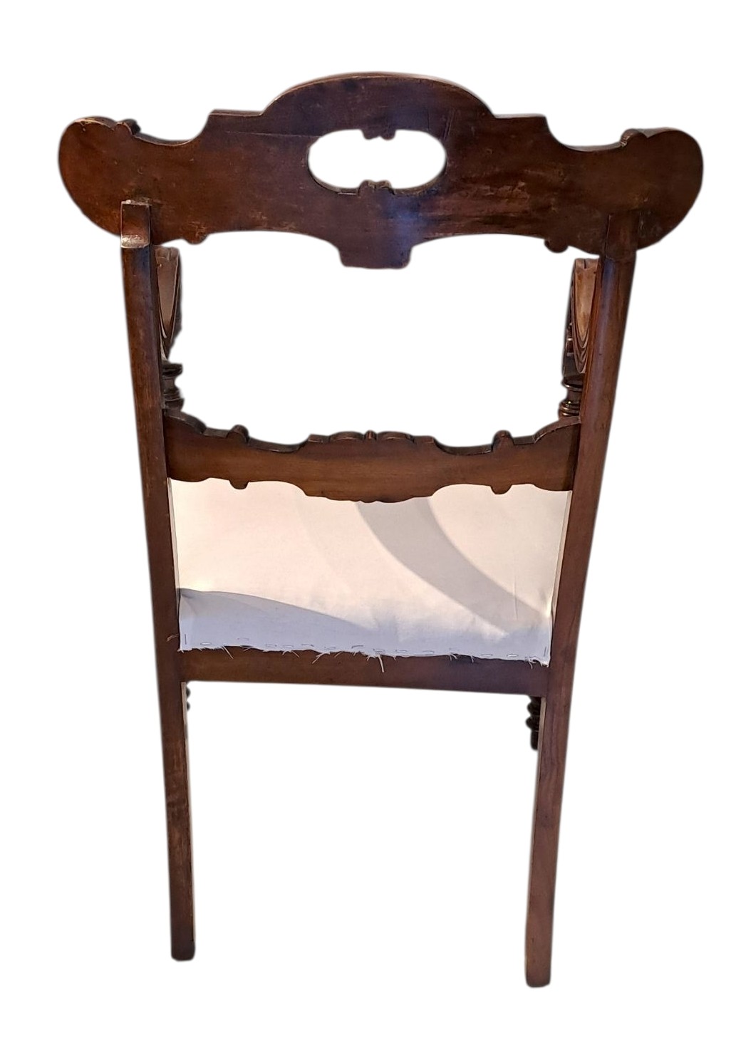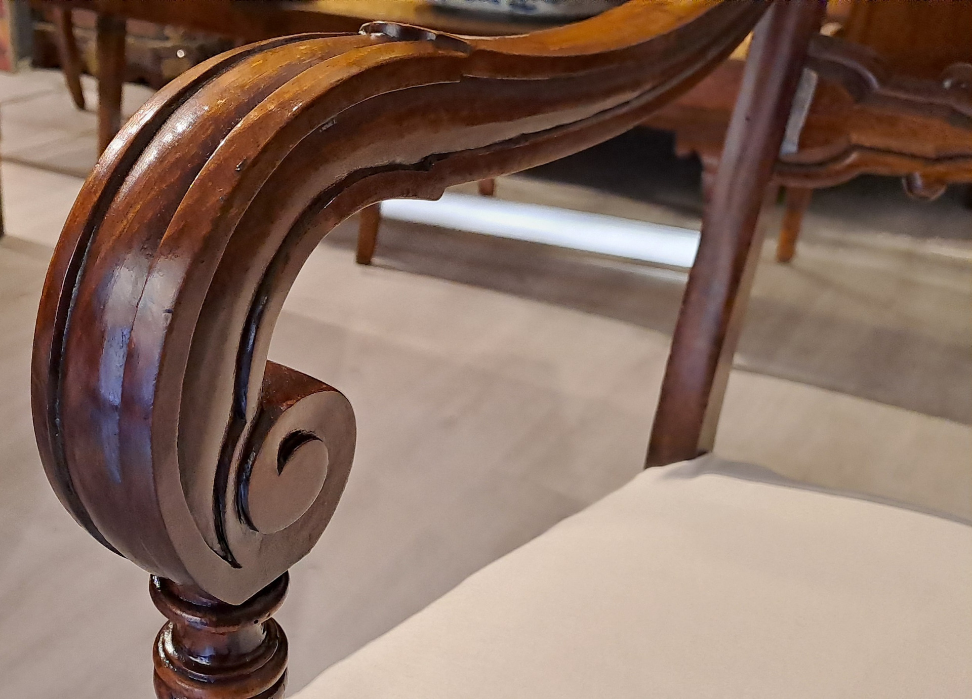 Design: The armchairs have an elegant line, with carved and openwork backs, scrolled armrests and turned front legs. The rear legs are saber-shaped. The carving is rich and well cared for, a typical element of this style.