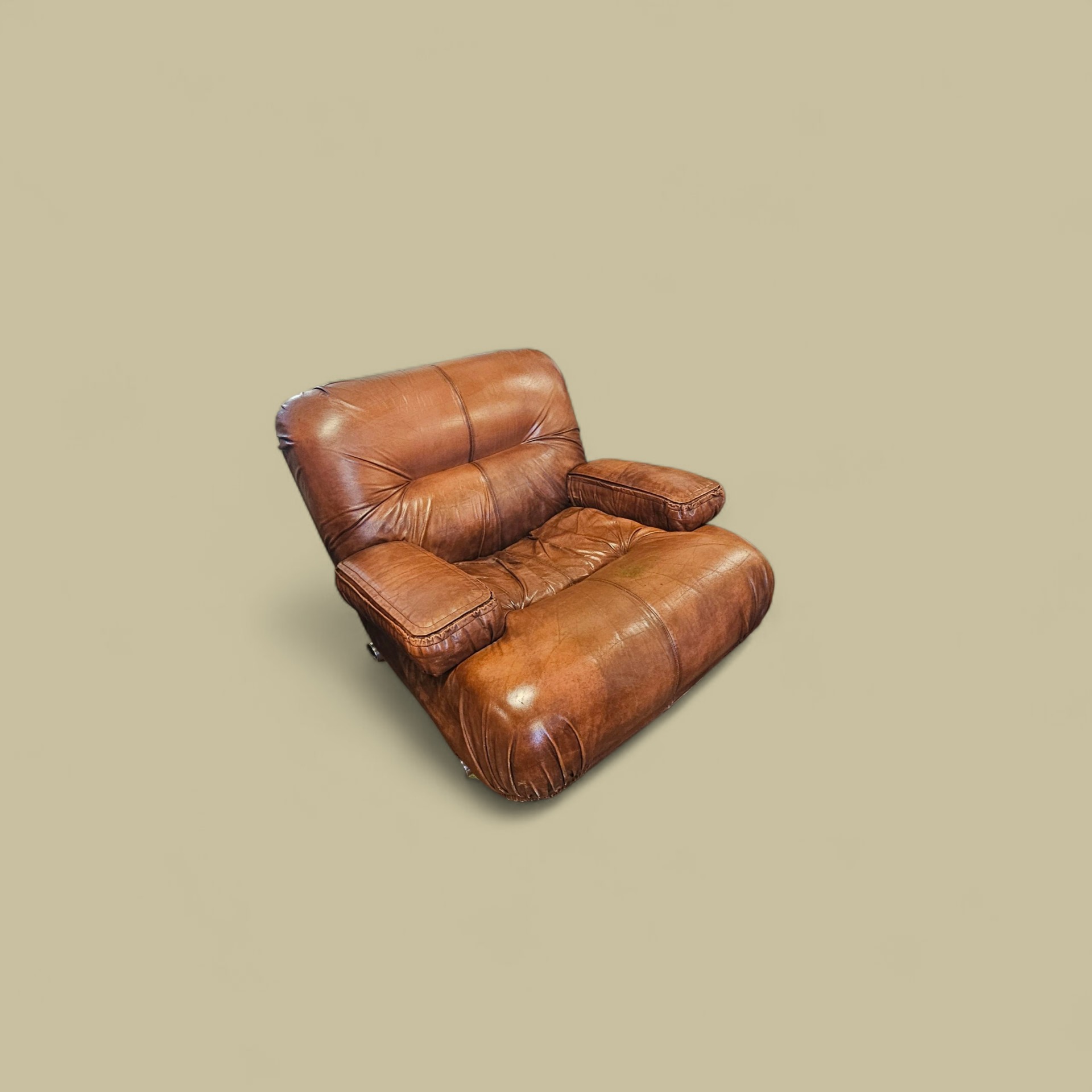 Beautiful Giuseppe Munari armchair. In cognac-colored leather from the 70s. Measures ninety wide and one hundred deep.