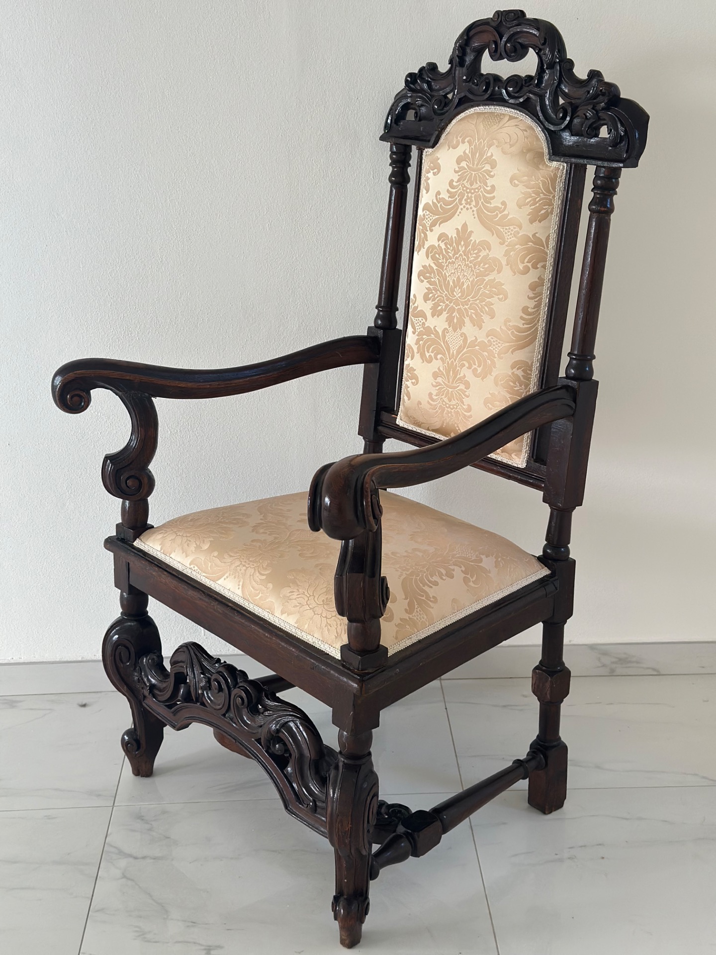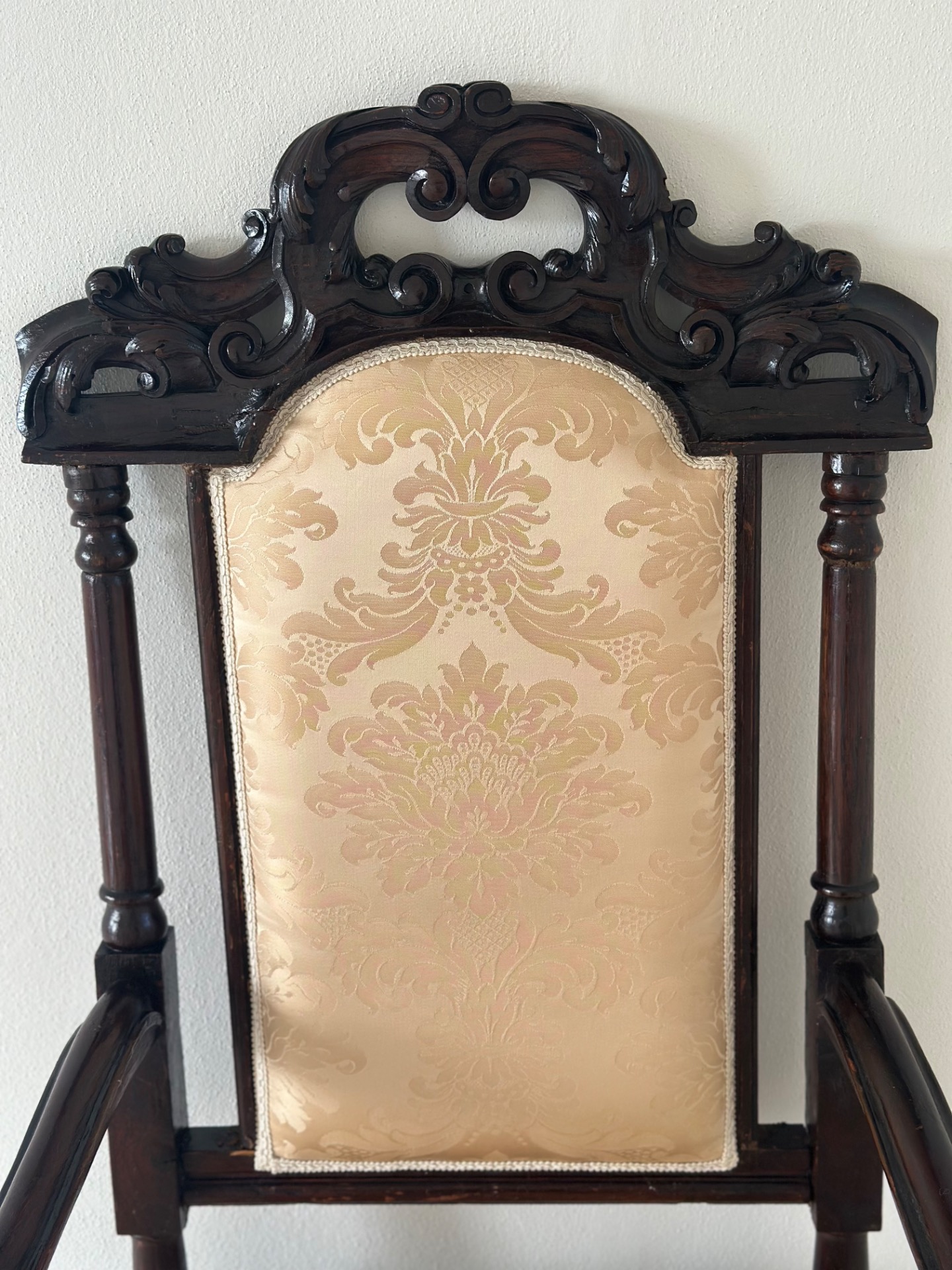 Louis XV walnut armchair from the Bologna area of Emilia, dating back to the first half of the 18th century, with four turned legs connected by a shaped crossbar with a carved central decorative motif, curved volute armrests resting on turned supports, a straight back with two lateral columns and a shaped cymatium with a carved motif at the center, seat and central part of the backrest upholstered and covered with floral patterned damask.