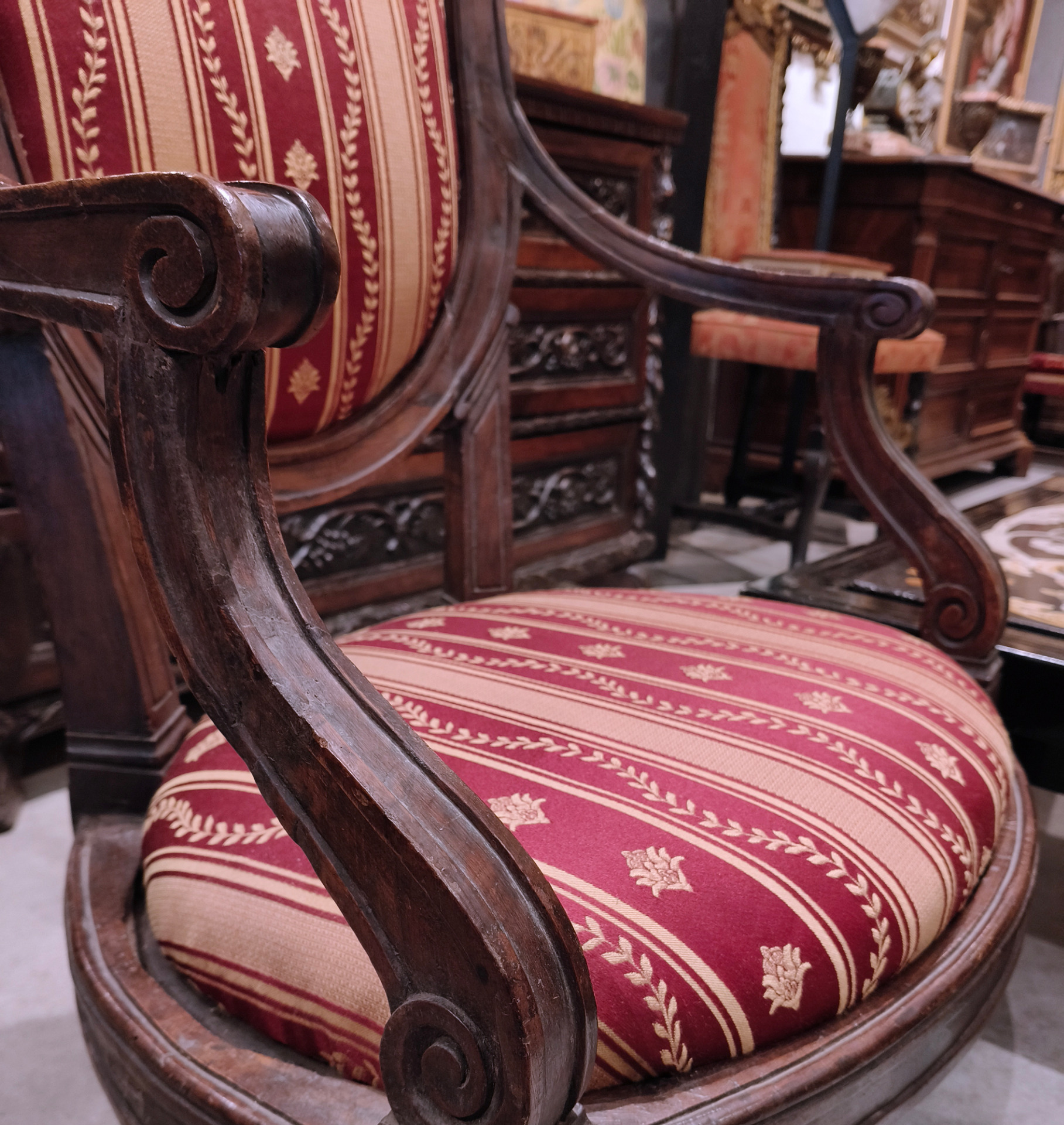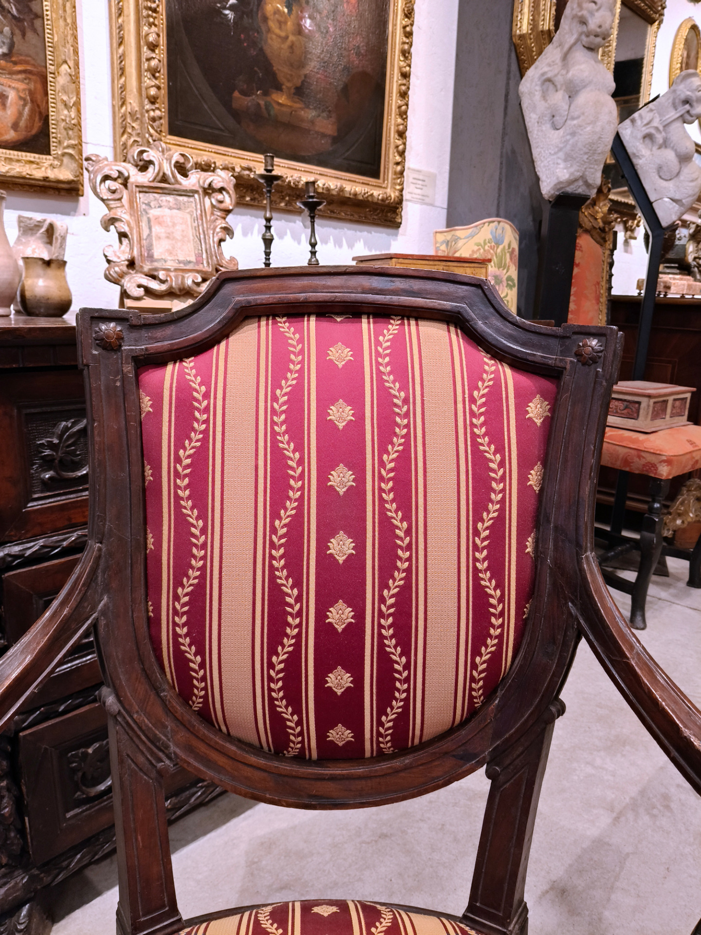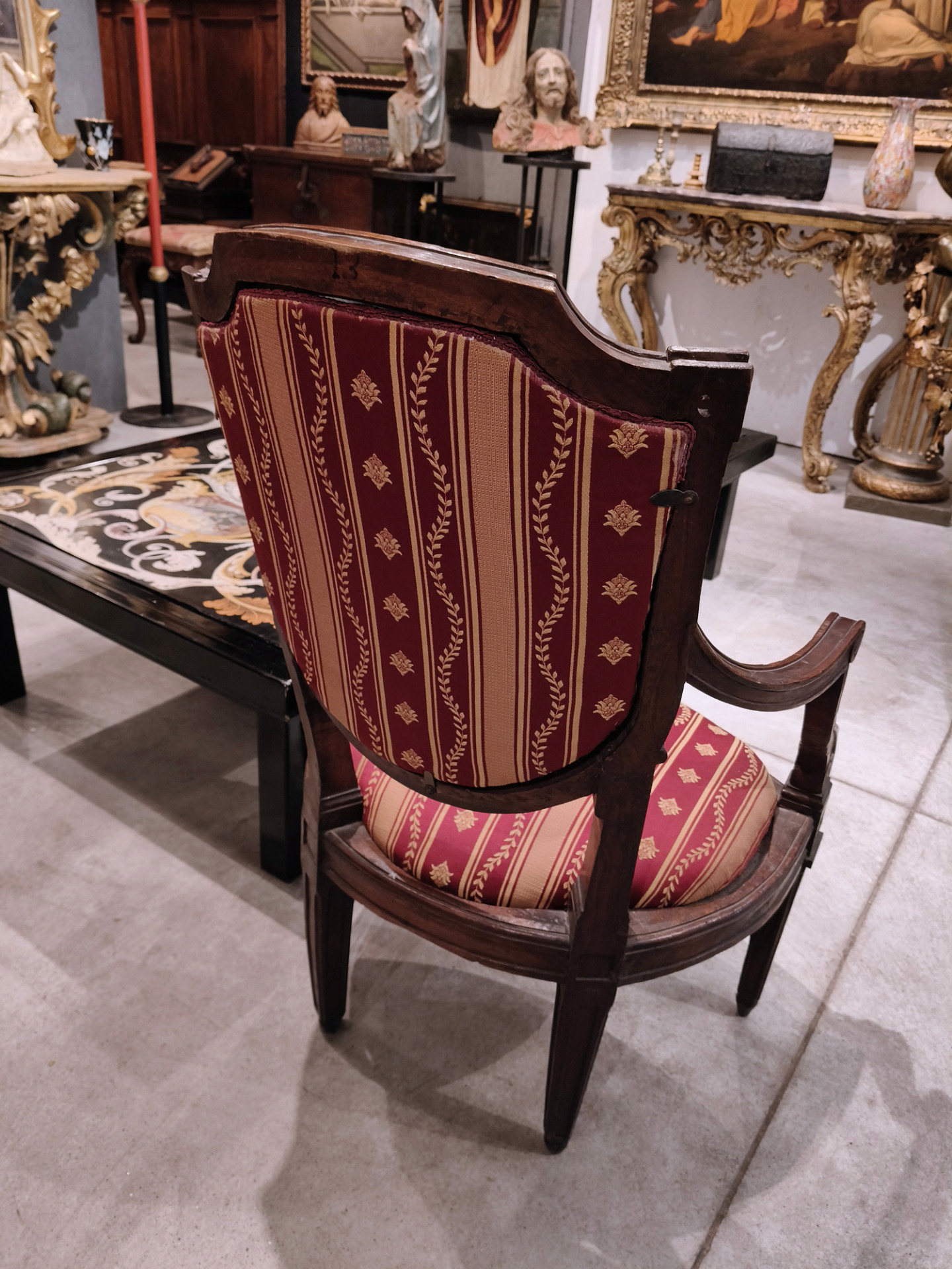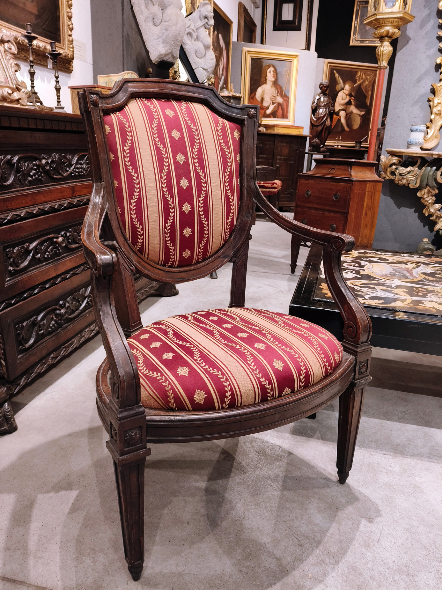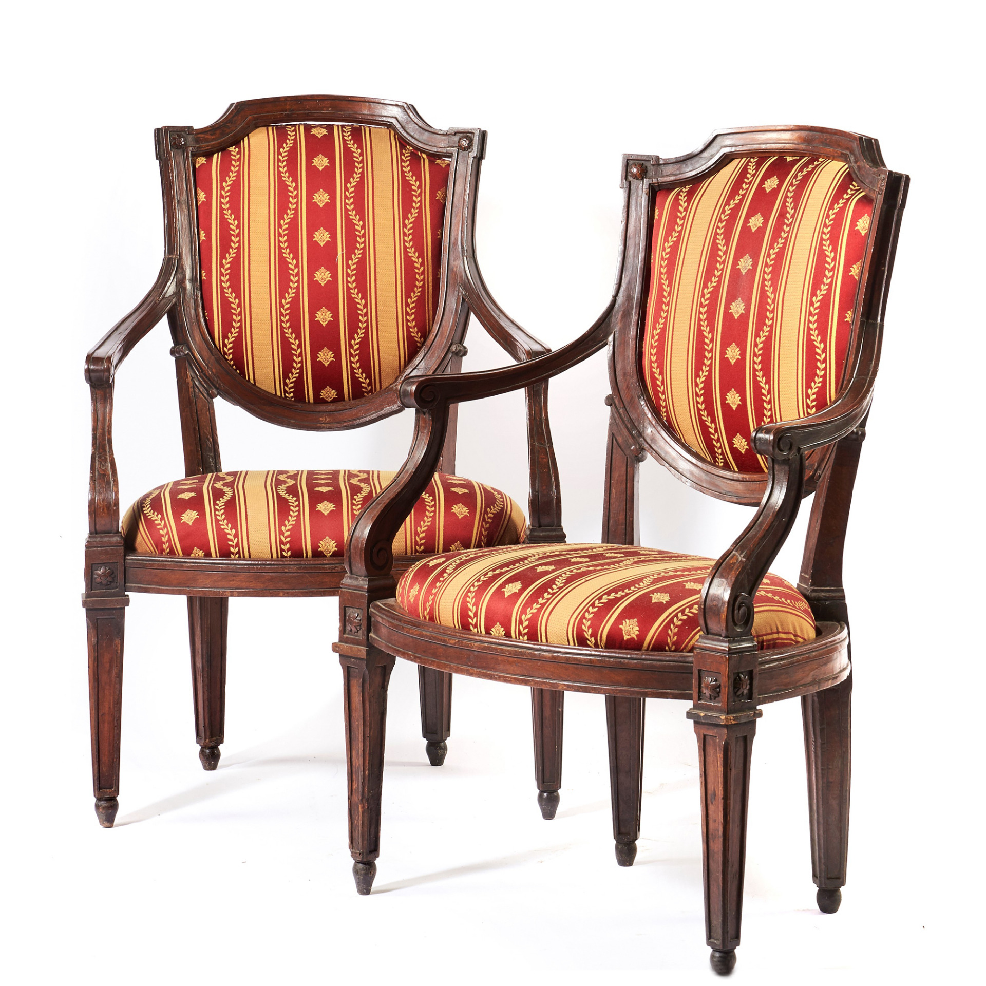 Pair of elegant walnut armchairs, truncated pyramid legs, shield back, upholstered in fabric (excellent condition).