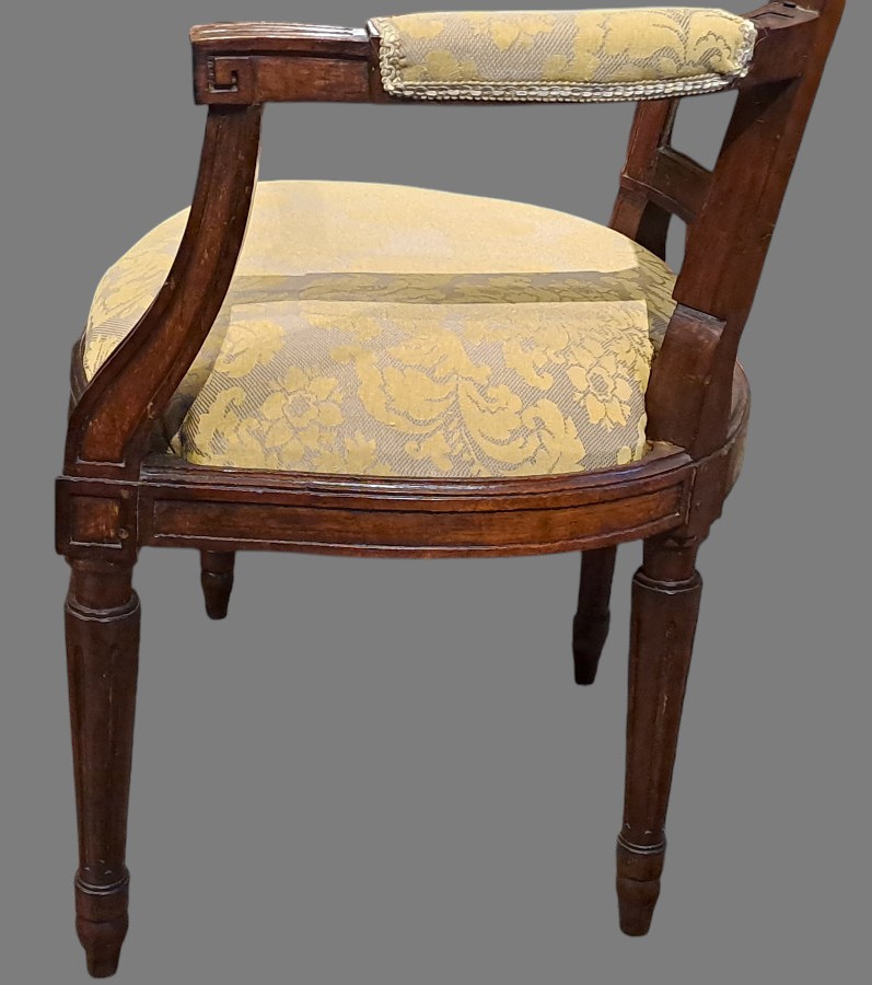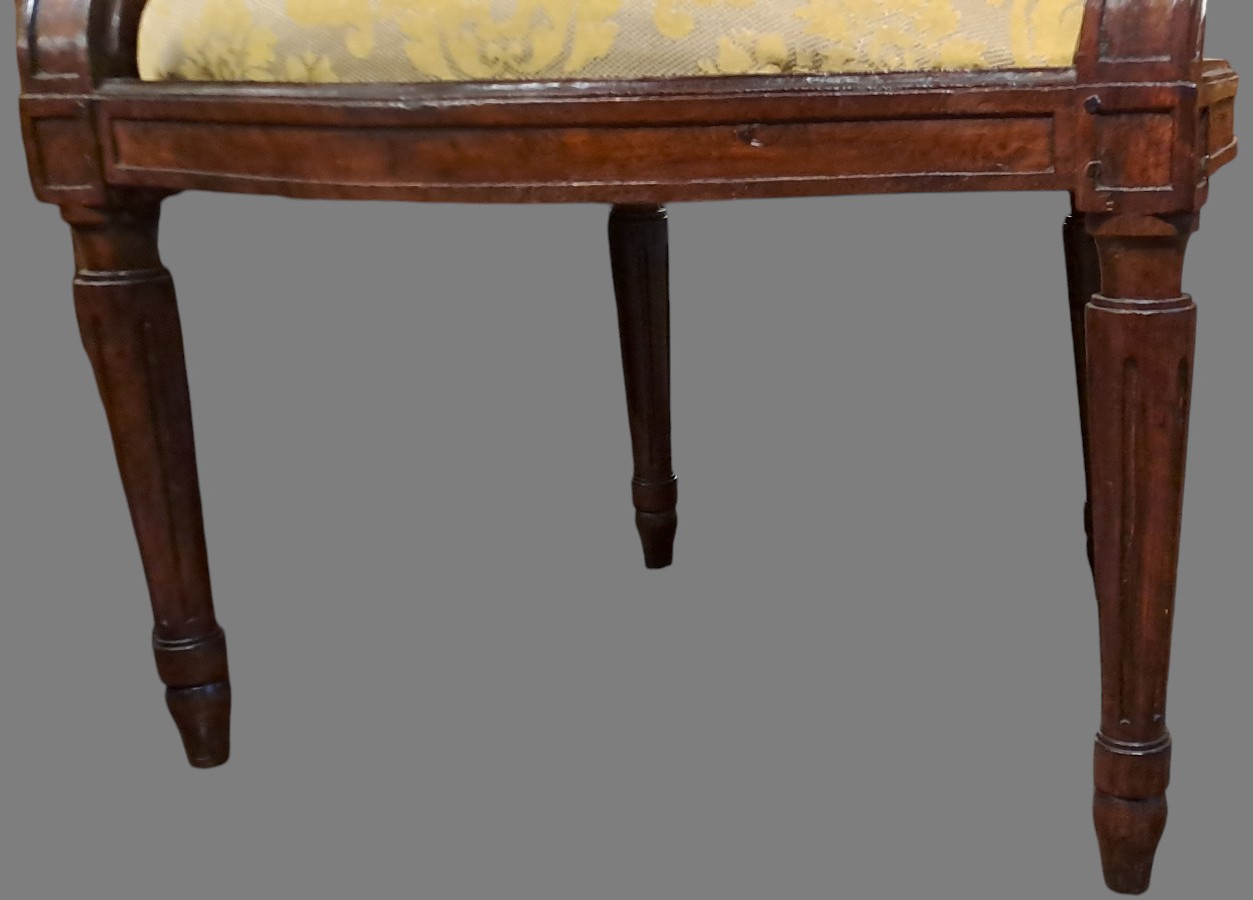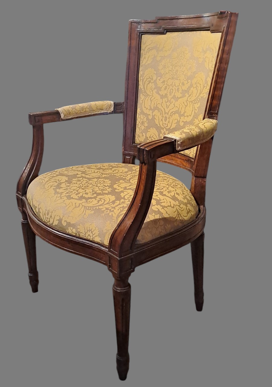 Pair of armchairs in walnut wood. The chairs feature a wide seat with a rounded front, slightly everted armrests resting on moving uprights, and a wraparound backrest. The four legs are turned and fluted. From the Piedmont area, late 18th century. The dimensions are: width 66, depth 58, maximum height 97 cm. A regular certificate of authenticity with photo is issued. We ensure a response to your emails within 24 hoursREGISTERED IN THE REGISTER OF EXPERTS AND CTU AT THE COURT OF LA SPEZIA