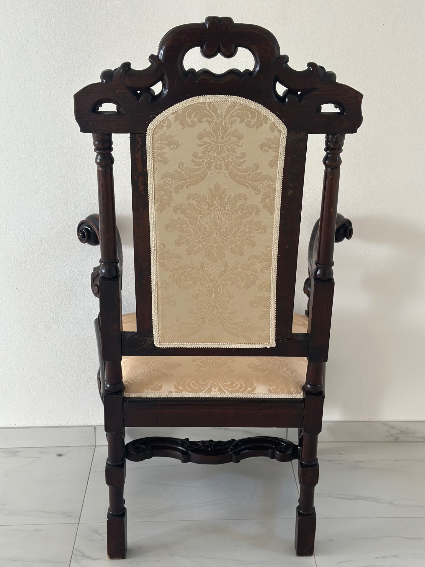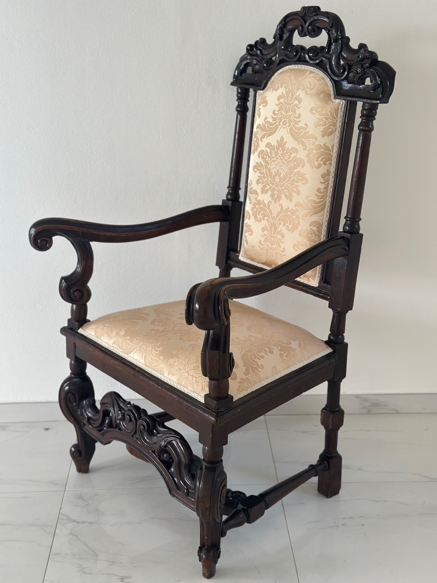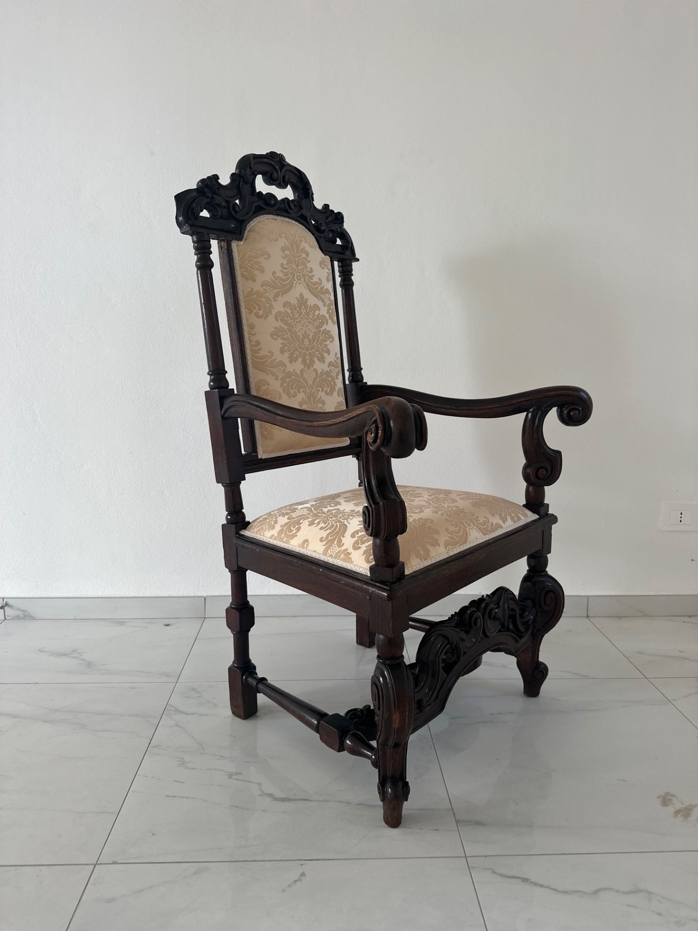 Poltrona in noce Luigi XV di area emiliana bolognese epoca prima metà del’700 con quattro gambe tornite collegate da traversa sagomata con motivo decorativo centrale intagliato , braccioli curvilinei a voluta poggianti su sostegni torniti schienale diritto con due colonnine laterali e cimasa sagomata con motivo intagliato al centro , seduta e parte centrale dello schienale imbottiti e rivestiti di damasco a motivi floreale